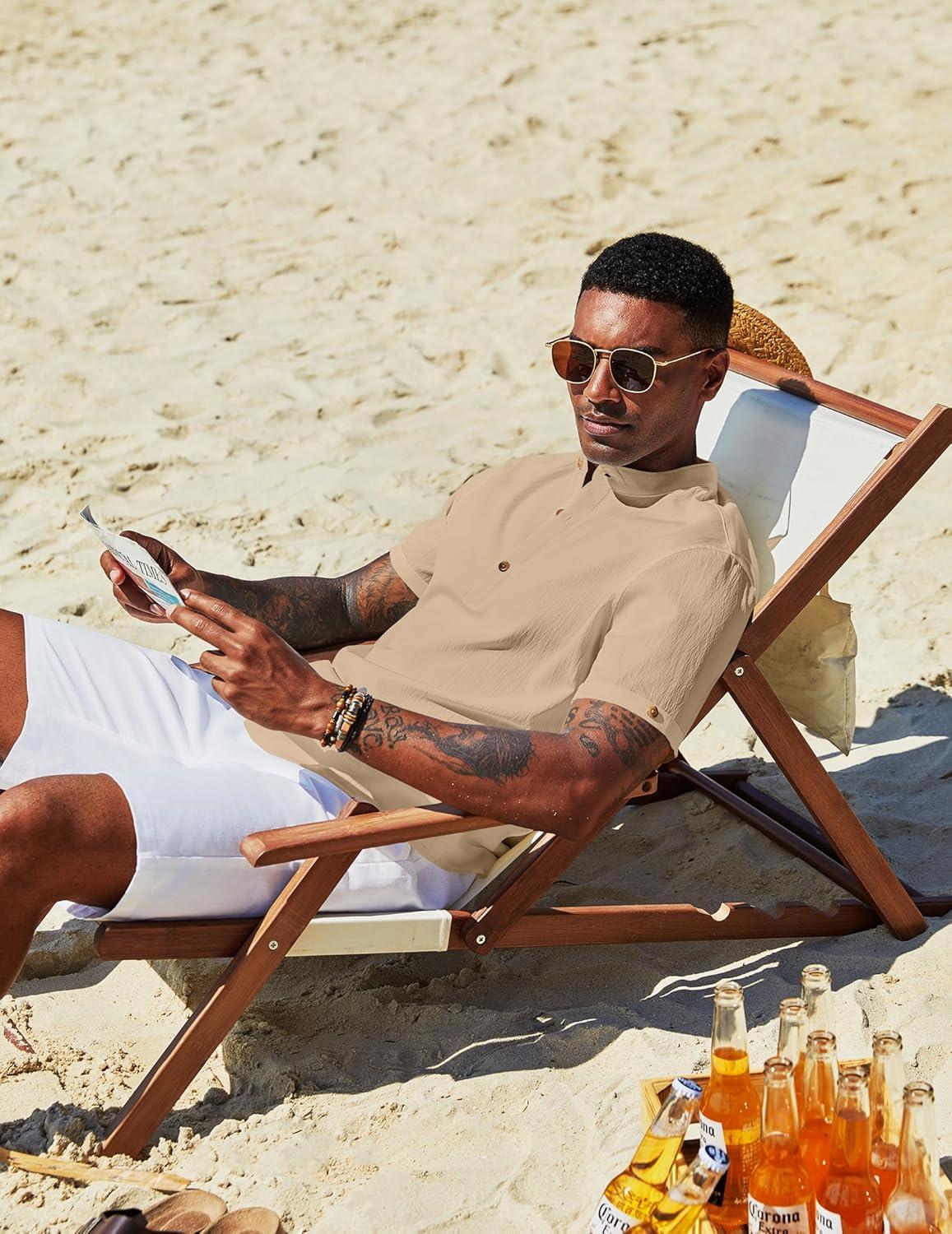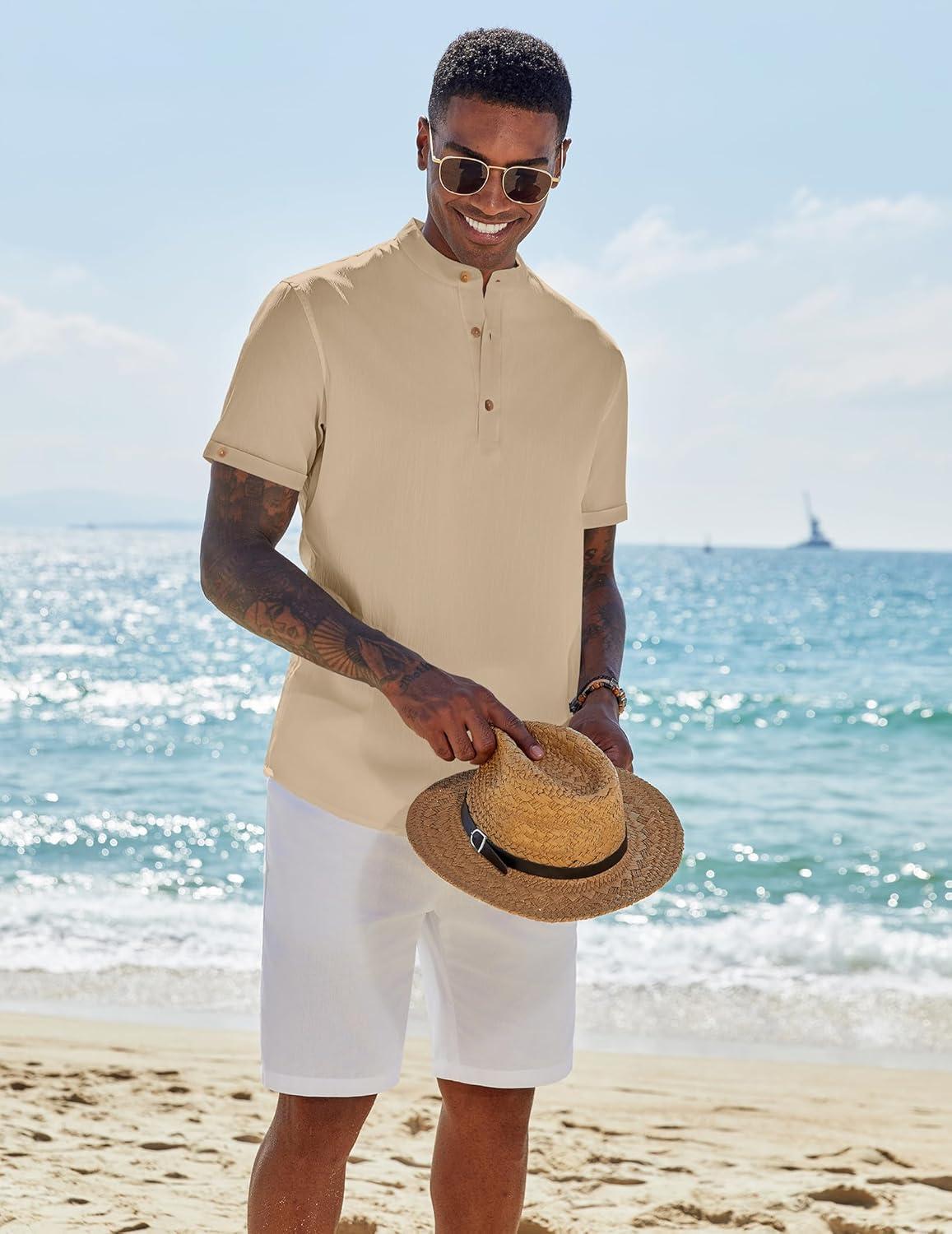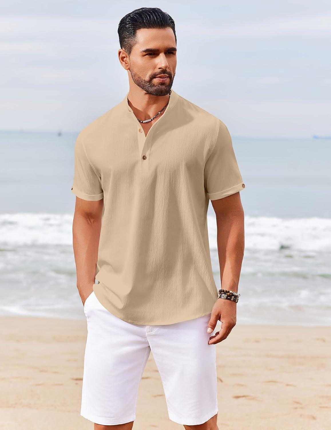 COOFANDY Men's Casual Henley Shirts Short Sleeve Summer Beach T-Shirts Banded Collar Henleys Button Tee Shirt(Khaki)