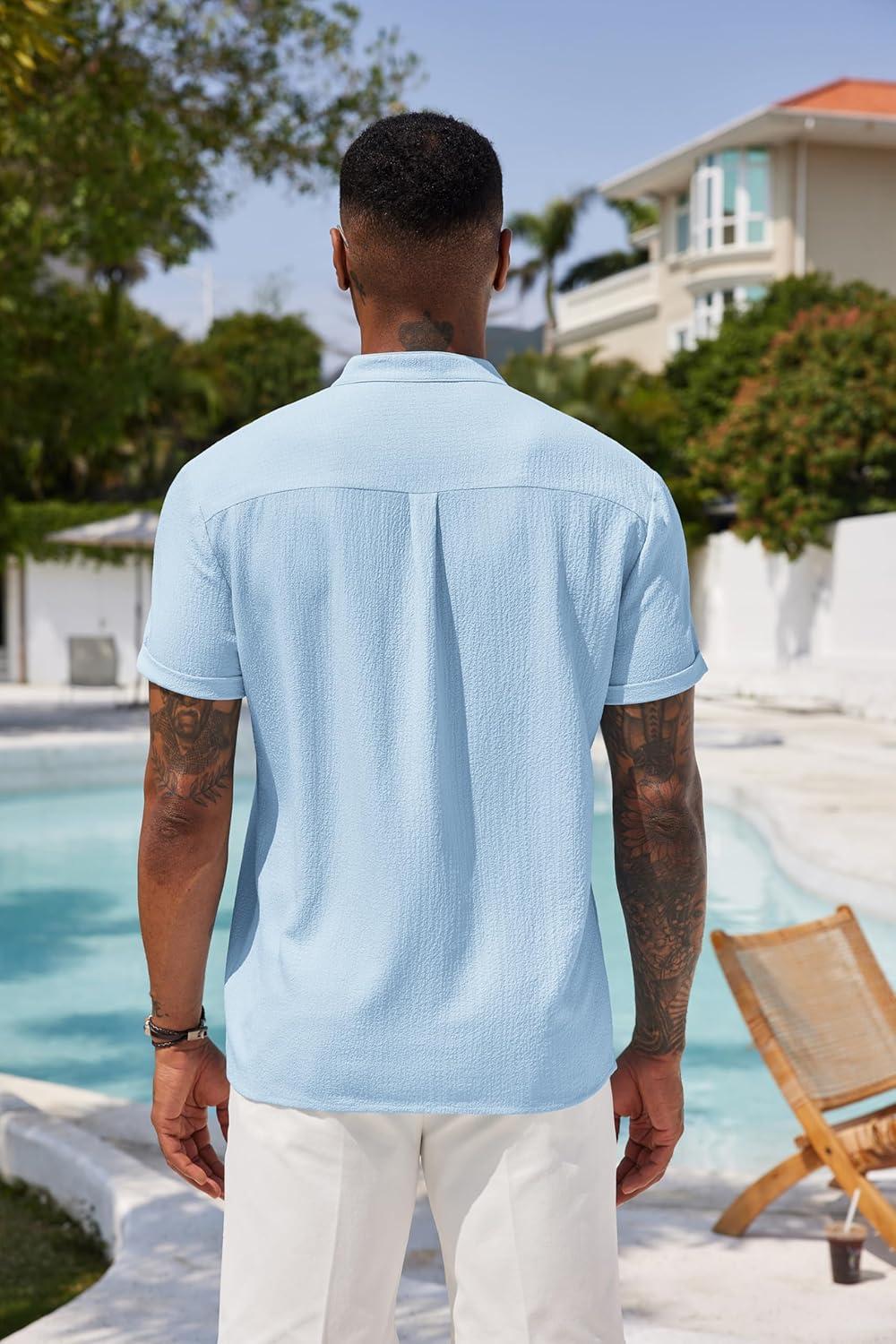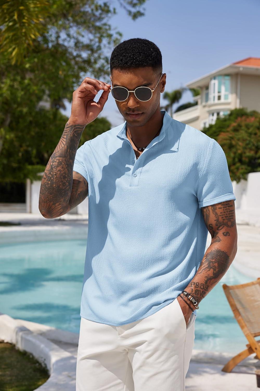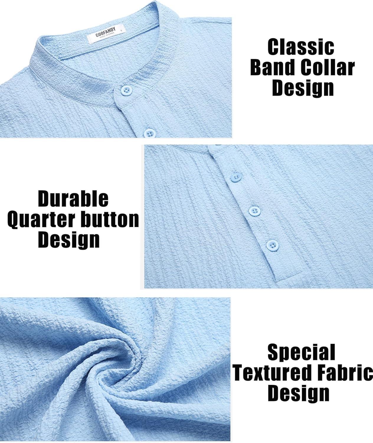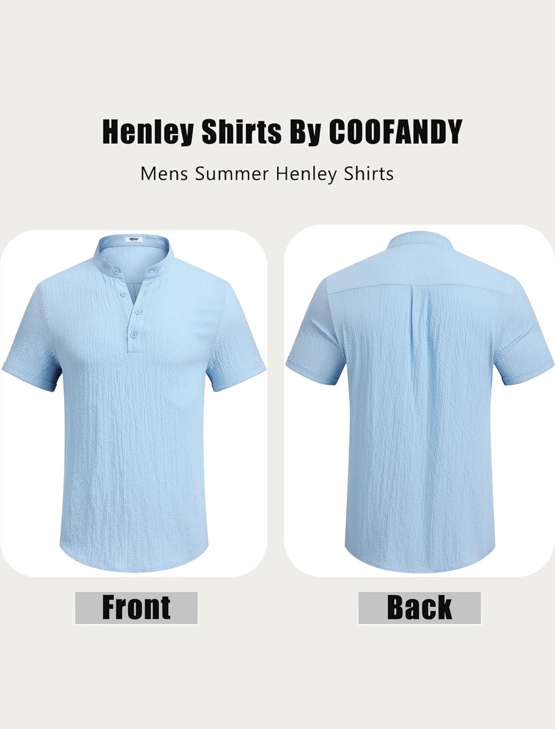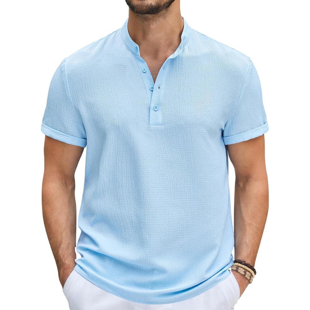 COOFANDY Men's Casual Henley Tee Shirt Band Collar Short Sleeve Summer Beach Hippie T Shirts(Clear Blue)