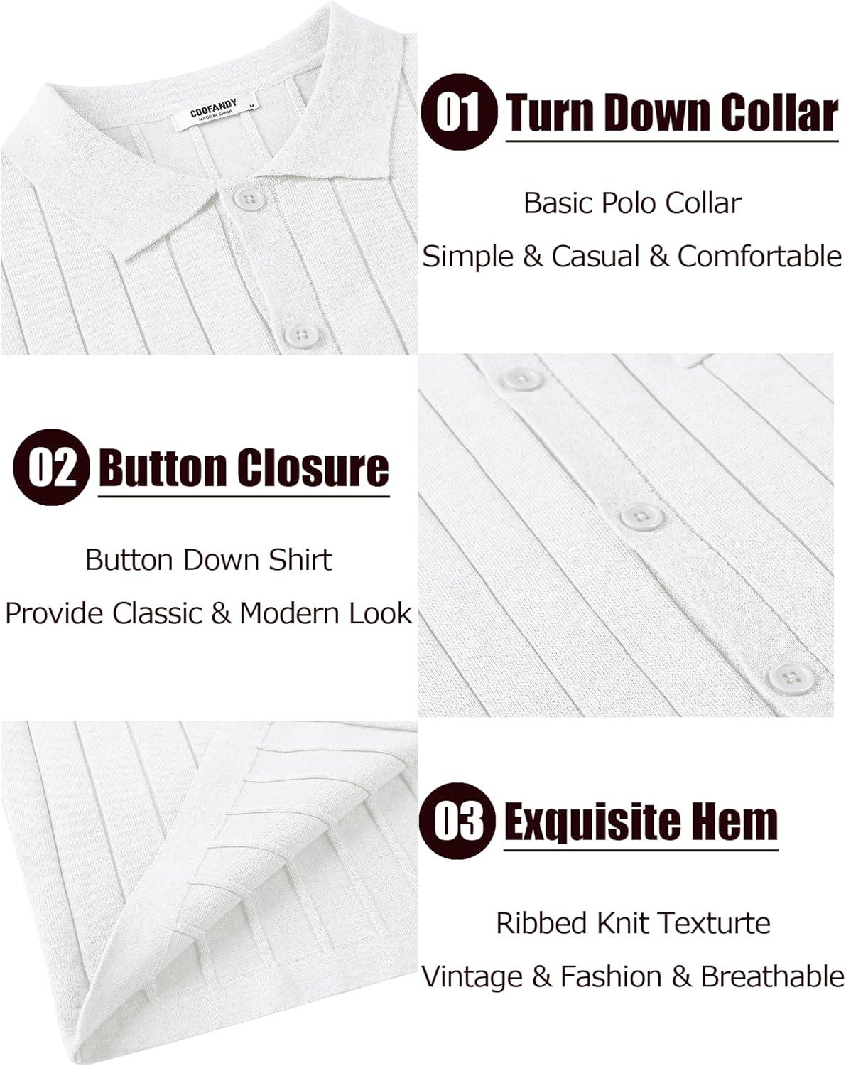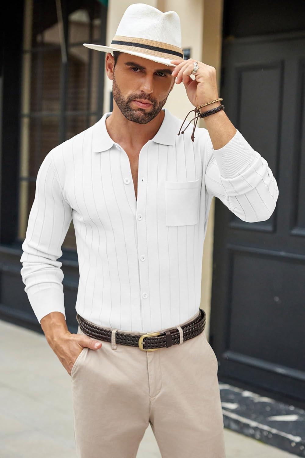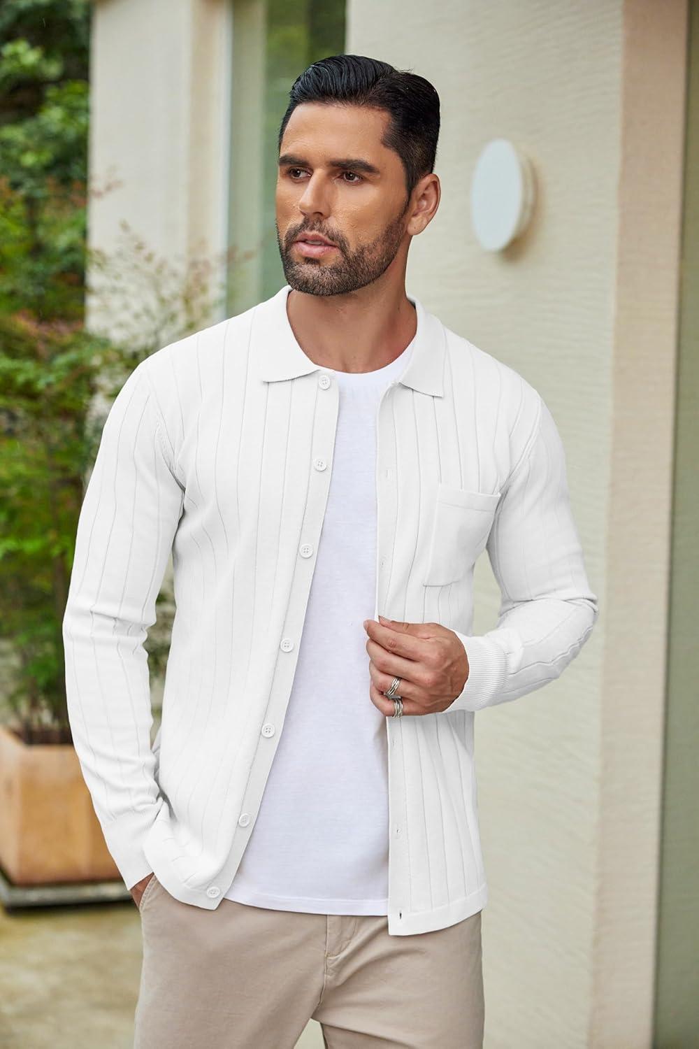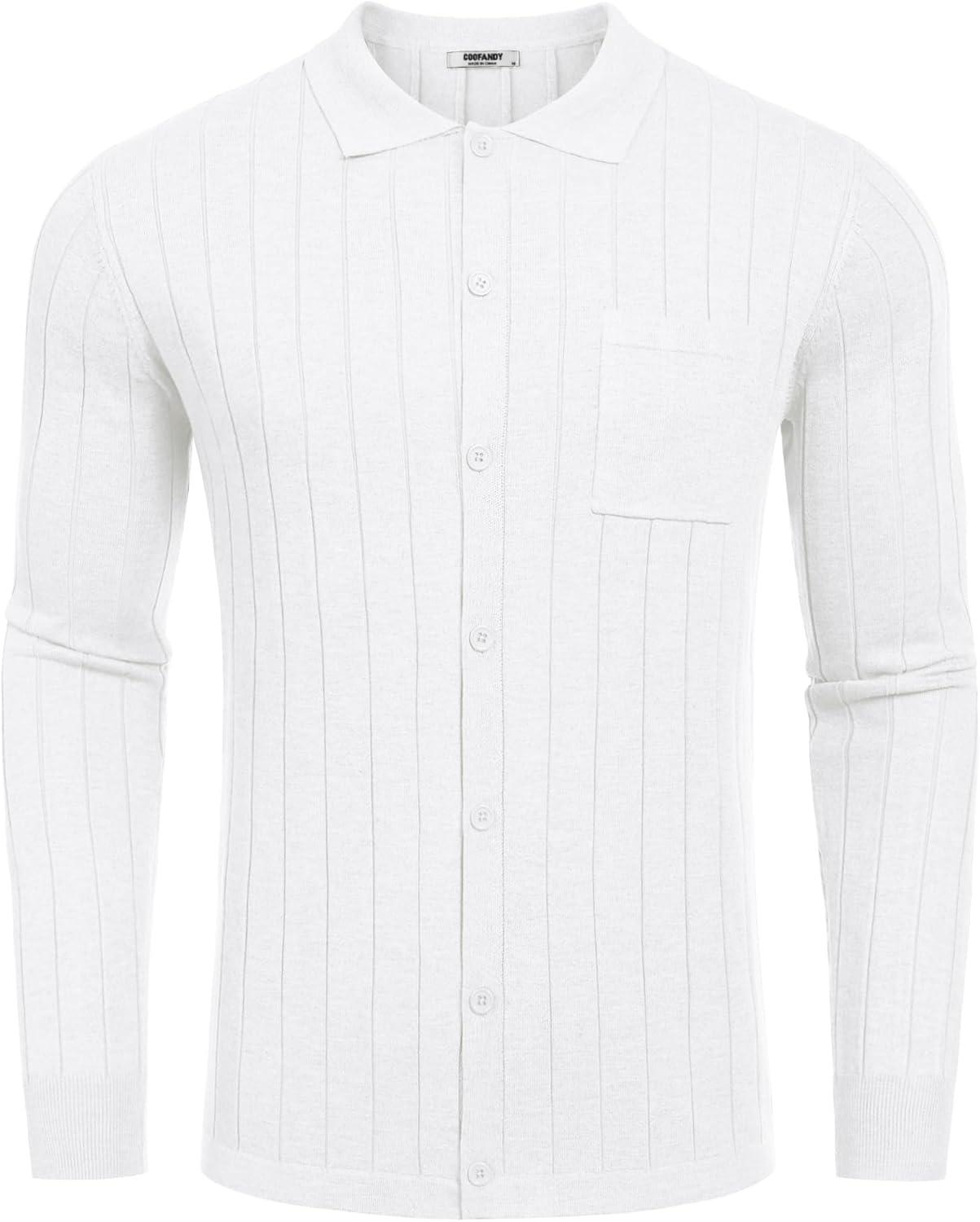 COOFANDY Men’s Casual Knit Polo Shirts Long Sleeve Button Down Sweater Polo Ribbed Cardigan Sweater with Pocket(All White)