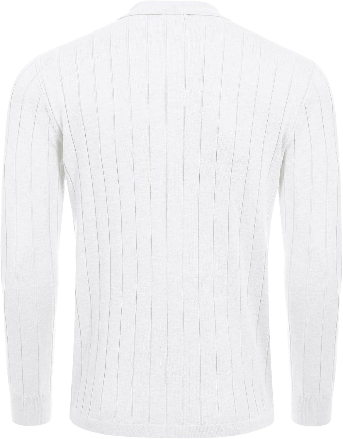 COOFANDY Men's Casual Knit Polo Shirts Long Sleeve Button Down Sweater Polo Ribbed Cardigan Sweater with Pocket(All White)