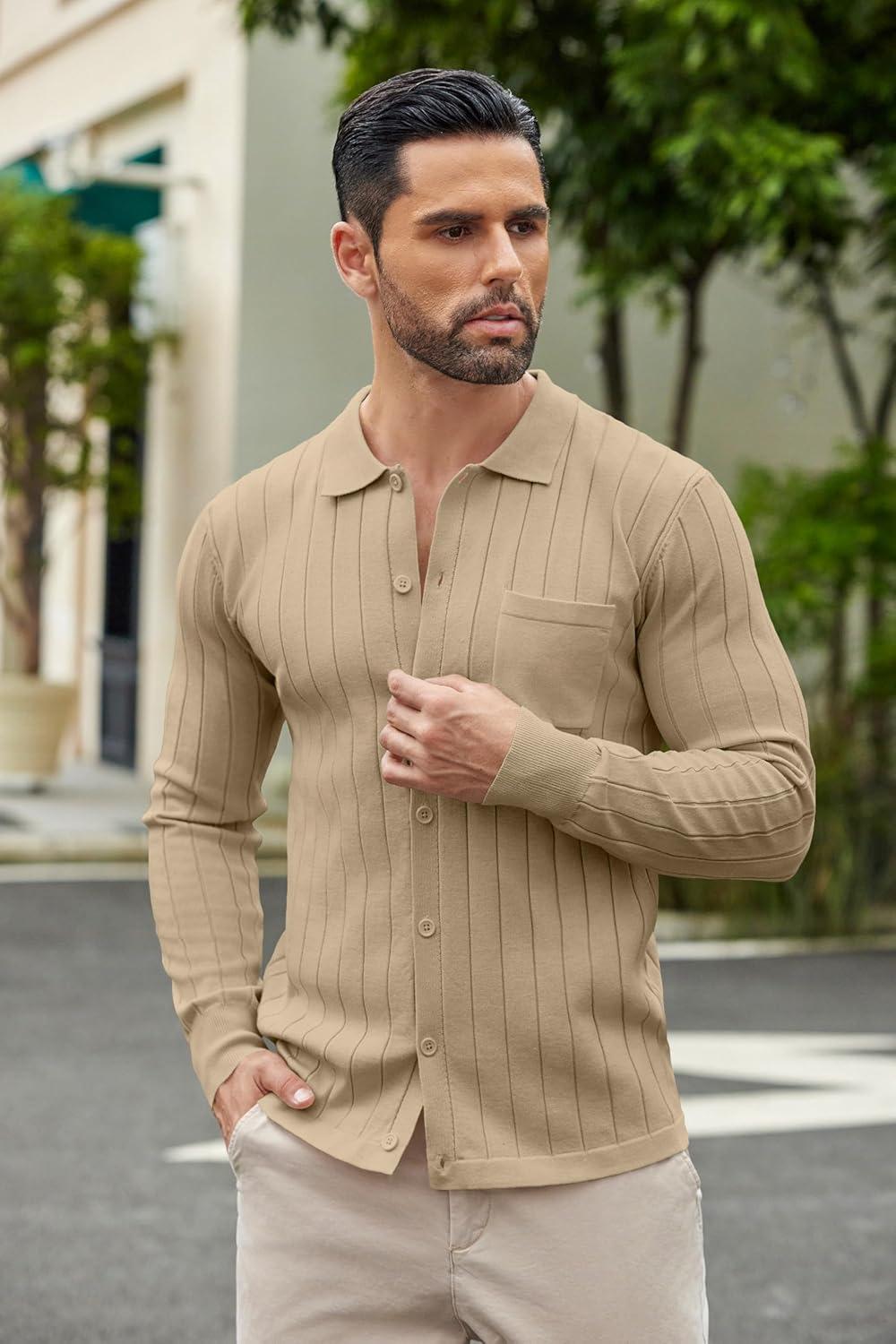 COOFANDY Men's Casual Knit Polo Shirts Long Sleeve Button Down Sweater Polo Ribbed Cardigan Sweater with Pocket(Light Khaki)