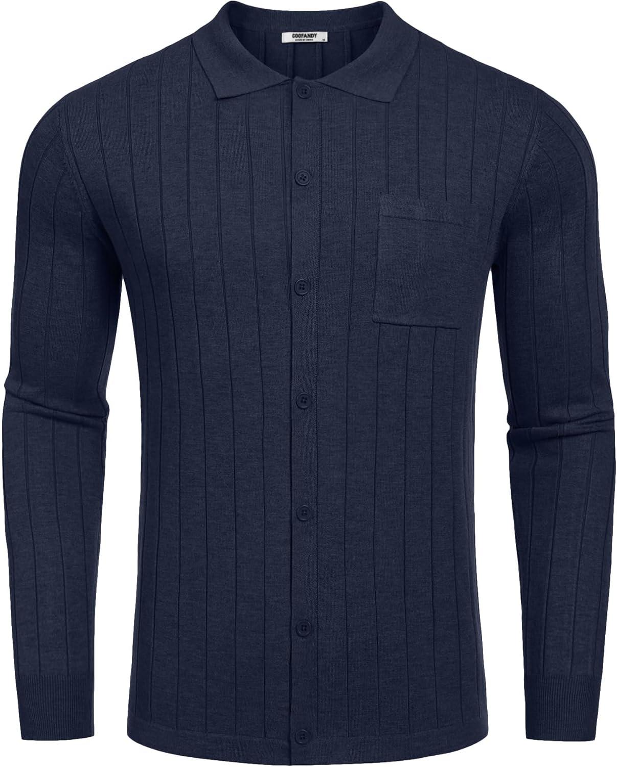 COOFANDY Men’s Casual Knit Polo Shirts Long Sleeve Button Down Sweater Polo Ribbed Cardigan Sweater with Pocket(Navy Blue)