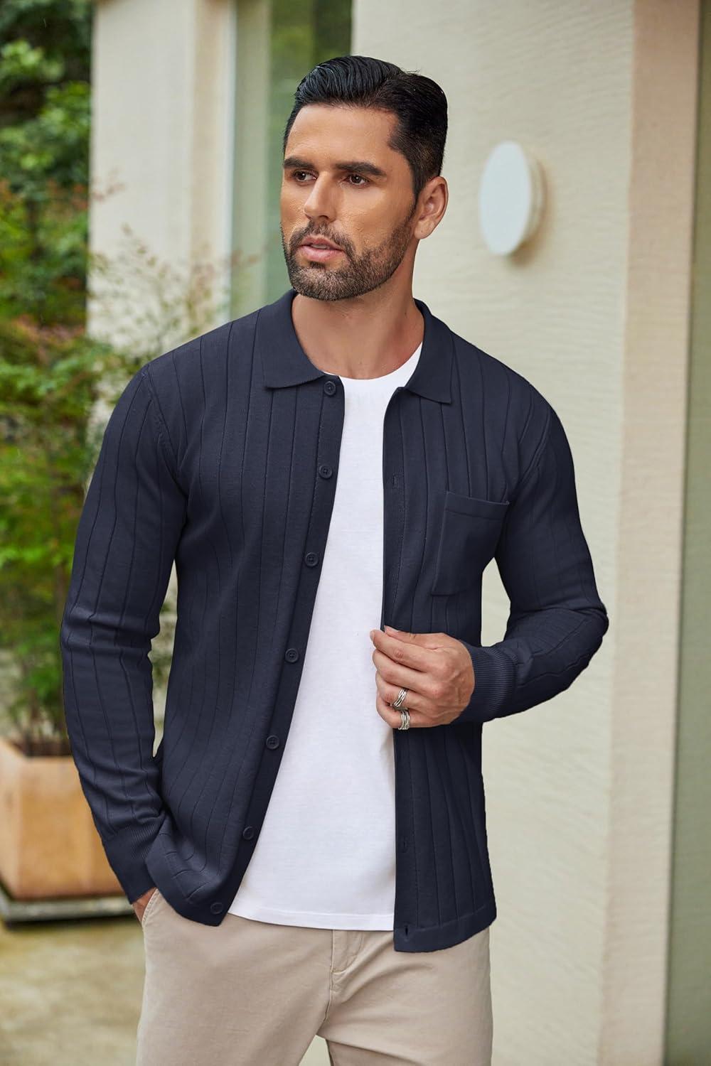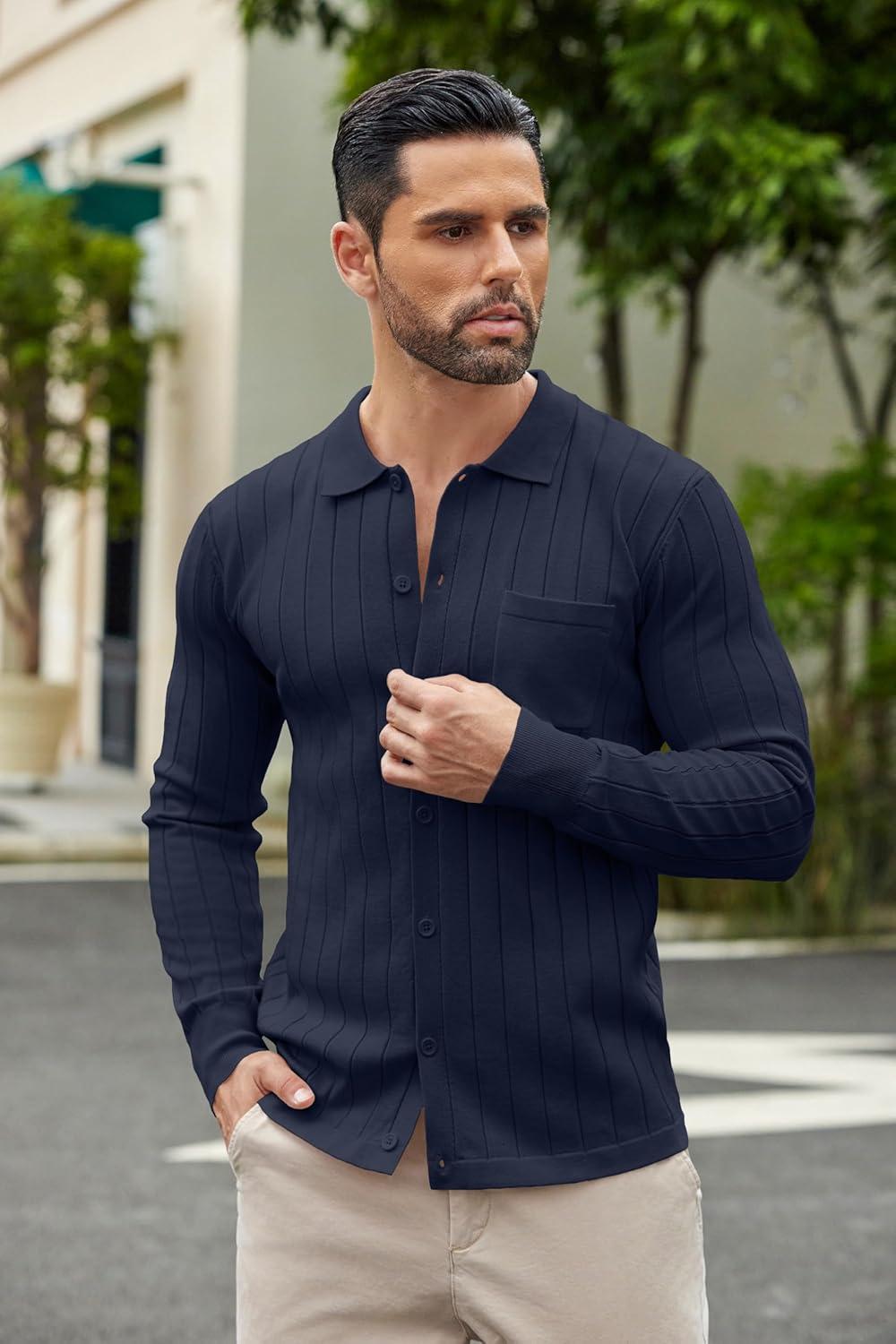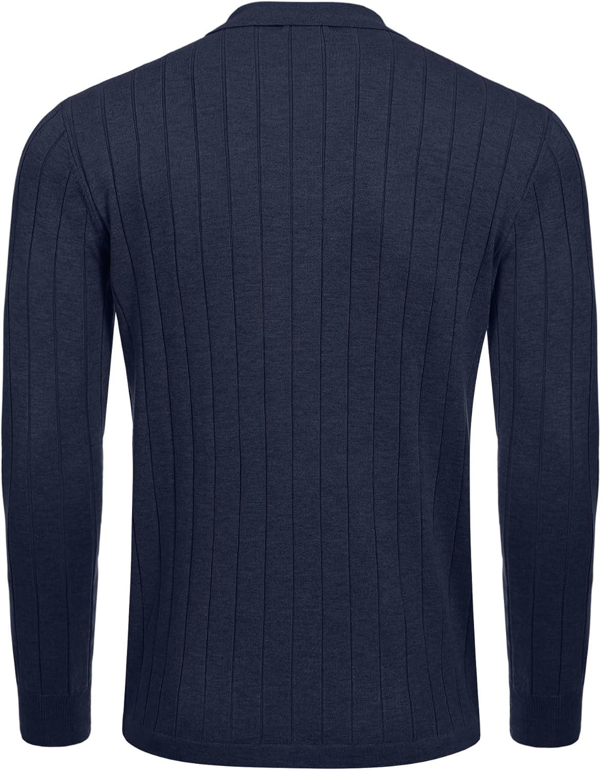 COOFANDY Men's Casual Knit Polo Shirts Long Sleeve Button Down Sweater Polo Ribbed Cardigan Sweater with Pocket(Navy Blue)