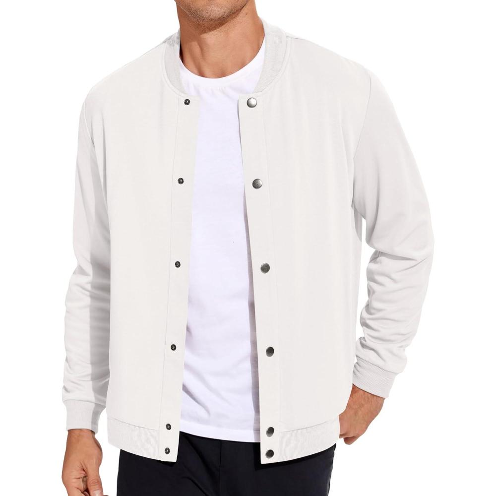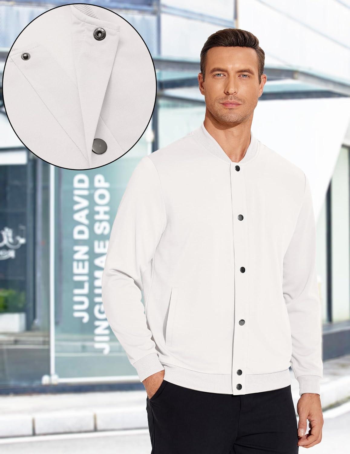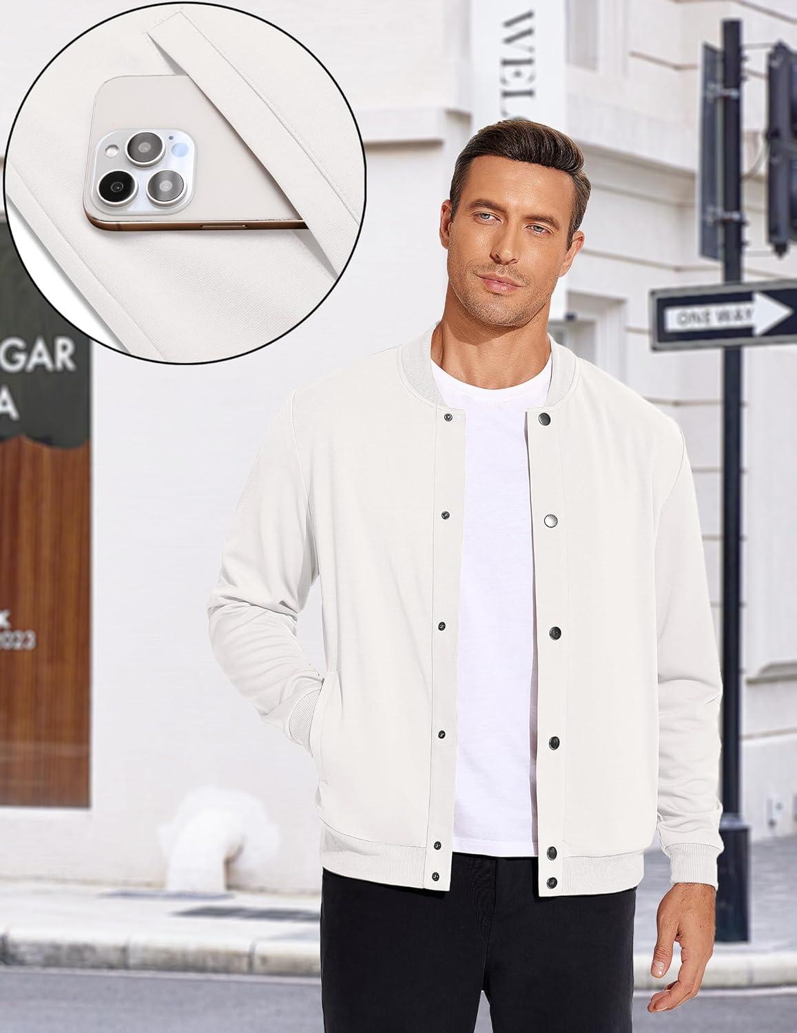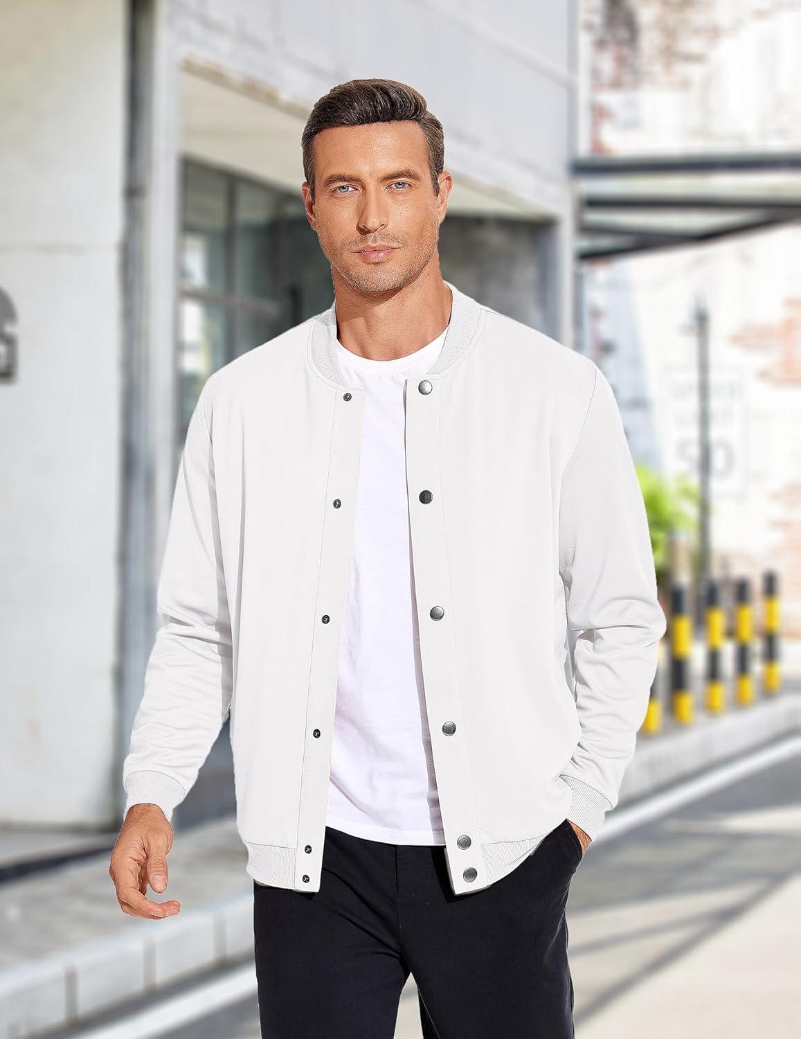 COOFANDY Men’s Casual Lightweight Jacket Baseball Letterman Snap Button Jacket(White)