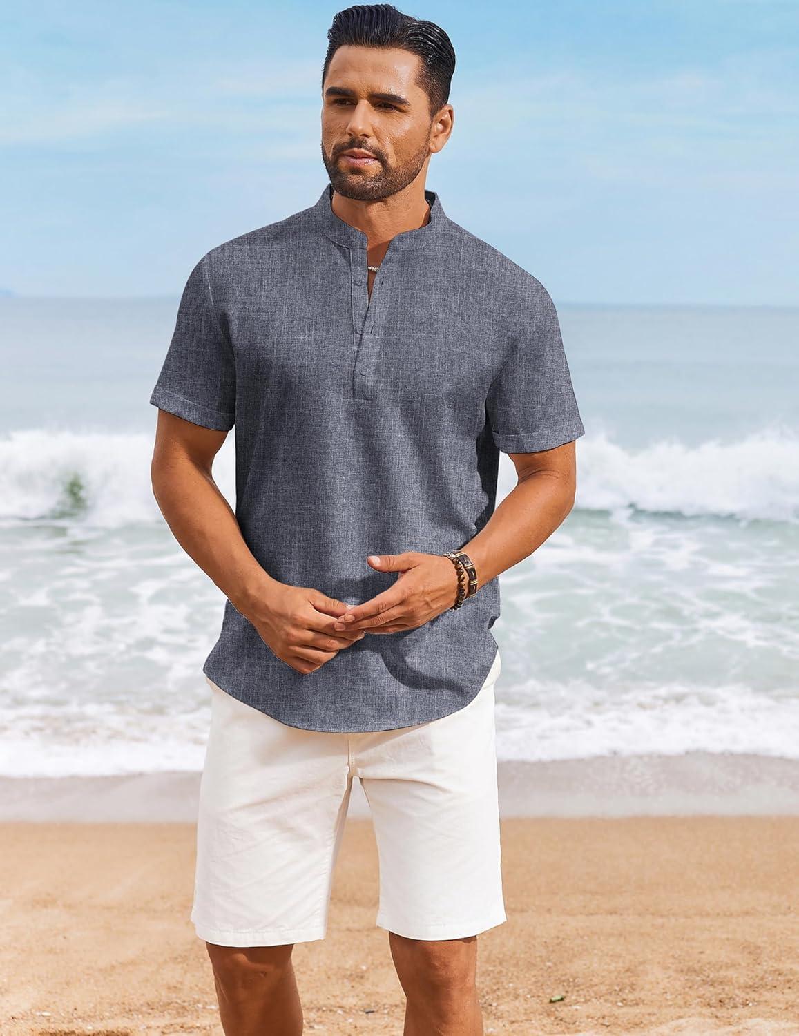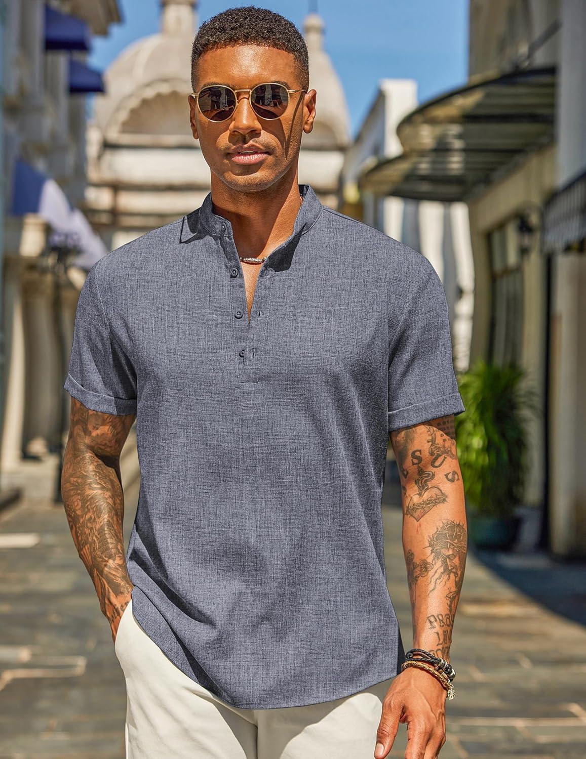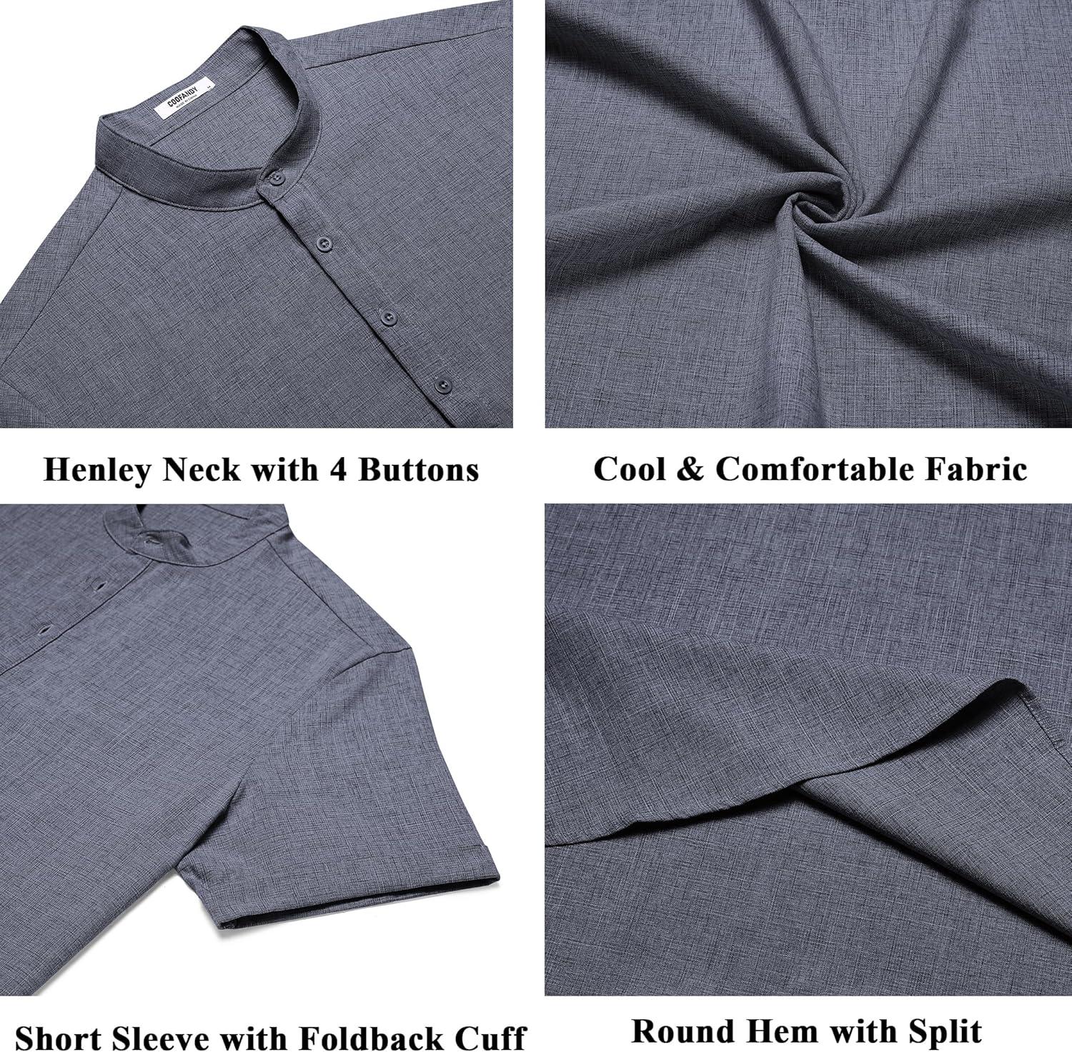 COOFANDY Men's Casual Linen Henley Shirts Short Sleeve Band Collar Summer Beach Vacation T-Shirts(Dark Heather Blue)