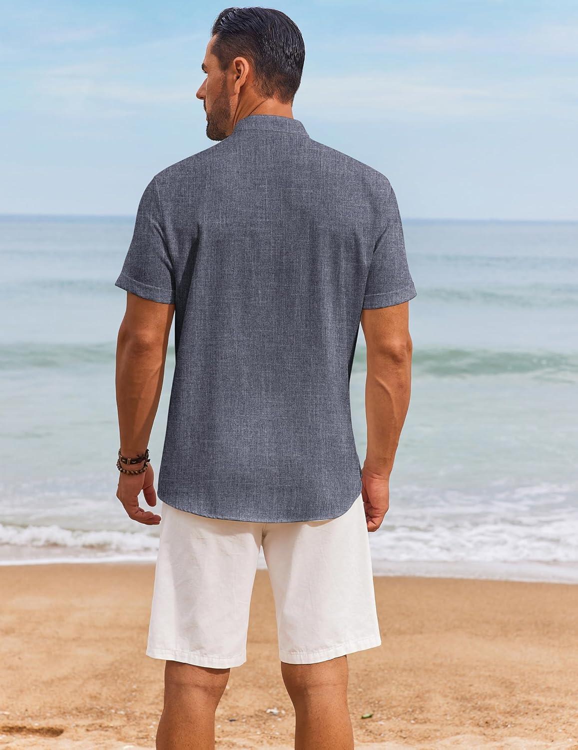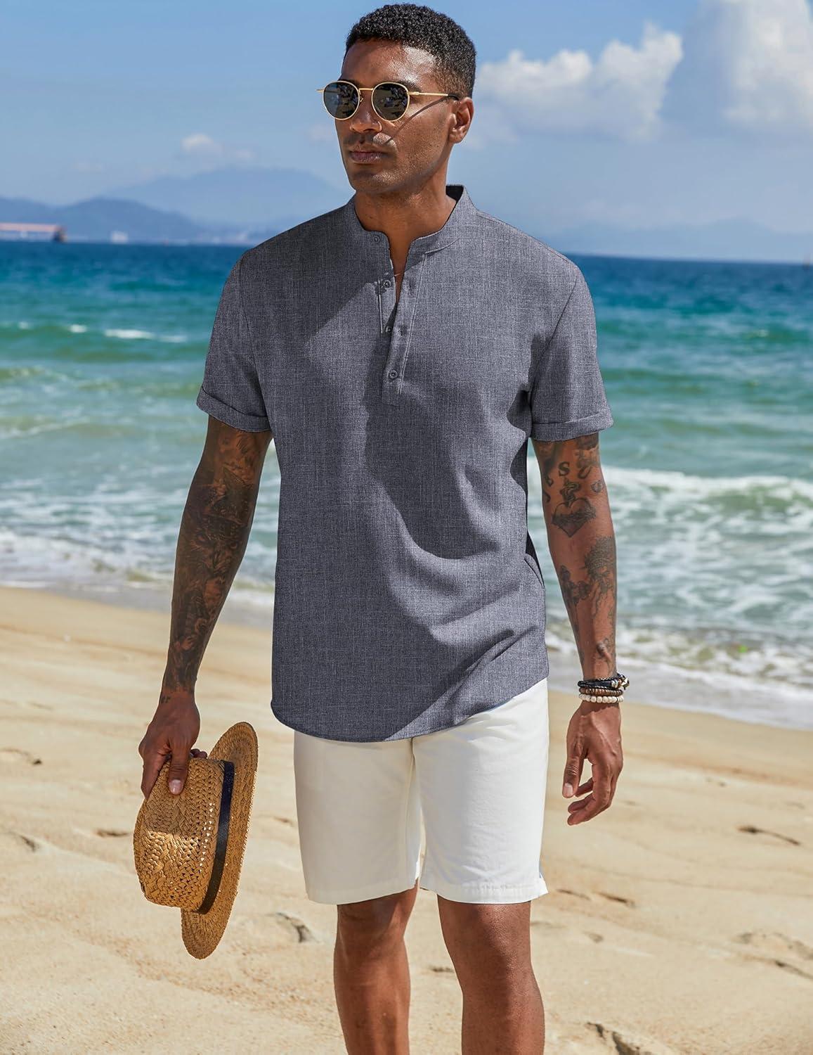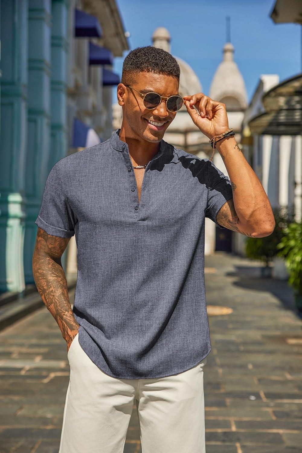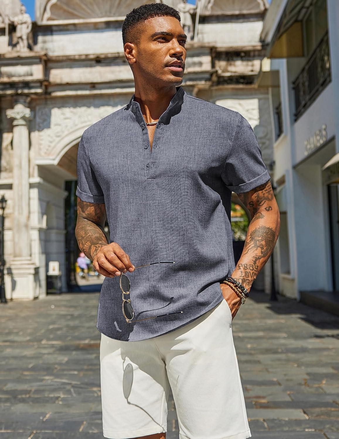 COOFANDY Men's Casual Linen Henley Shirts Short Sleeve Band Collar Summer Beach Vacation T-Shirts(Dark Heather Blue)