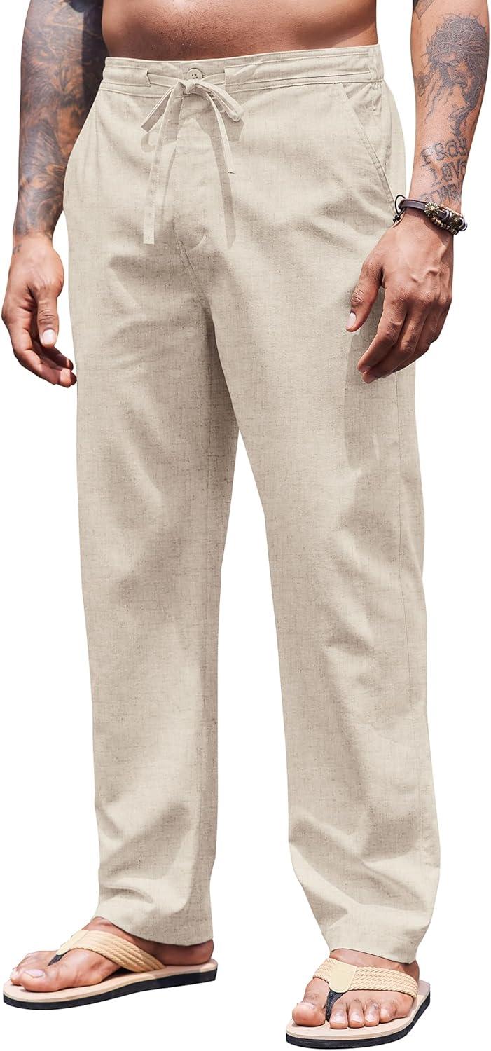 COOFANDY Men's Casual Linen Pants Elastic Waist Drawstring Yoga Beach Pants Lightweight Loose Fit Trousers with Pockets(Beige)
