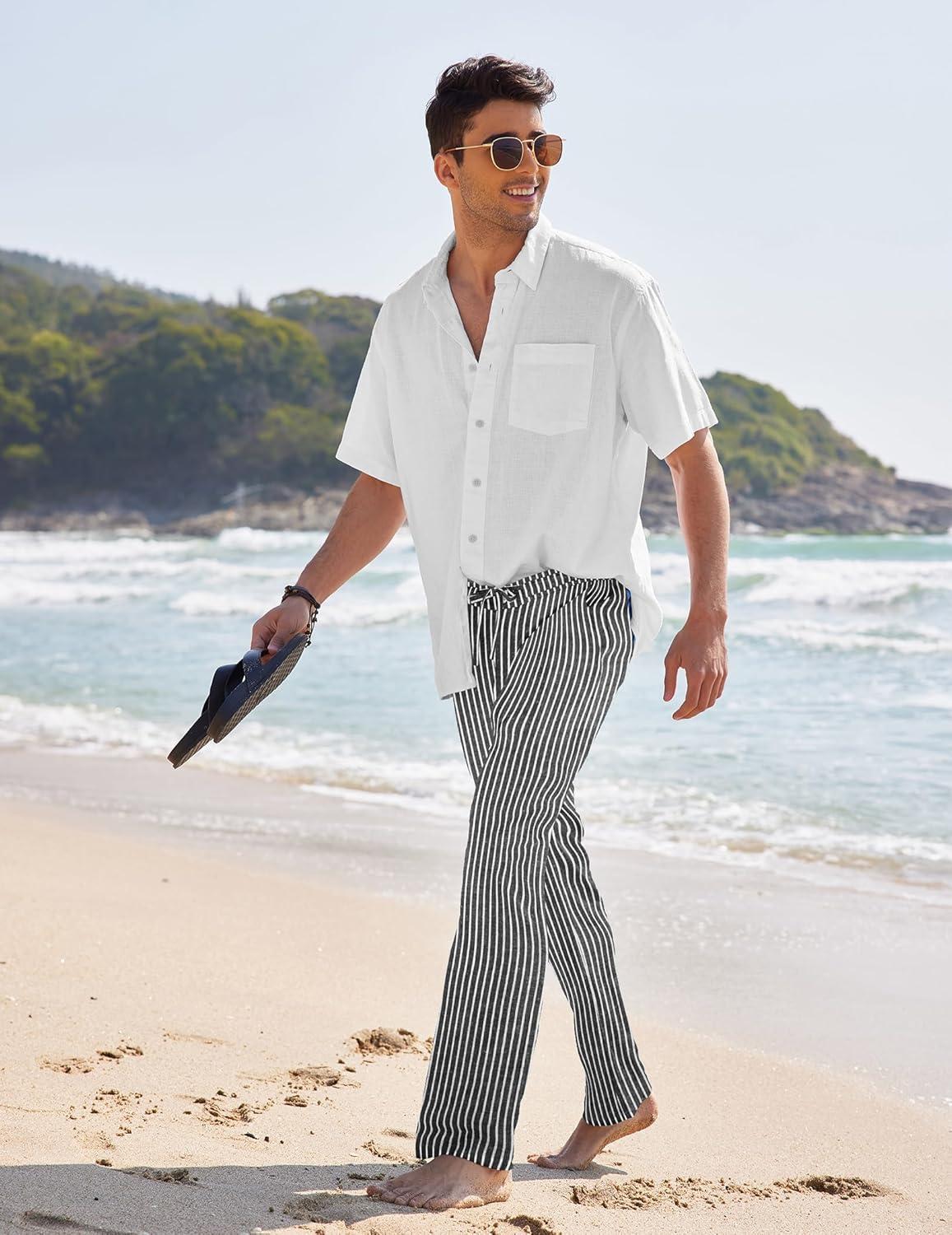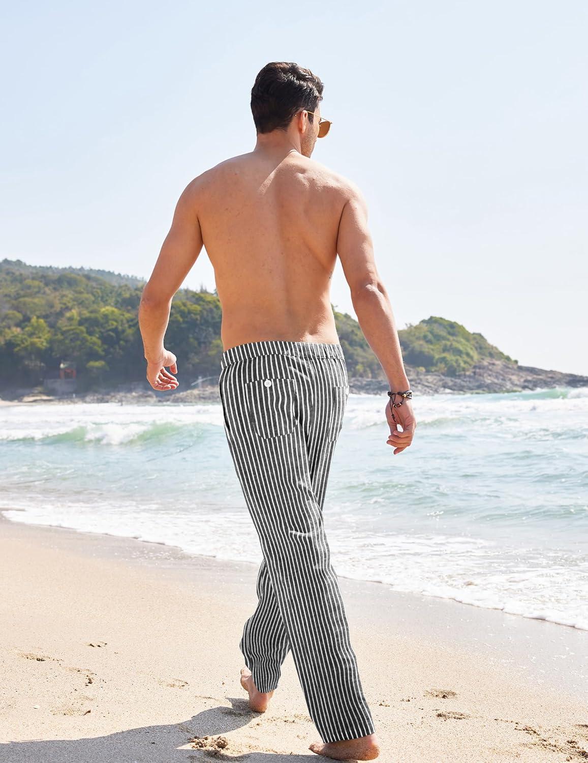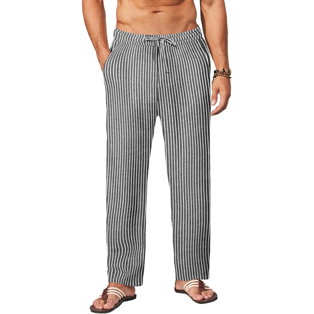 COOFANDY Men's Casual Linen Pants Elastic Waist Drawstring Yoga Beach Pants Lightweight Loose Fit Trousers with Pockets(Black ( White Stripe ))