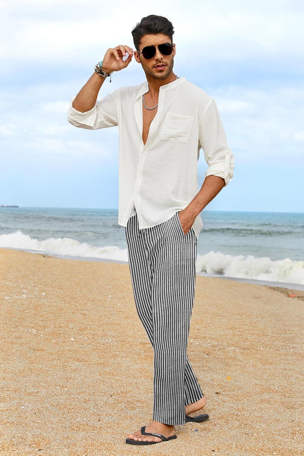 COOFANDY Men’s Casual Linen Pants Elastic Waist Drawstring Yoga Beach Pants Lightweight Loose Fit Trousers with Pockets(Light Blue ( White Stripe ))