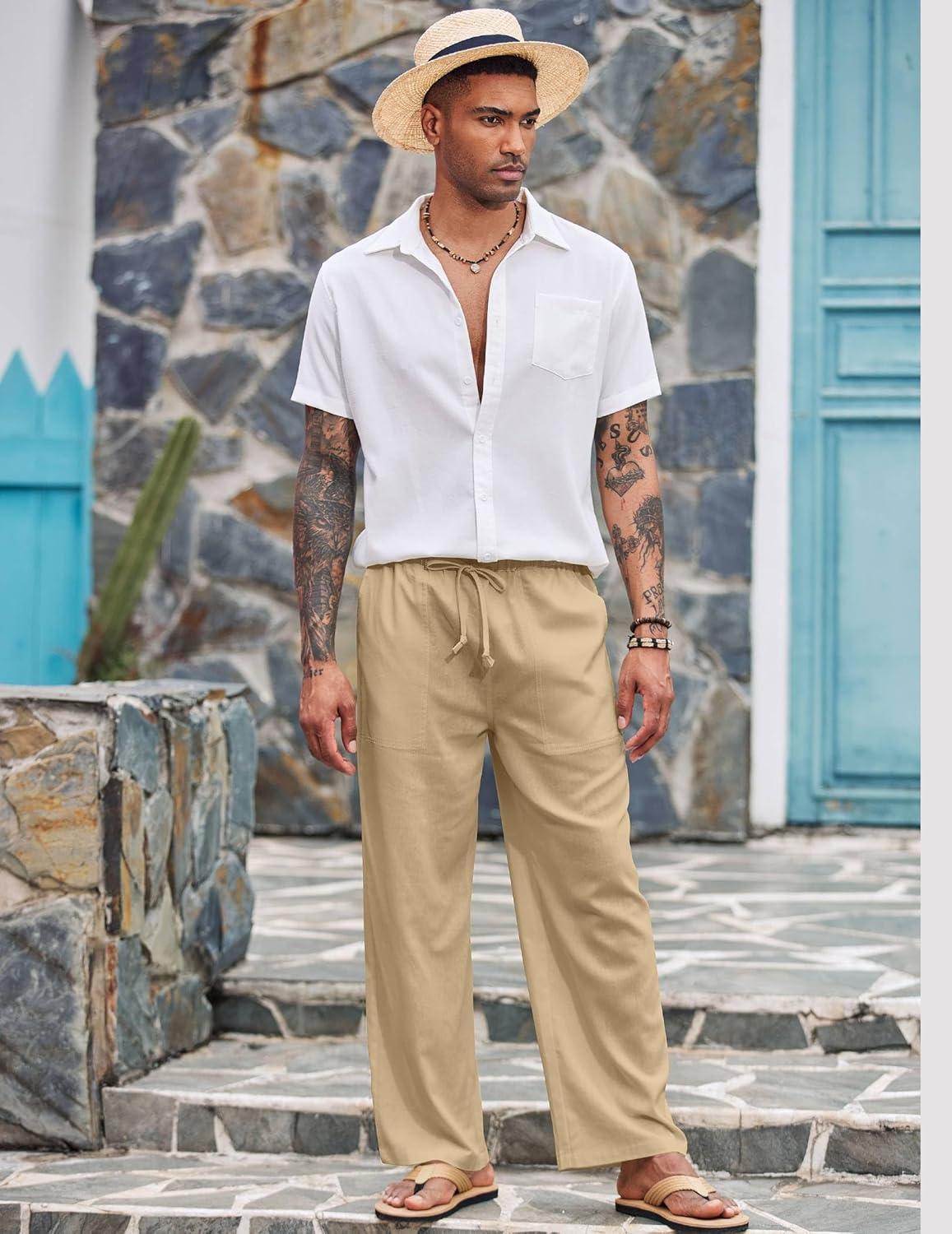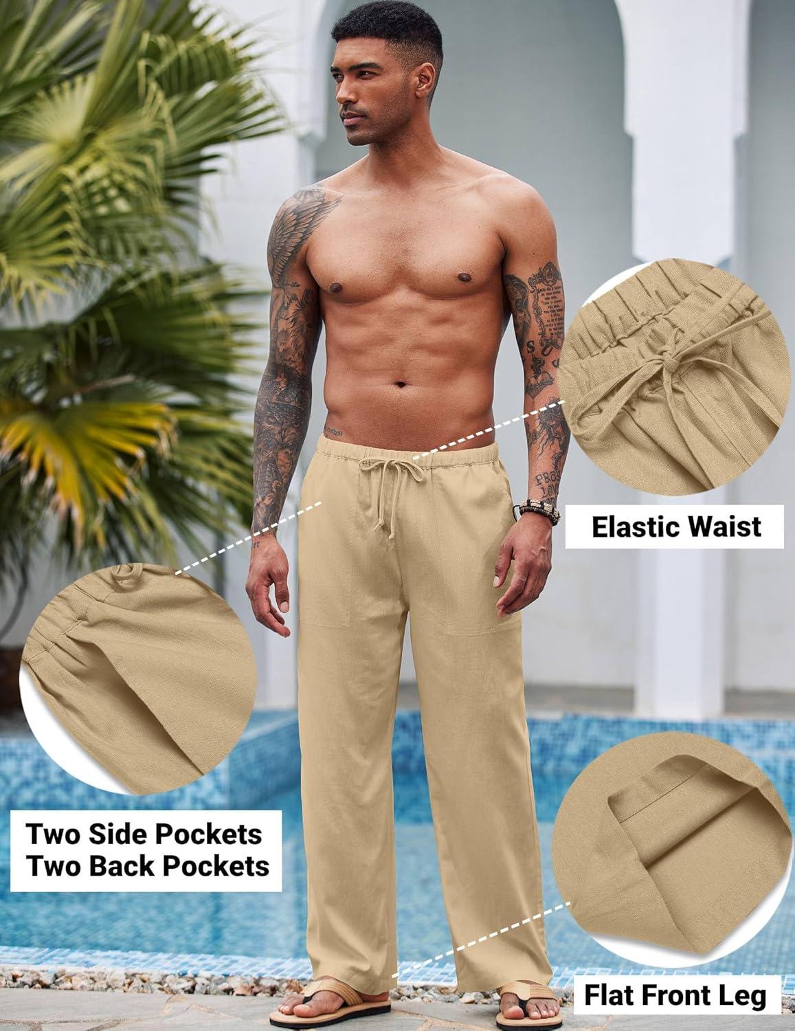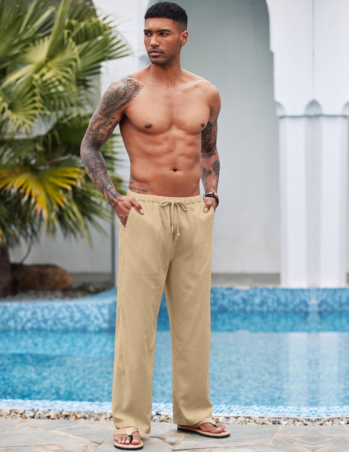 COOFANDY Mens Casual Linen Pants Elastic Waist Linen Pants Drawstring Summer Beach Yoga Linen Trouser(A- Beige)