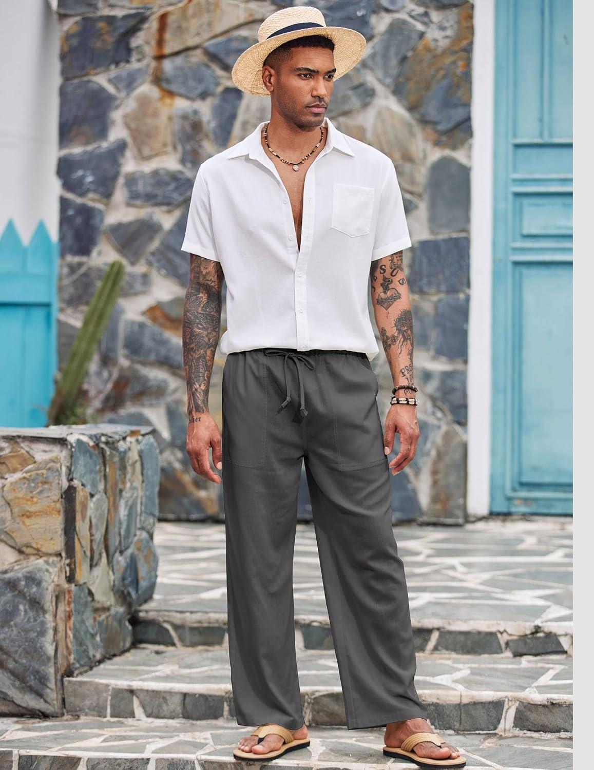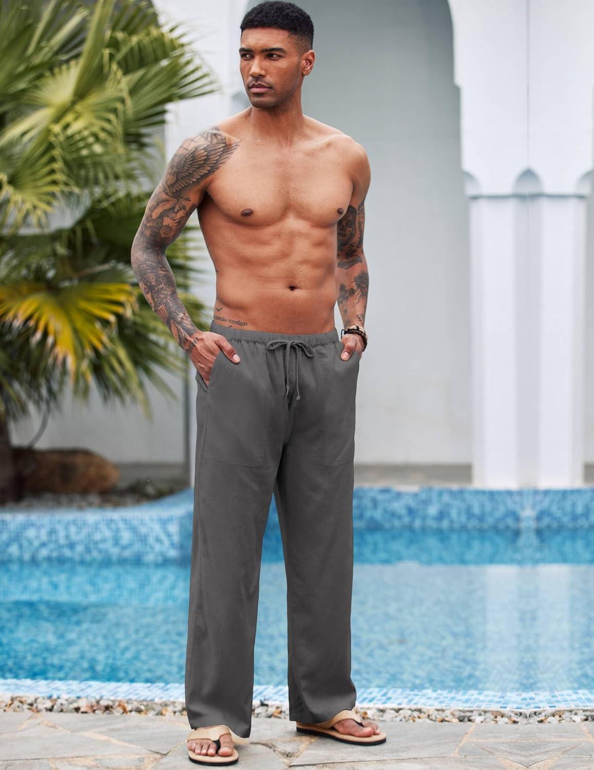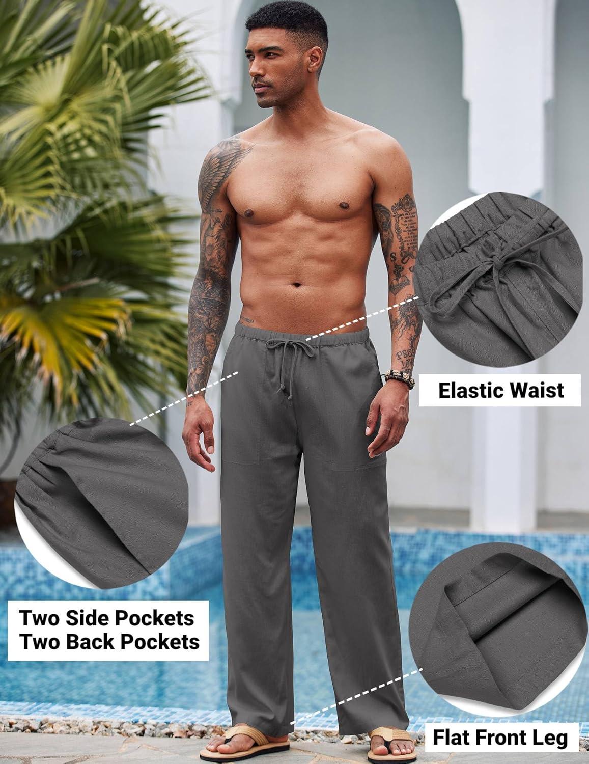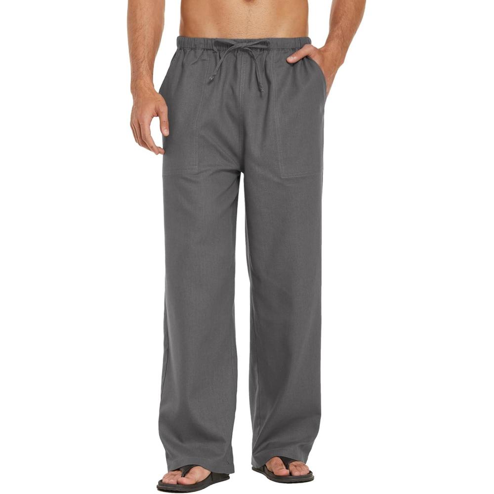 COOFANDY Mens Casual Linen Pants Elastic Waist Linen Pants Drawstring Summer Beach Yoga Linen Trouser(A- Dark Grey)