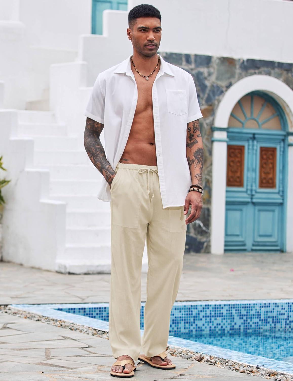 COOFANDY Mens Casual Linen Pants Elastic Waist Linen Pants Drawstring Summer Beach Yoga Linen Trouser(A- Light Khaki)