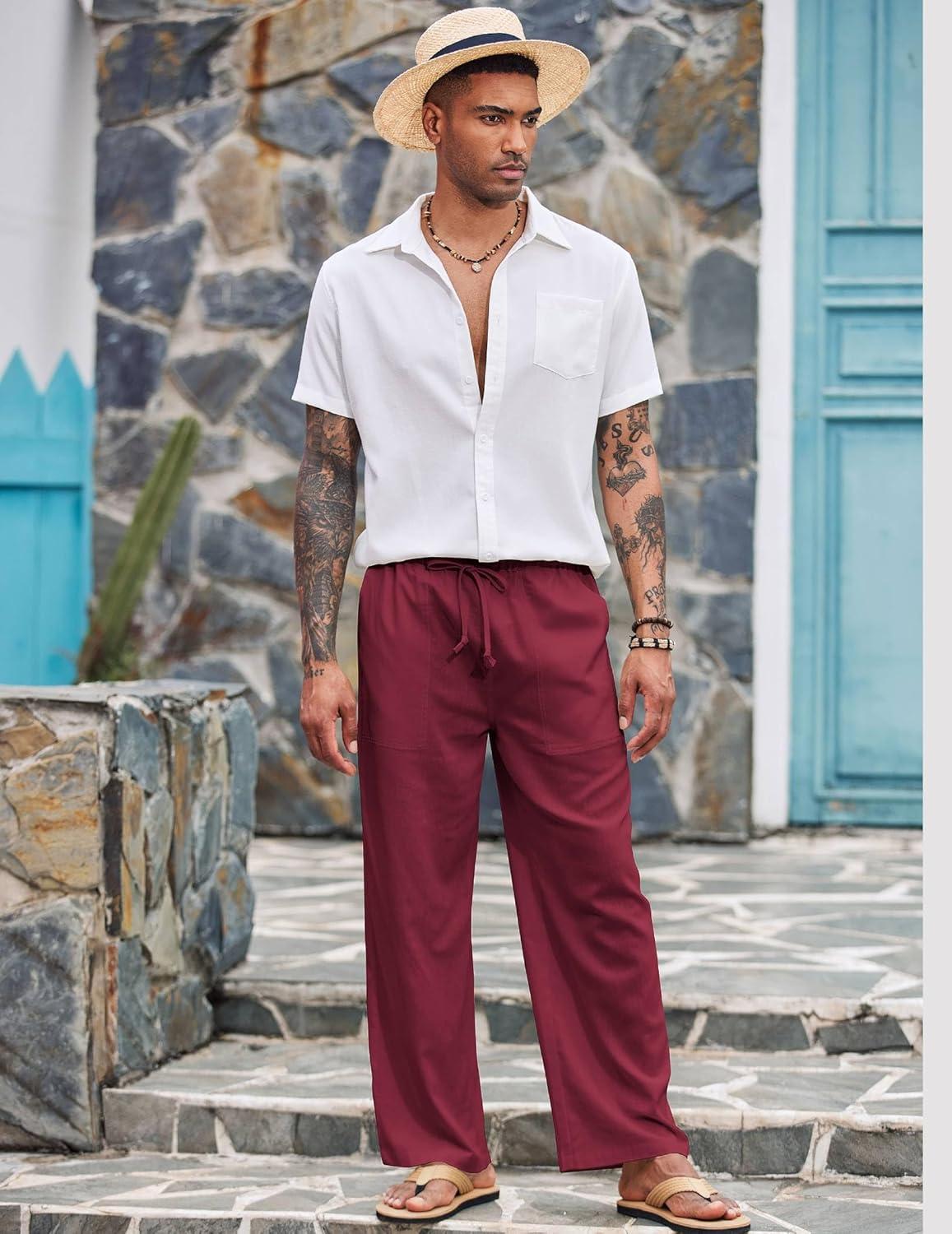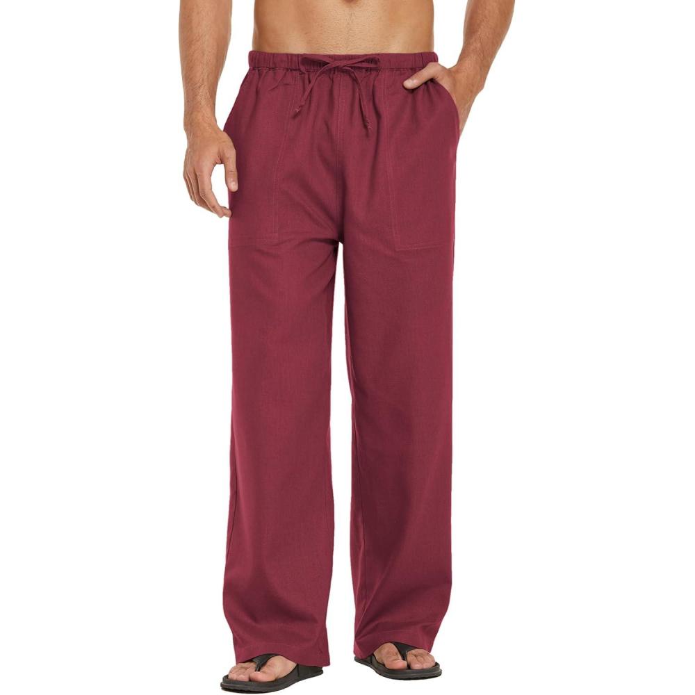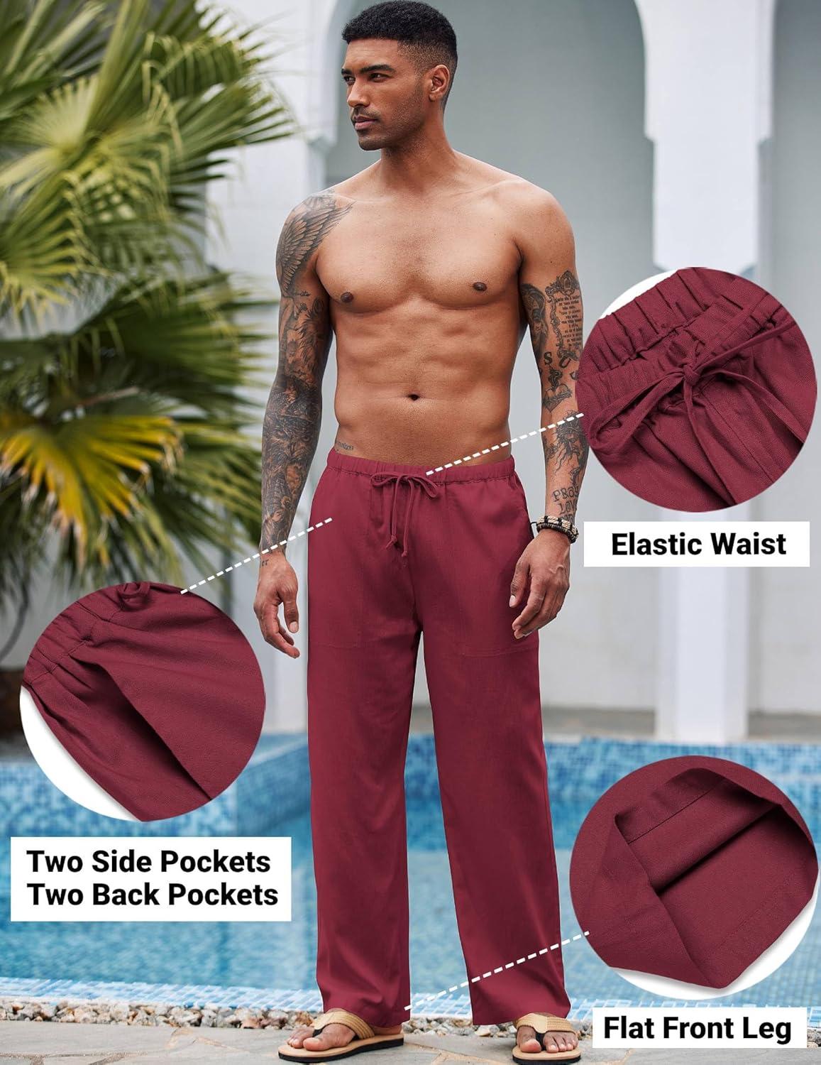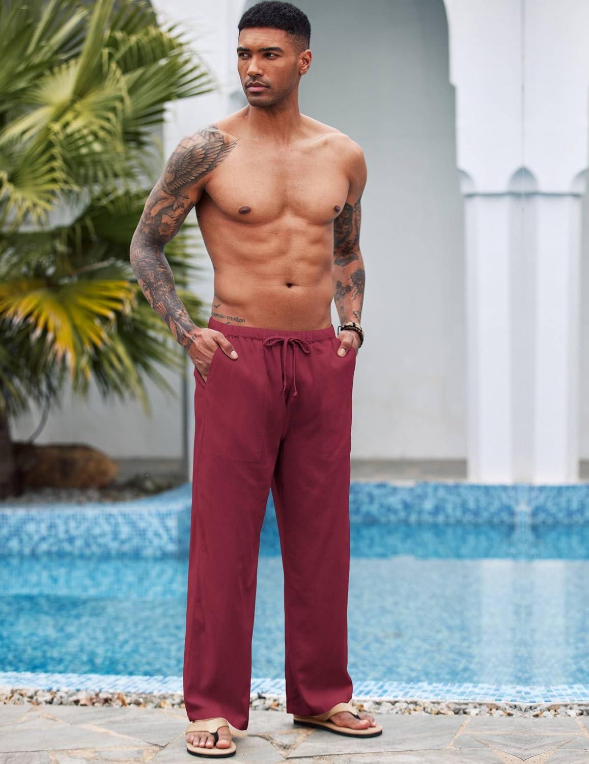 COOFANDY Mens Casual Linen Pants Elastic Waist Linen Pants Drawstring Summer Beach Yoga Linen Trouser(A- Wine Red)