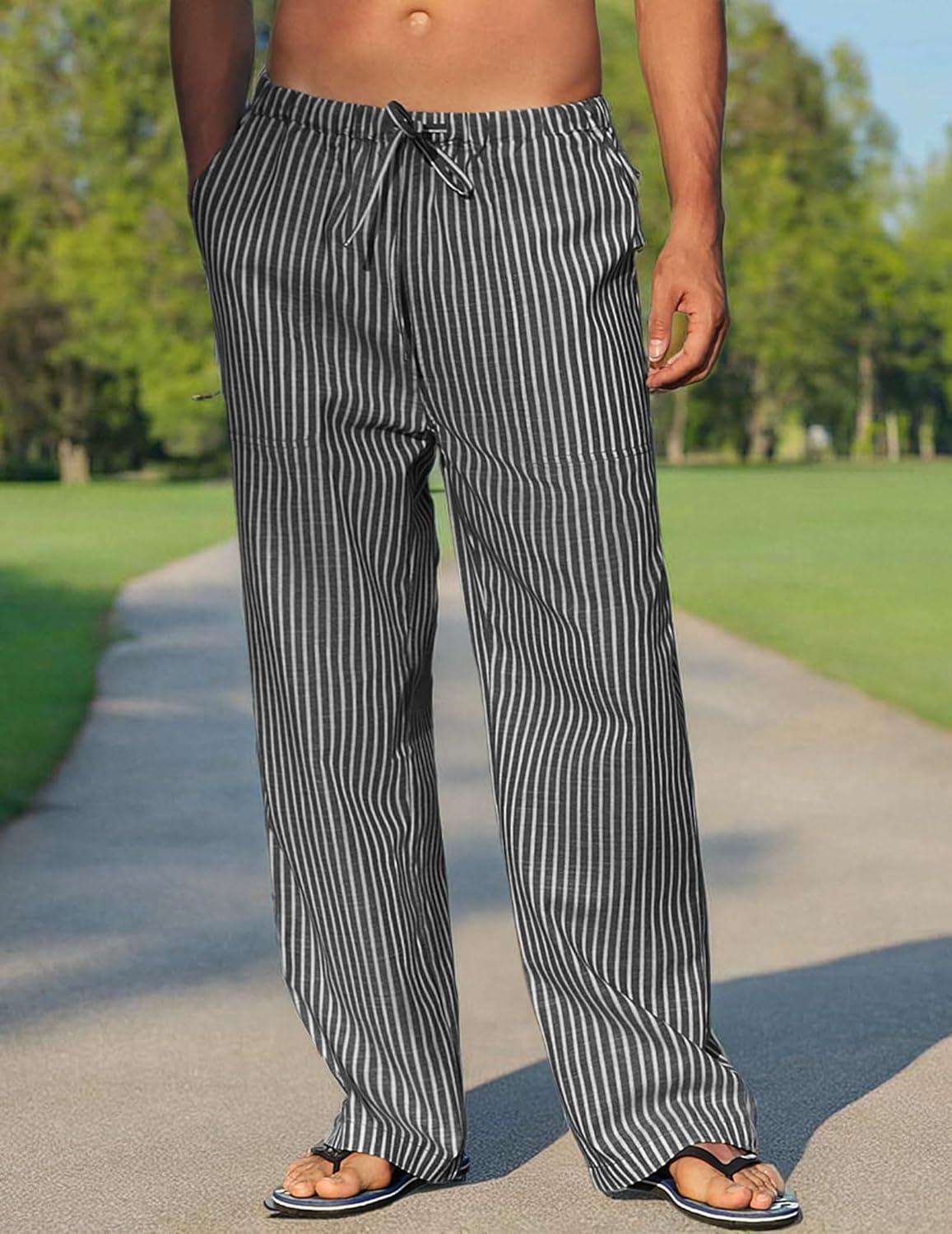 COOFANDY Mens Casual Linen Pants Elastic Waist Linen Pants Drawstring Summer Beach Yoga Linen Trouser(Striped- Black White)