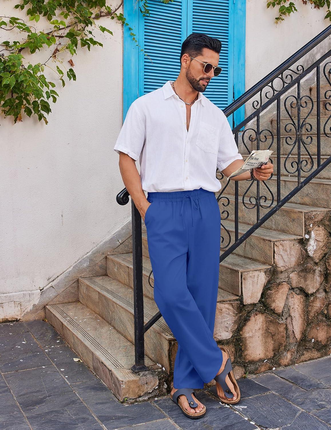 COOFANDY Men’s Casual Linen Pants Loose Fit Elastic Waist Drawstring Lightweight Pant Summer Beach Trousers(Blue)