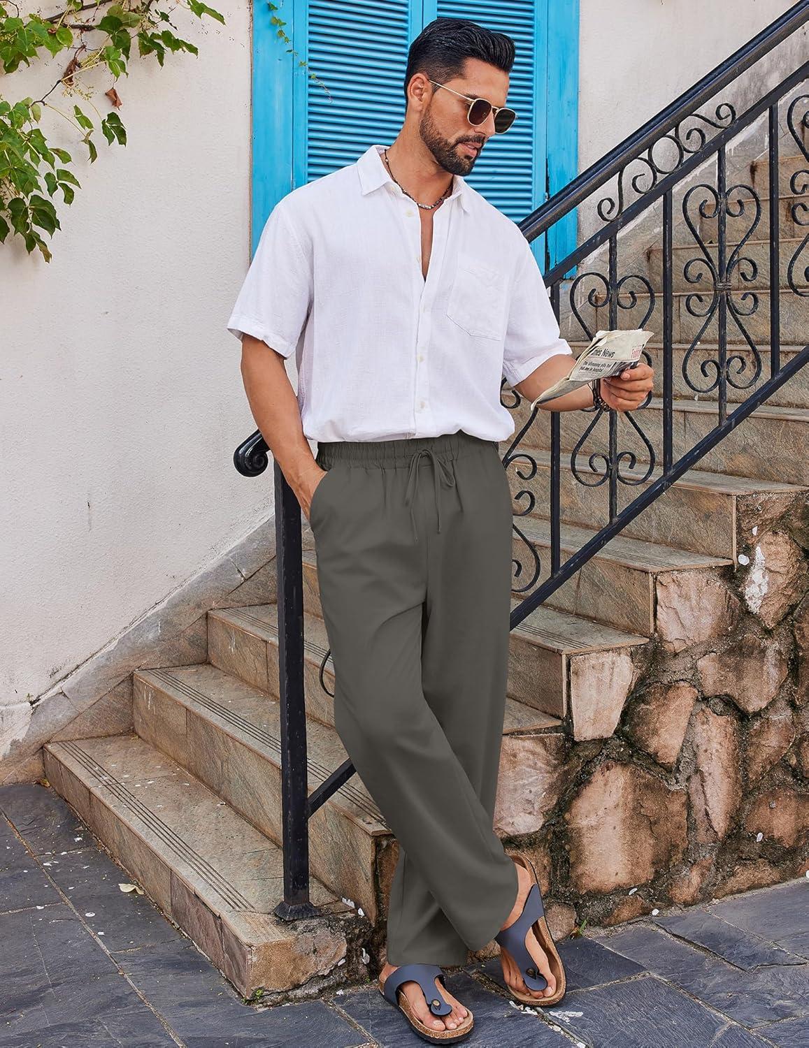COOFANDY Men’s Casual Linen Pants Loose Fit Elastic Waist Drawstring Lightweight Pant Summer Beach Trousers(Drak Grey)