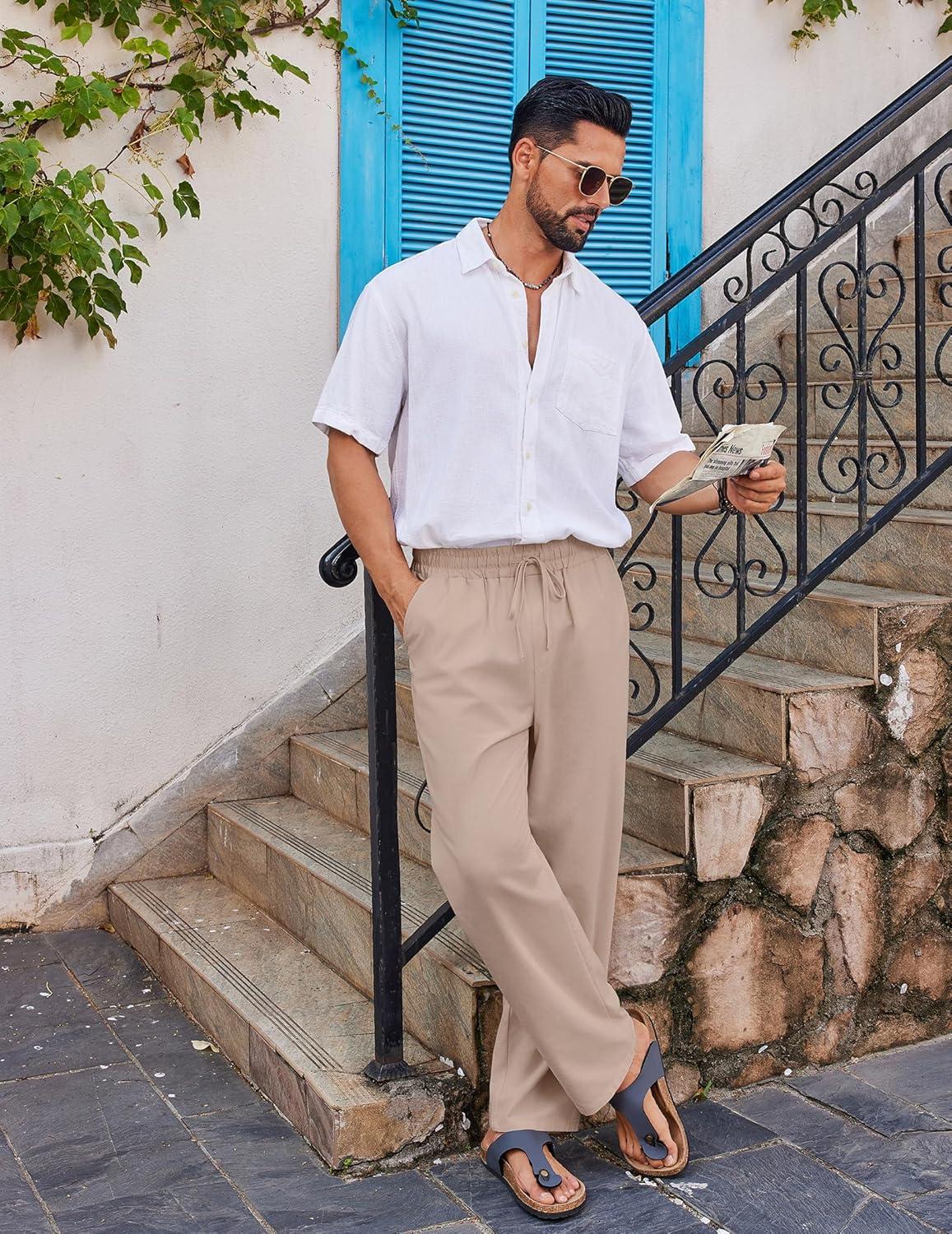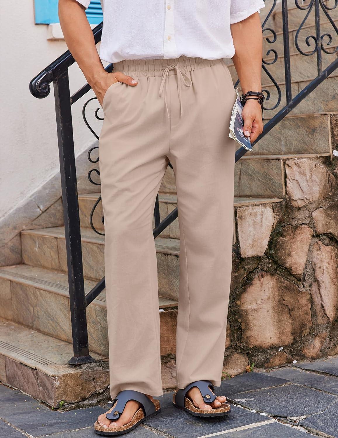 COOFANDY Men’s Casual Linen Pants Loose Fit Elastic Waist Drawstring Lightweight Pant Summer Beach Trousers(Khaki)
