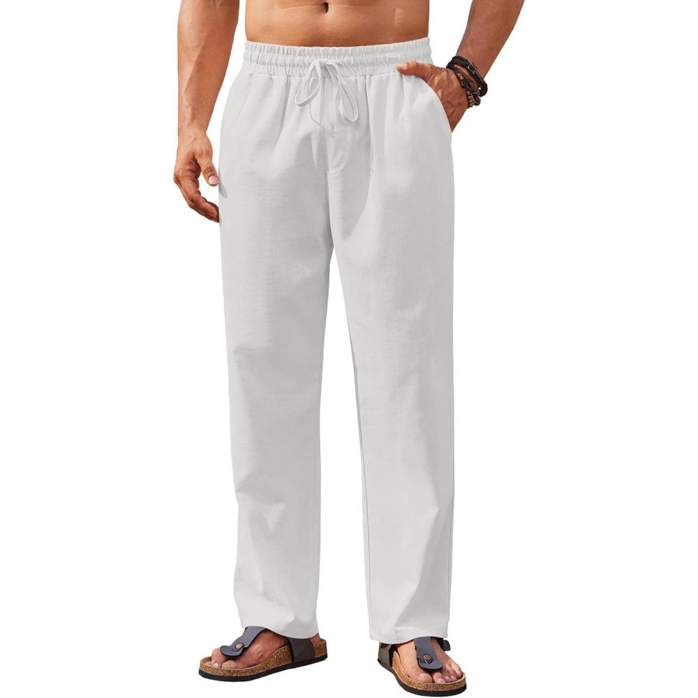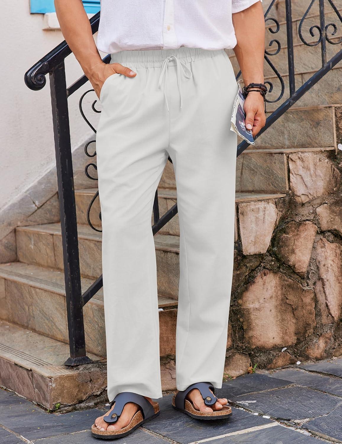 COOFANDY Men's Casual Linen Pants Loose Fit Elastic Waist Drawstring Lightweight Pant Summer Beach Trousers(White)