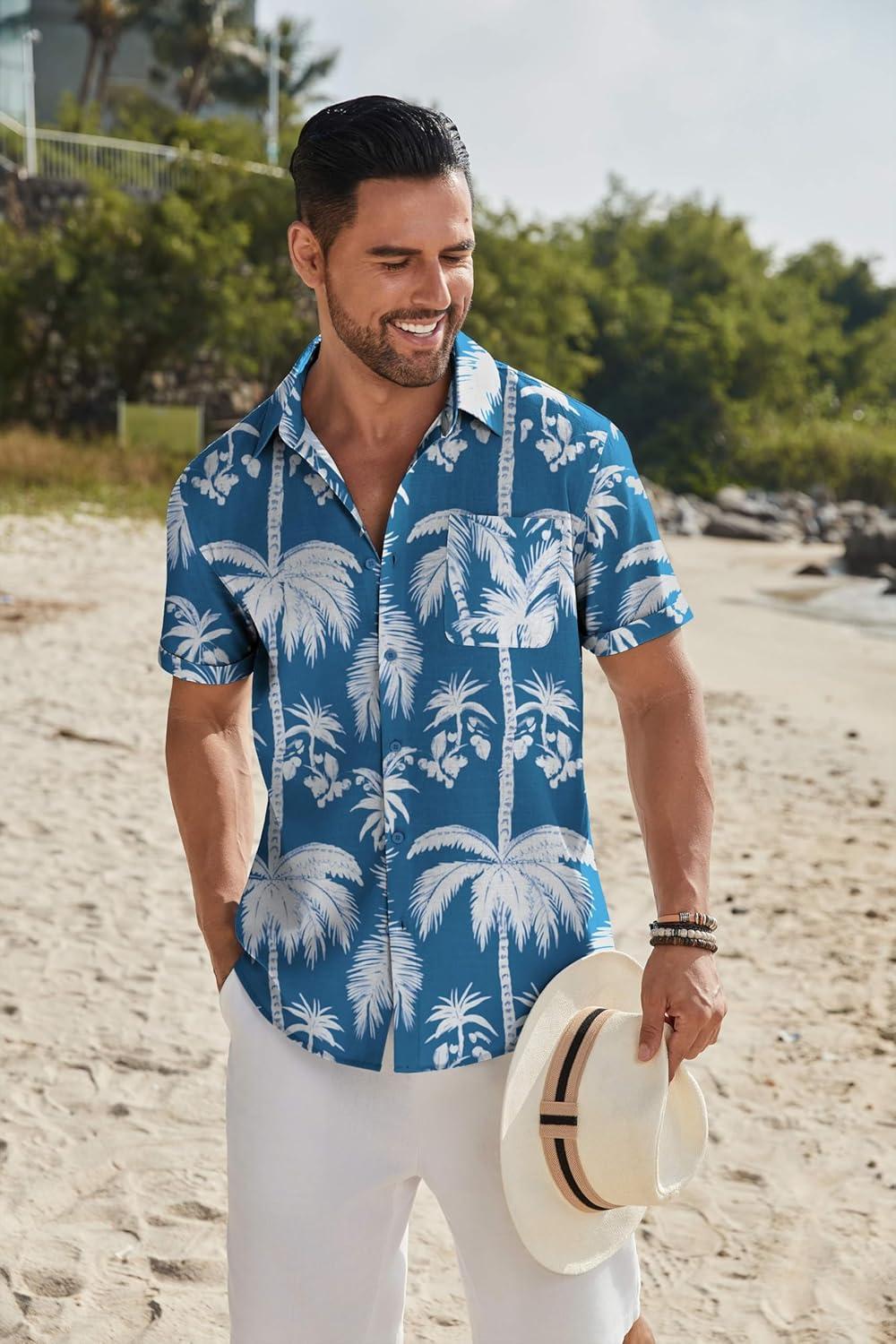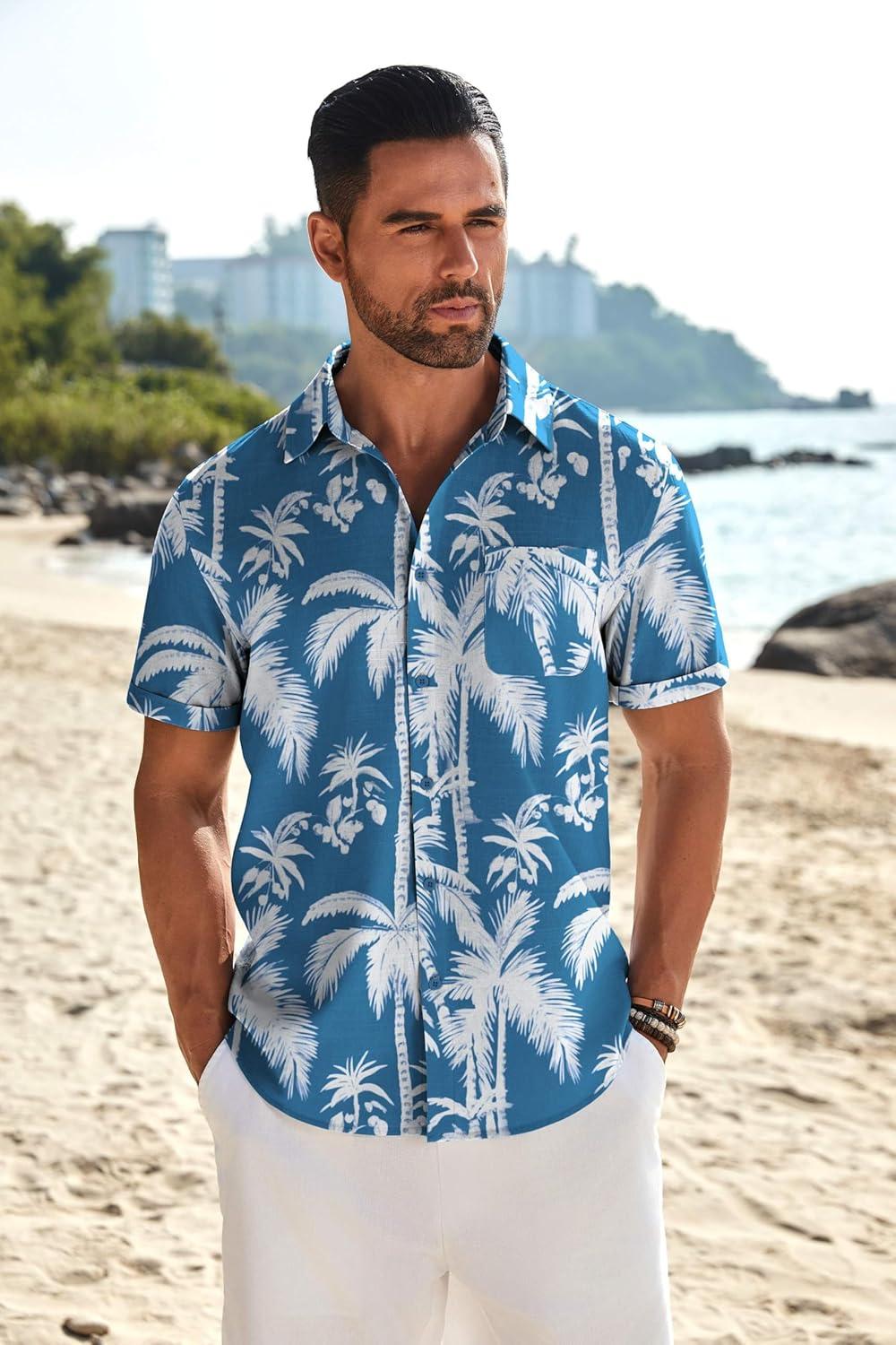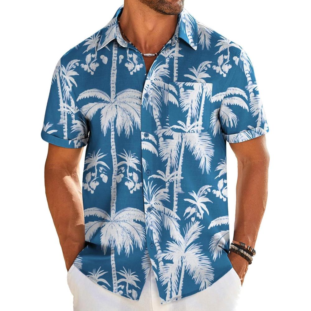 COOFANDY Mens Casual Linen Shirt Short Sleeve Button Down Shirt Summer Beach Shirts with Pocket(Blue-coconut Tree)