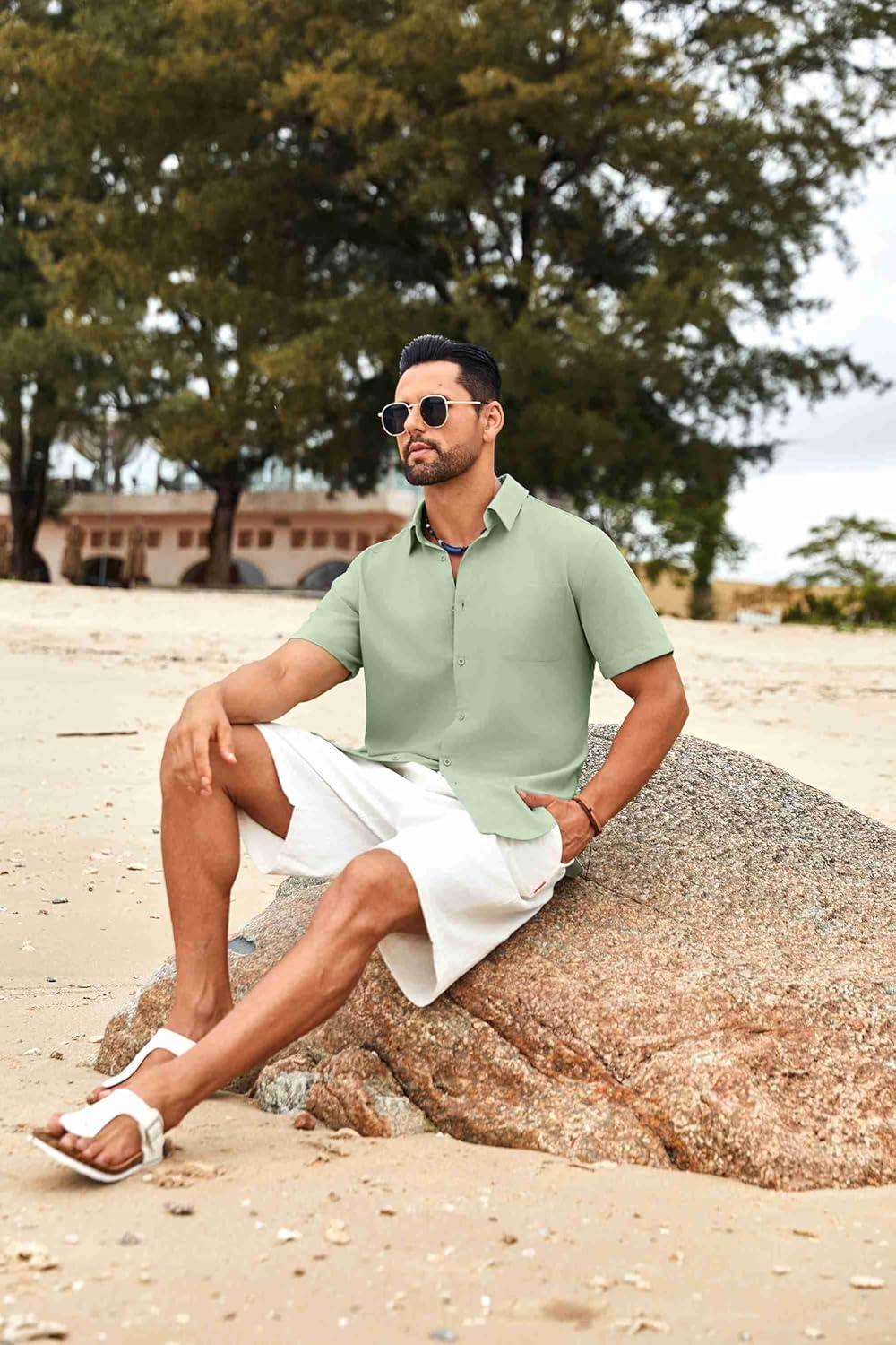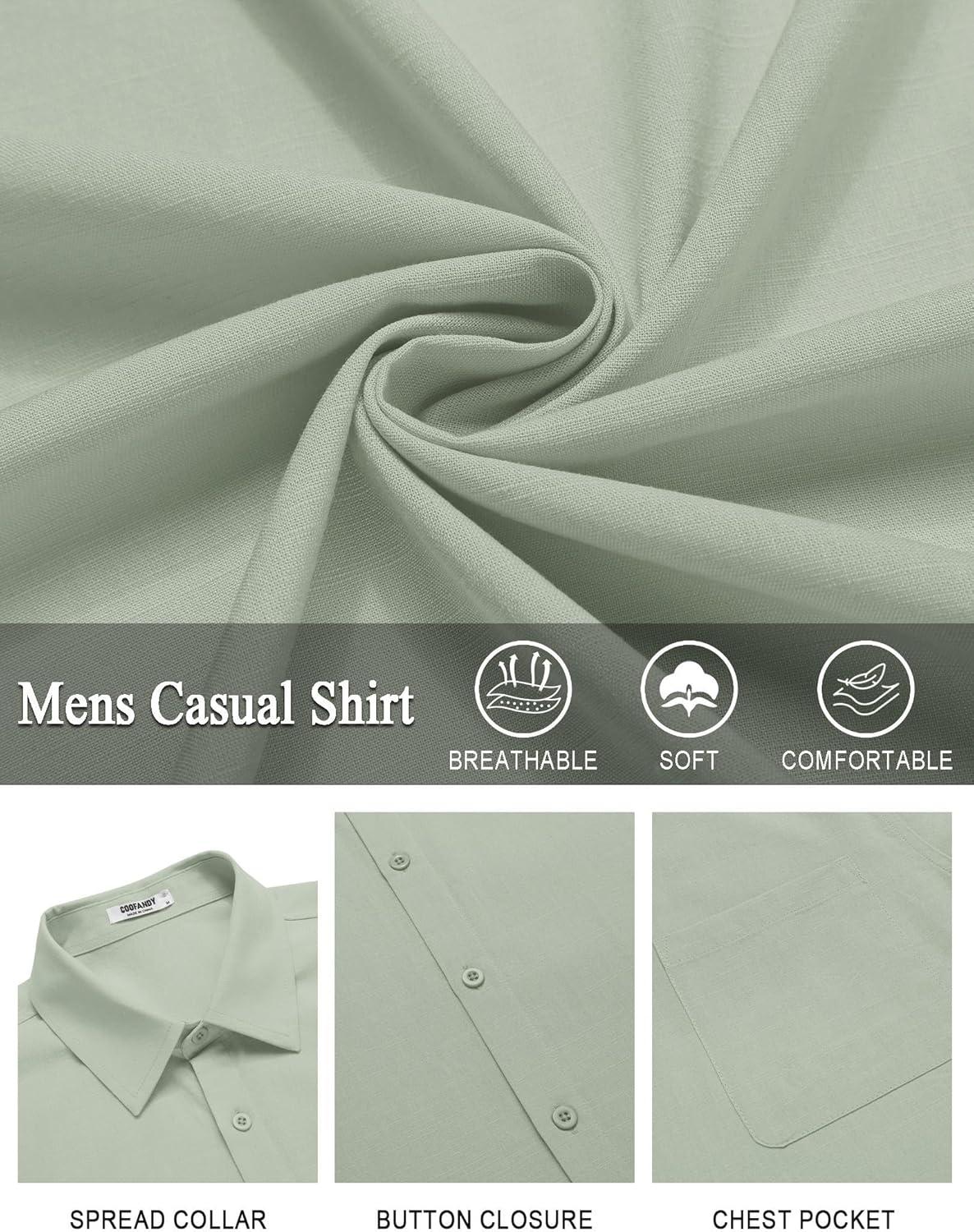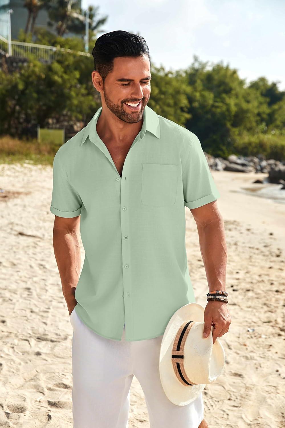COOFANDY Mens Casual Linen Shirt Short Sleeve Button Down Shirt Summer Beach Shirts with Pocket(Light Green)