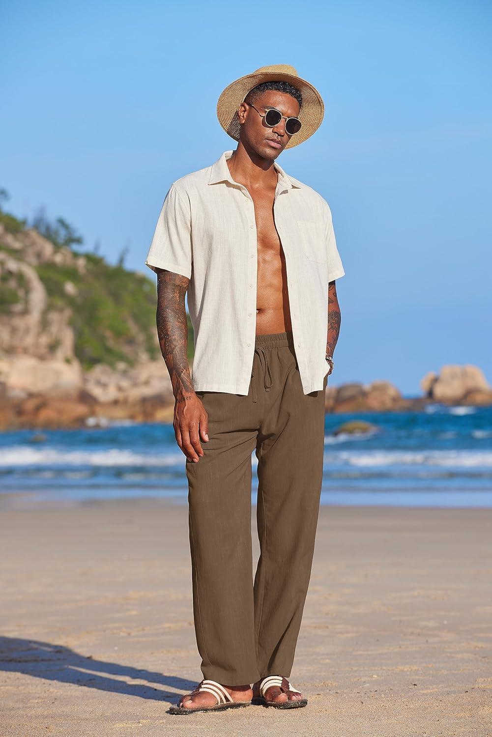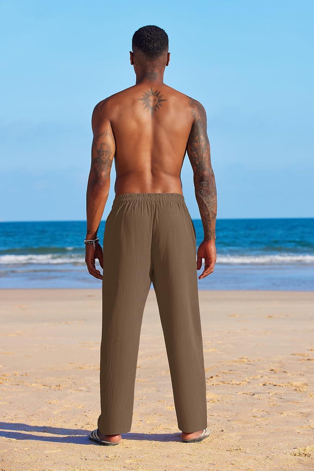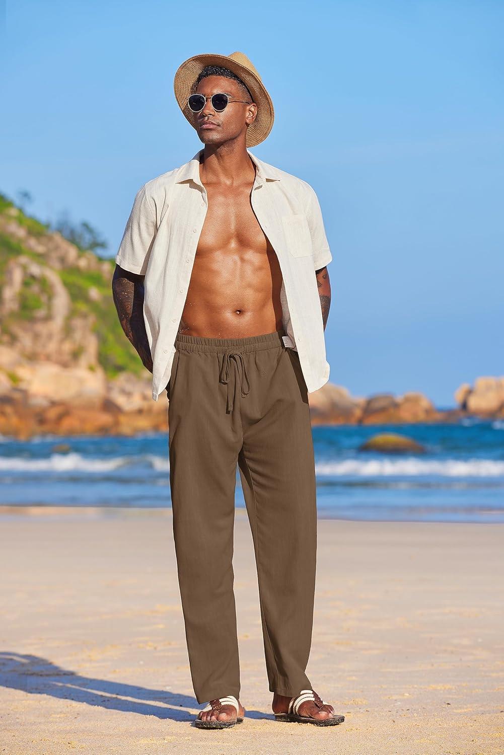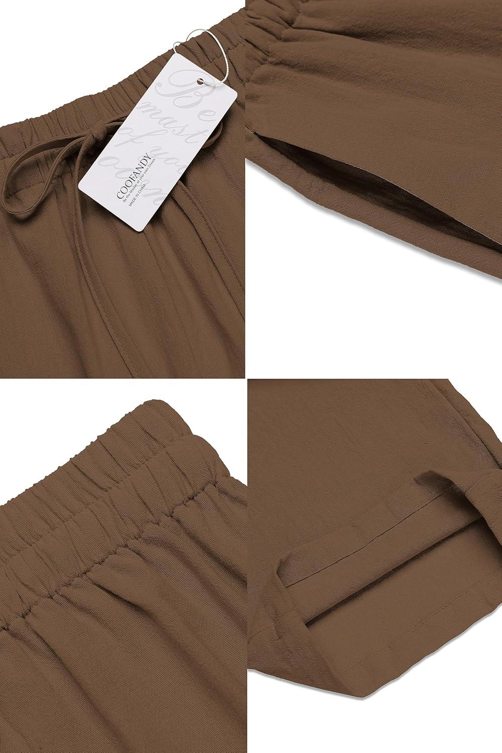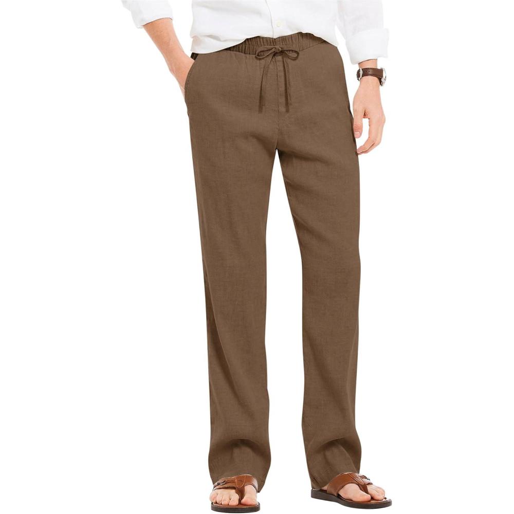 COOFANDY Men’s Casual Linen Summer Beach Pants Lightweight Drawstring Elastic Waist Yoga Trousers(Brown)