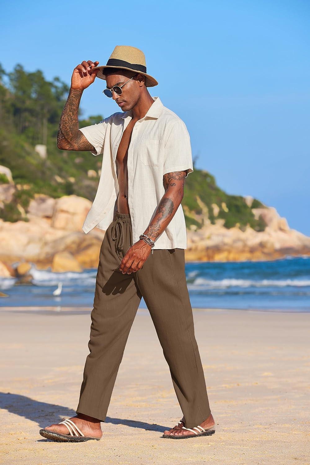 COOFANDY Men’s Casual Linen Summer Beach Pants Lightweight Drawstring Elastic Waist Yoga Trousers(Coffee)