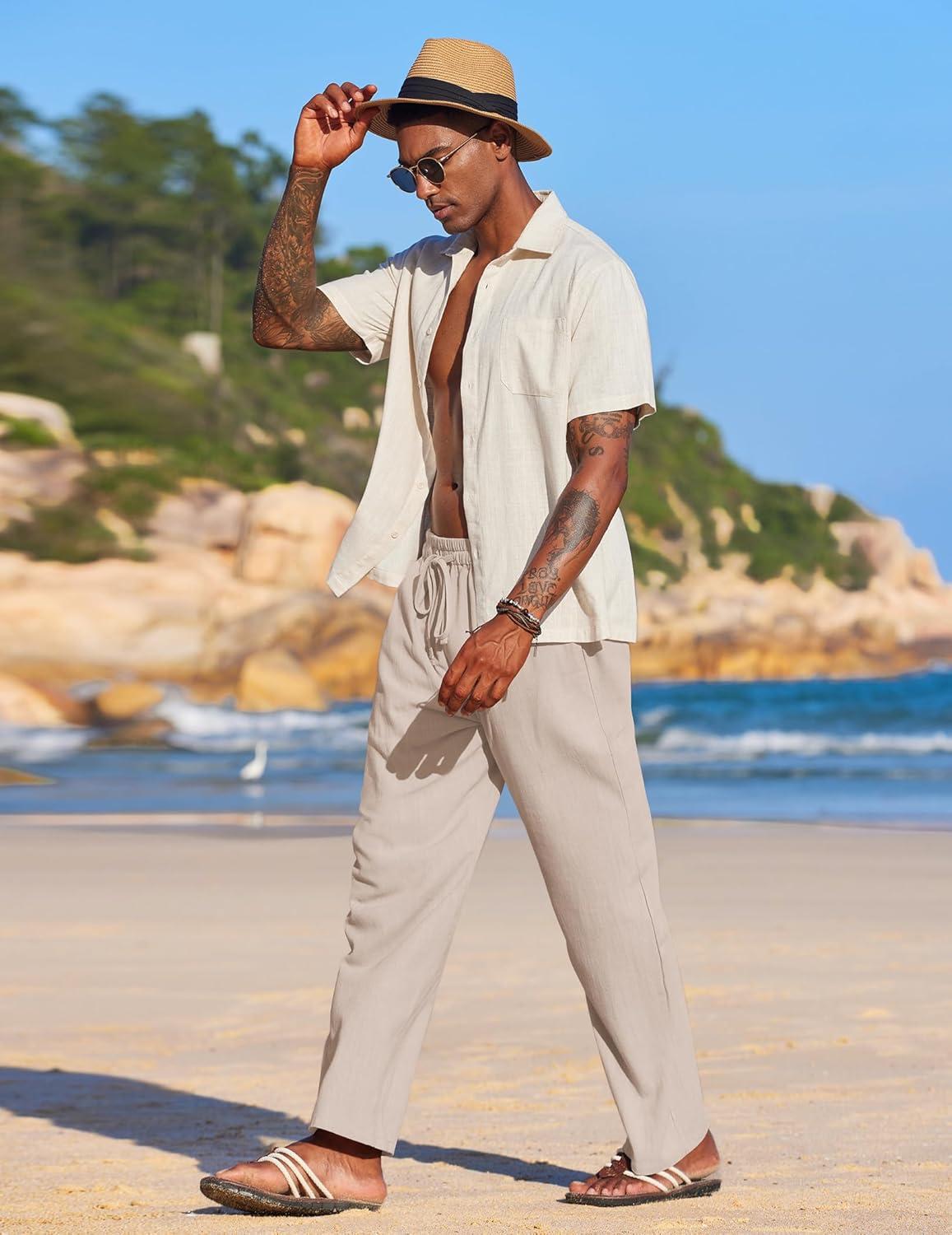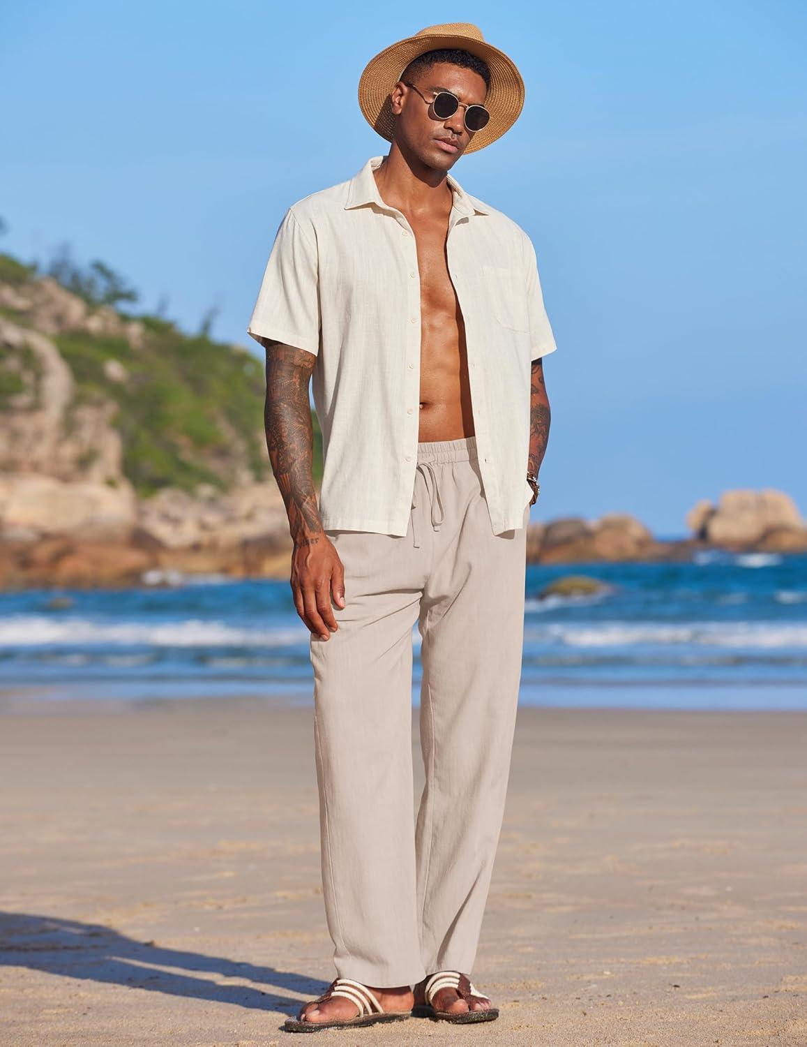 COOFANDY Men’s Casual Linen Summer Beach Pants Lightweight Drawstring Elastic Waist Yoga Trousers(Khaki)