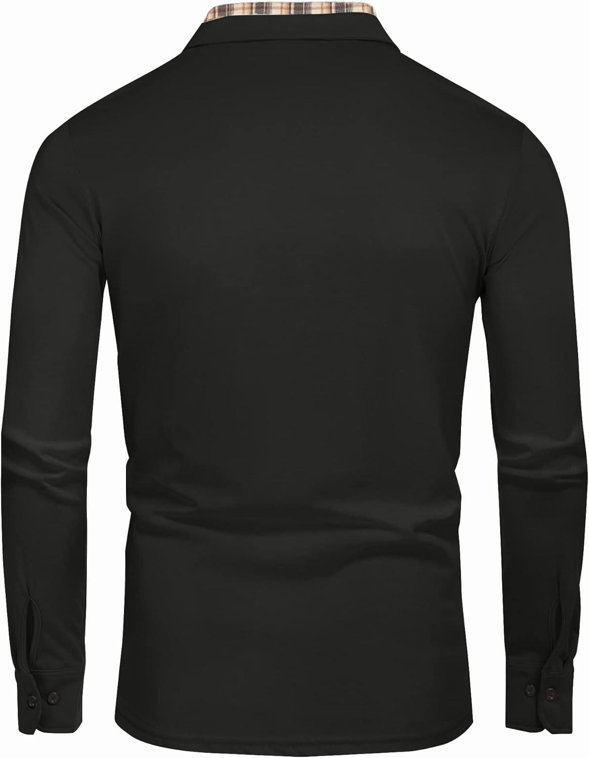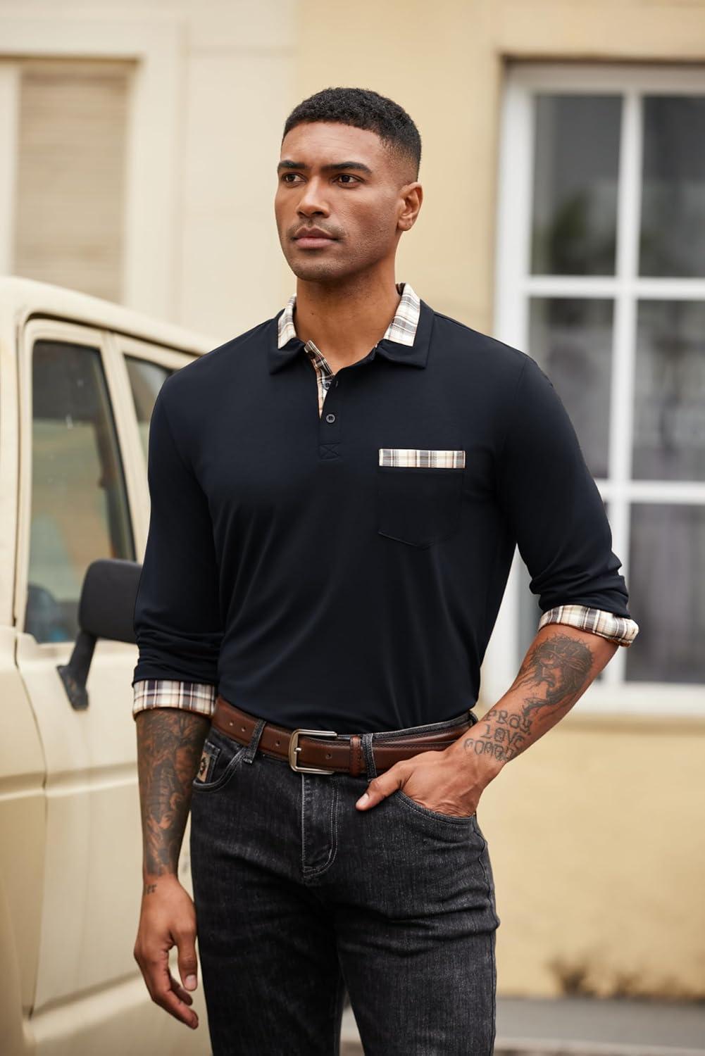 COOFANDY Men's Casual Polo Shirt Long Sleeve Classic Plaid Button Tees with Pockets(Black)