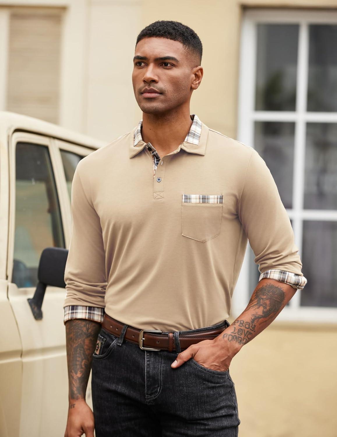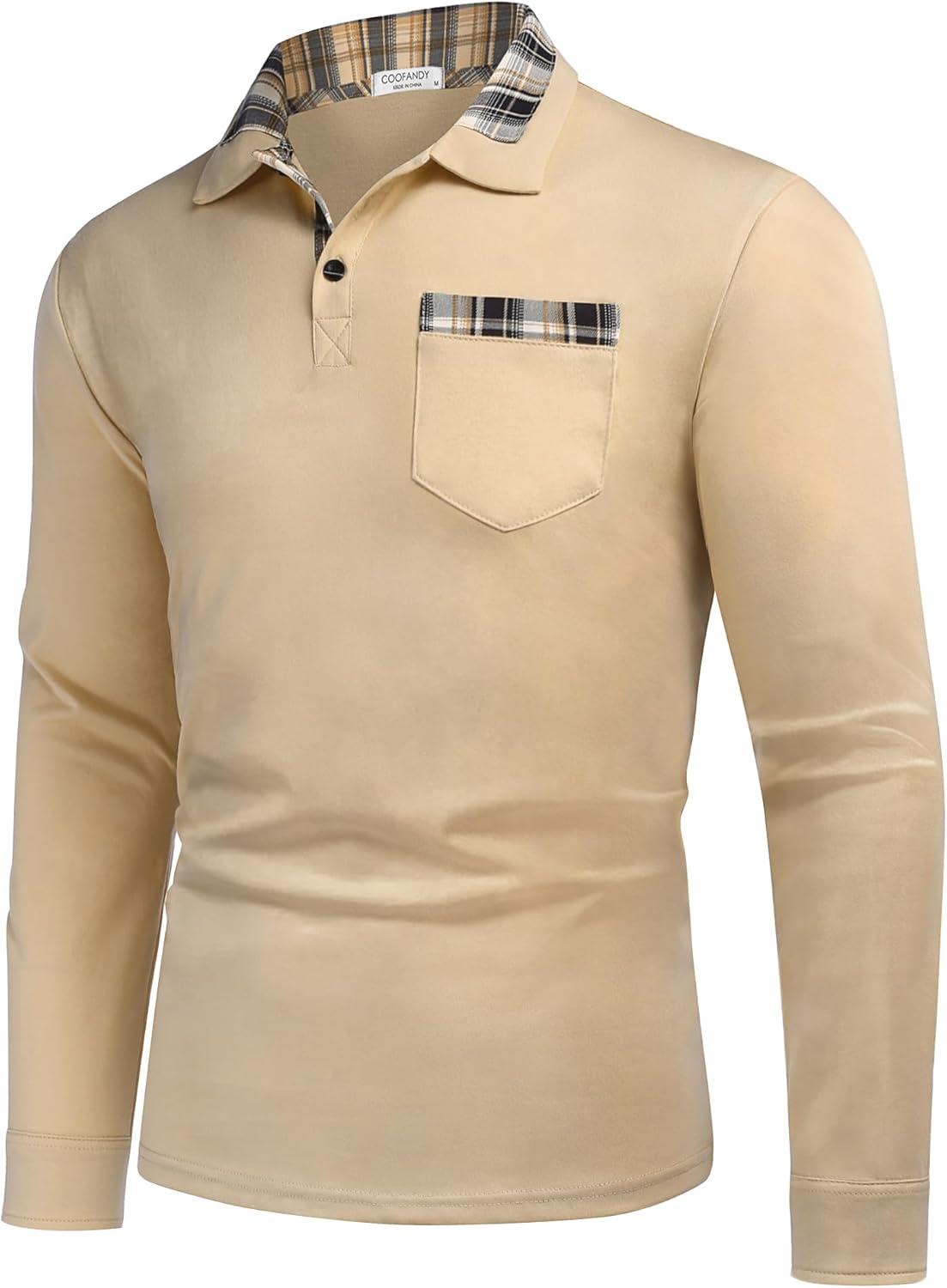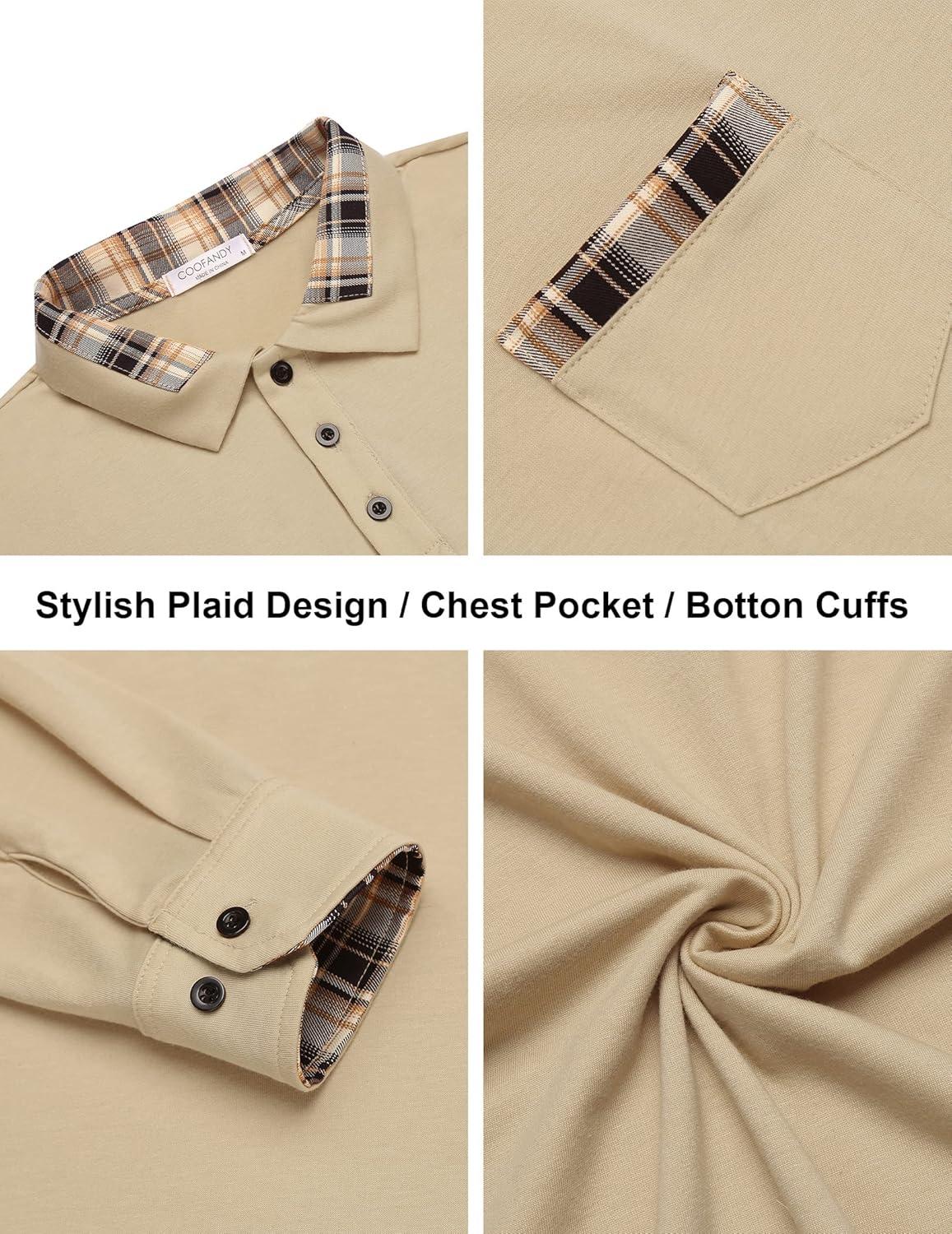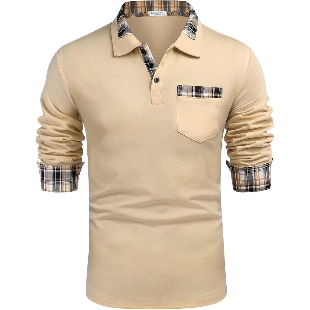 COOFANDY Men’s Casual Polo Shirt Long Sleeve Classic Plaid Button Tees with Pockets(Khaki)