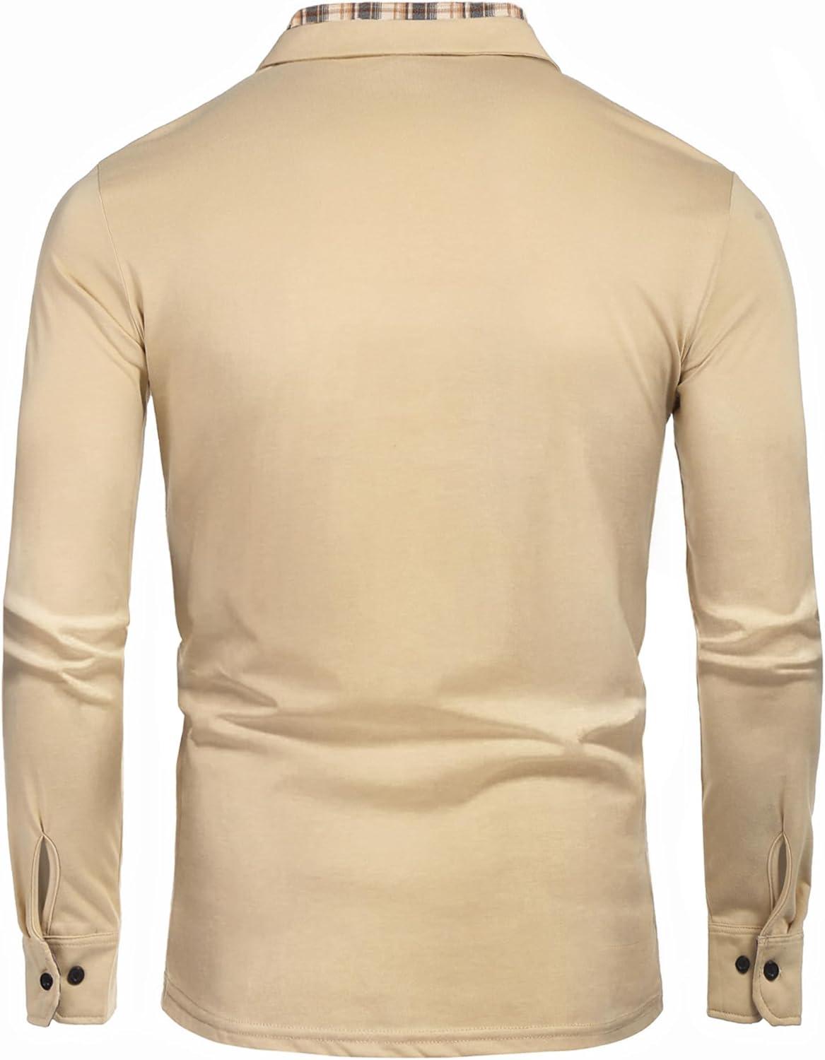 COOFANDY Men's Casual Polo Shirt Long Sleeve Classic Plaid Button Tees with Pockets(Khaki)