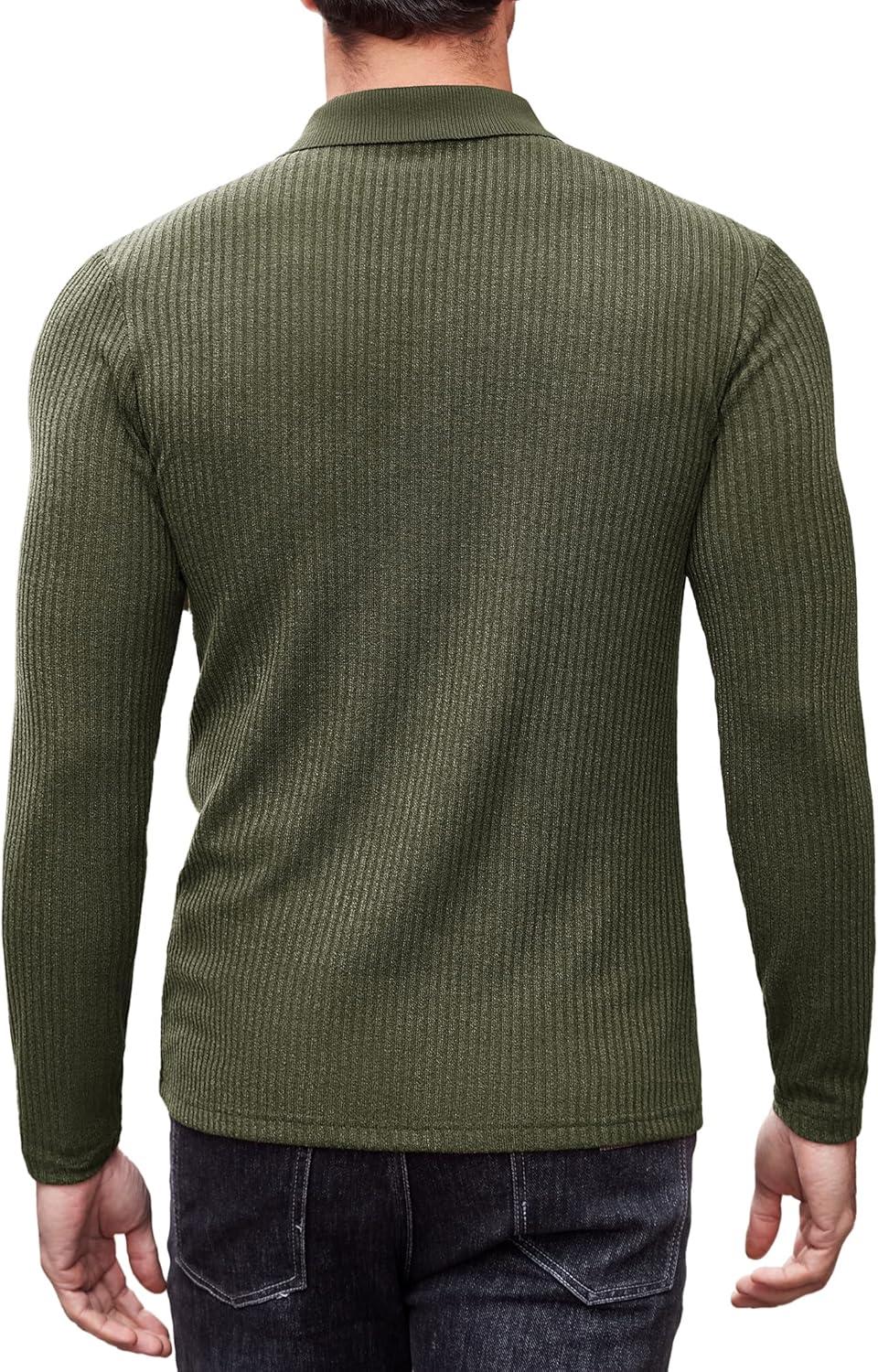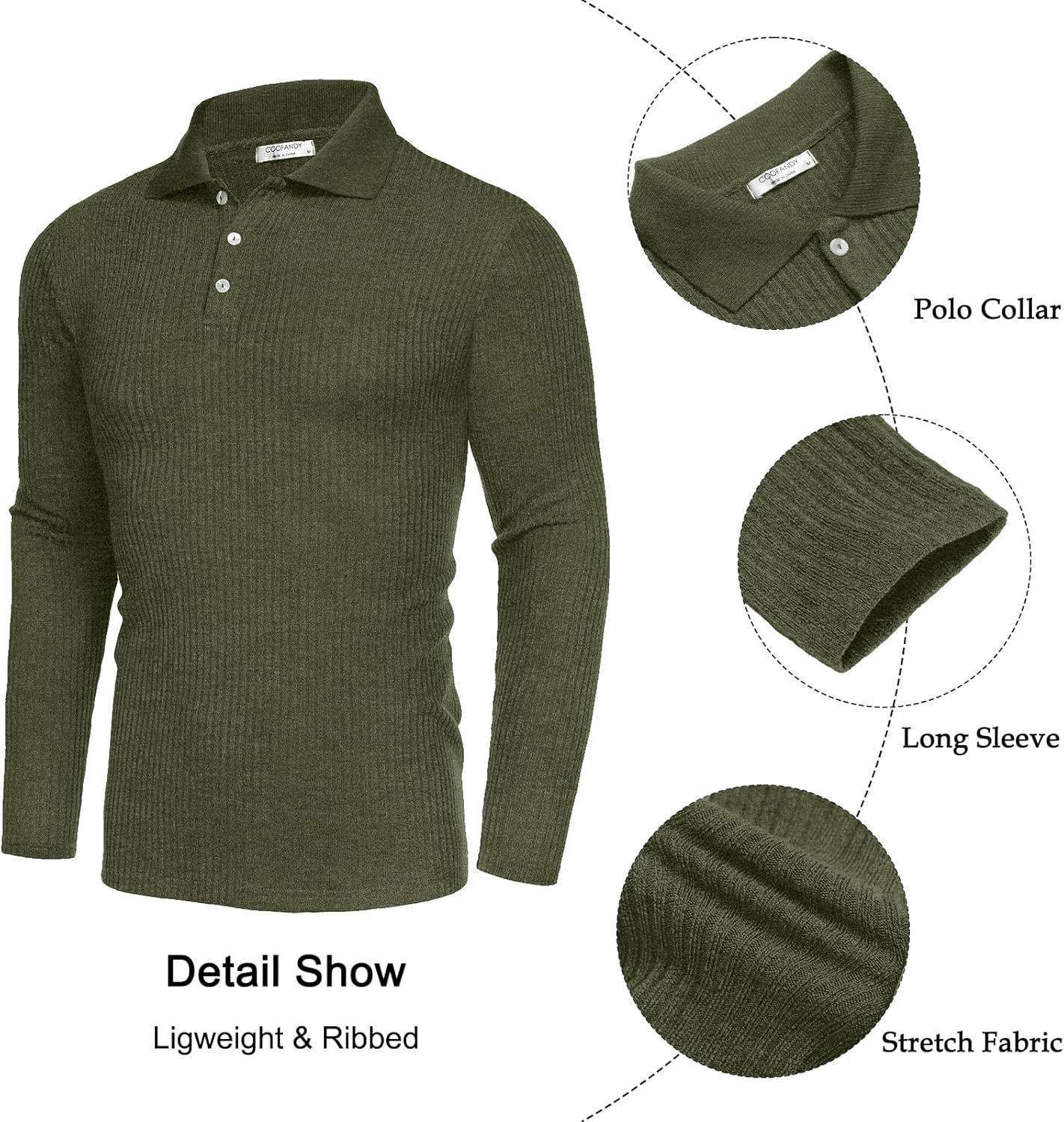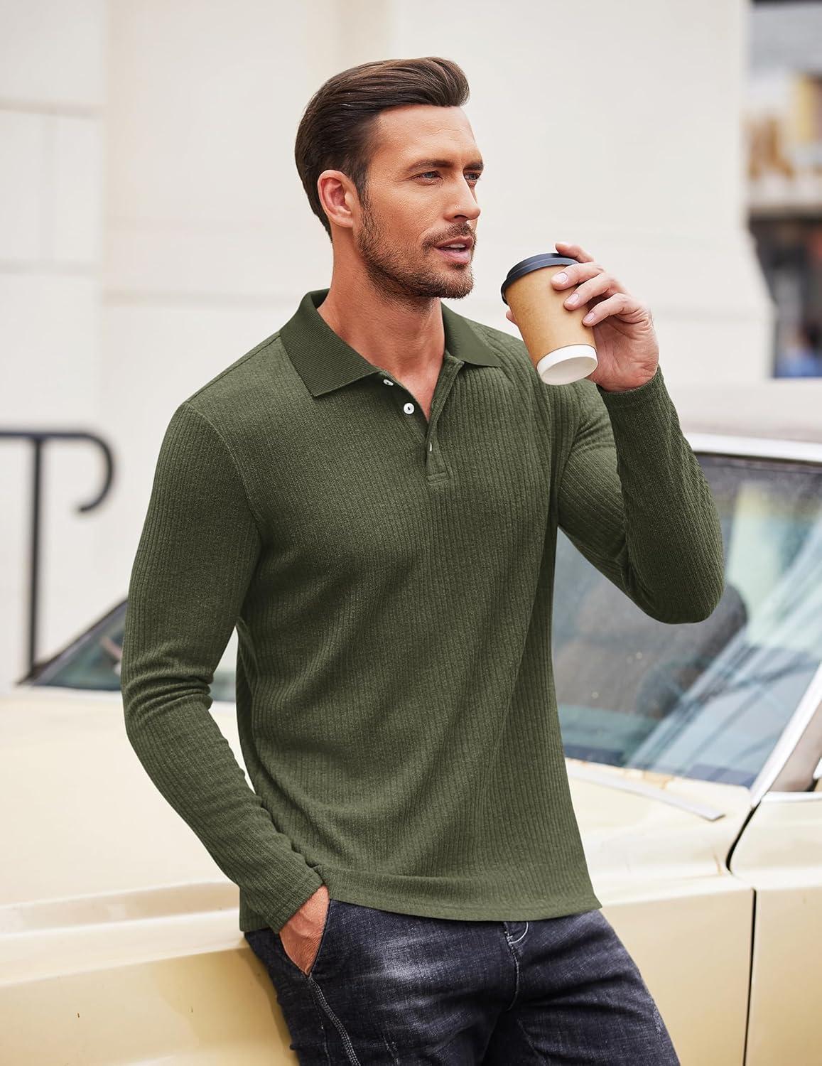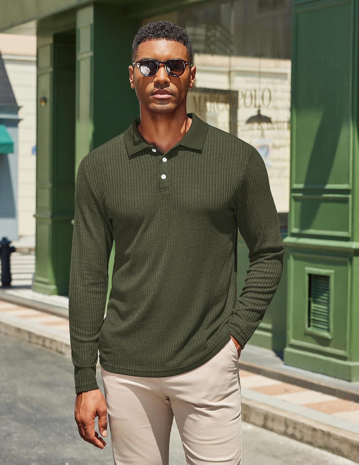 COOFANDY Men's Casual Polo Shirts Long Sleeve Textured Knit Tee Shirt Wrok Tshirts(Army Green)