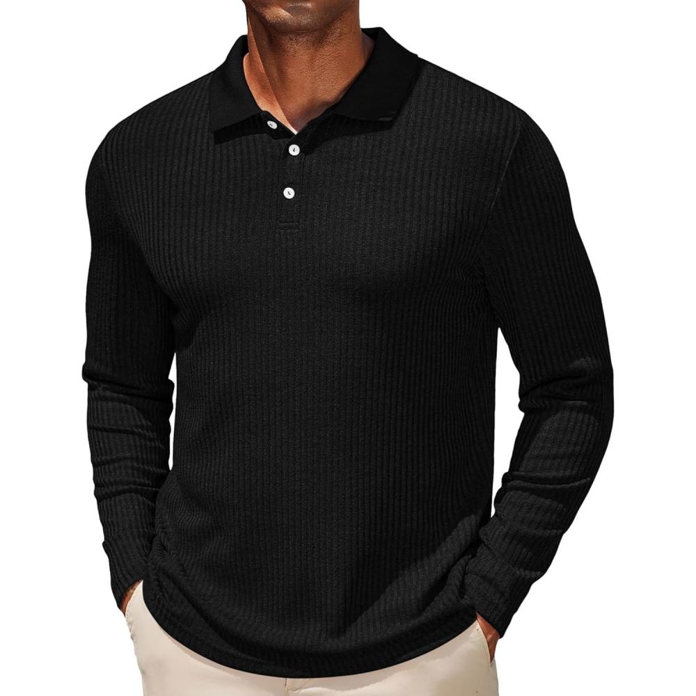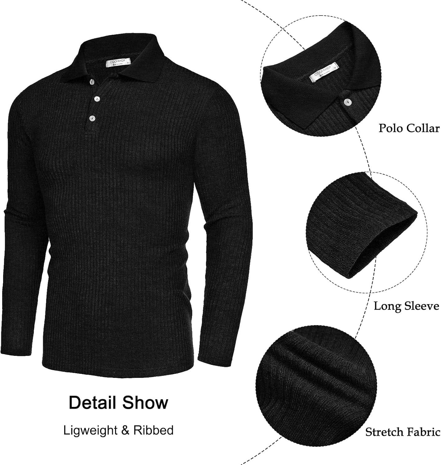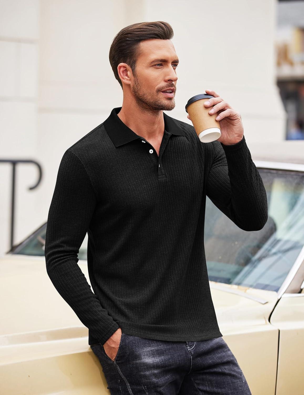 COOFANDY Men's Casual Polo Shirts Long Sleeve Textured Knit Tee Shirt Wrok Tshirts(Black)