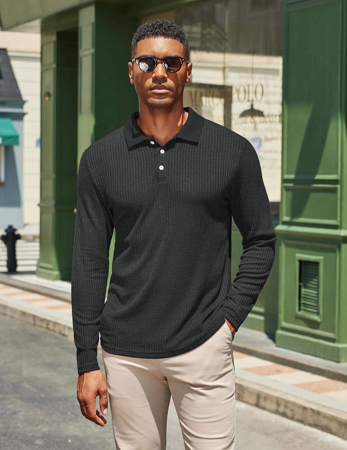 COOFANDY Men’s Casual Polo Shirts Long Sleeve Textured Knit Tee Shirt Wrok Tshirts(Black)