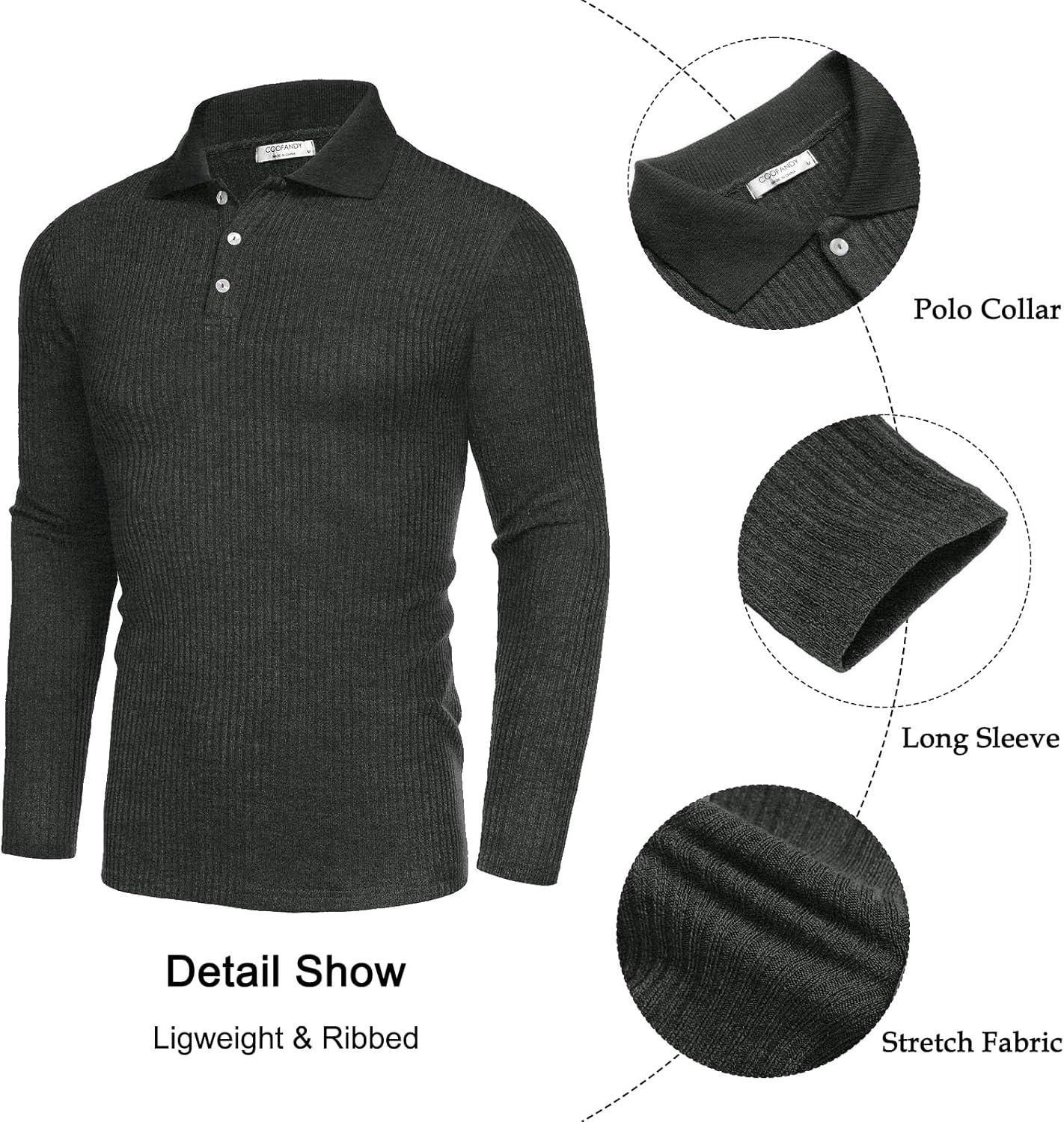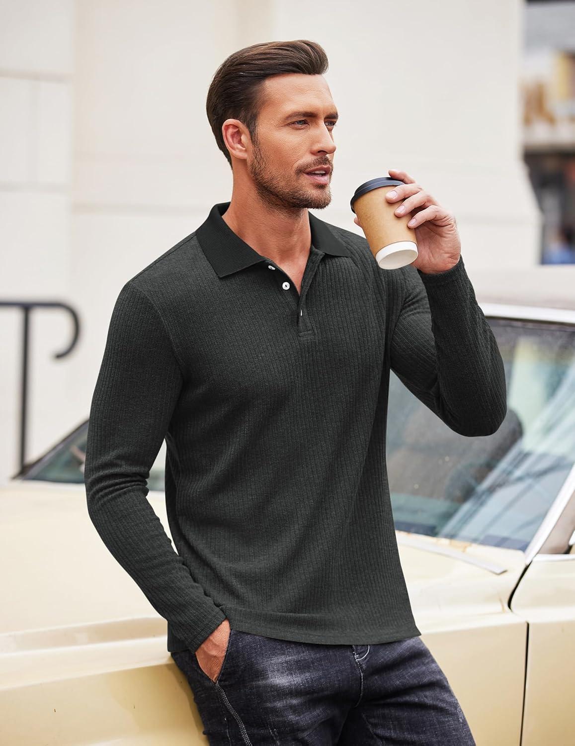 COOFANDY Men's Casual Polo Shirts Long Sleeve Textured Knit Tee Shirt Wrok Tshirts(Charcoal Grey)