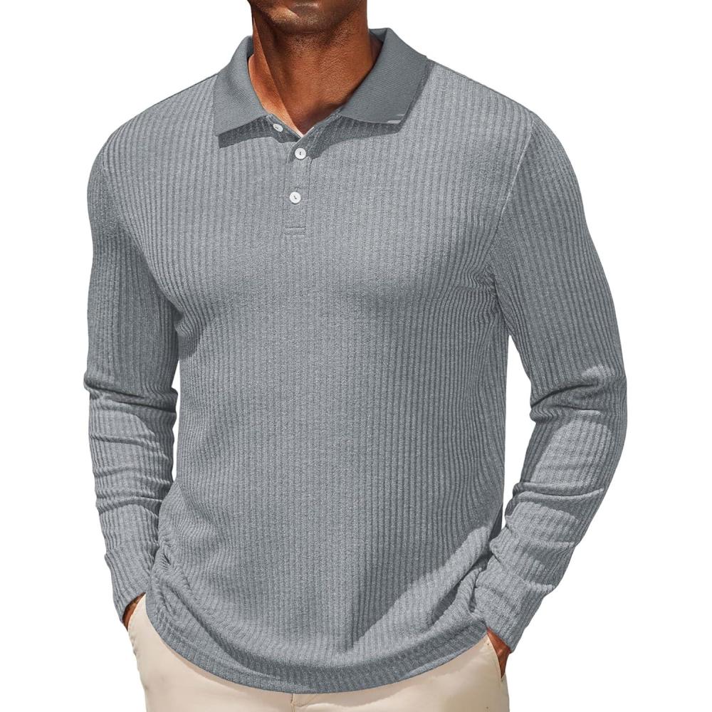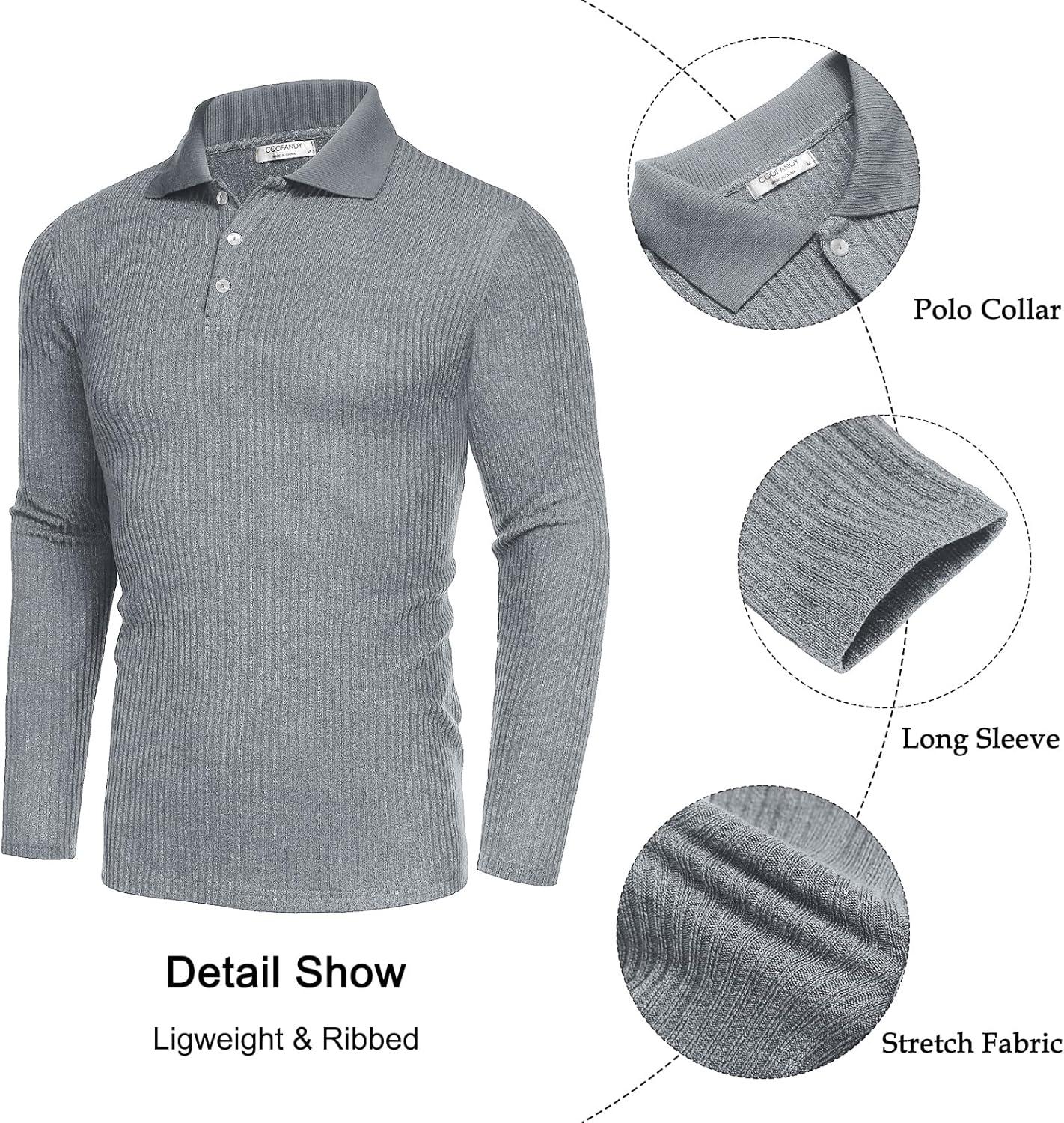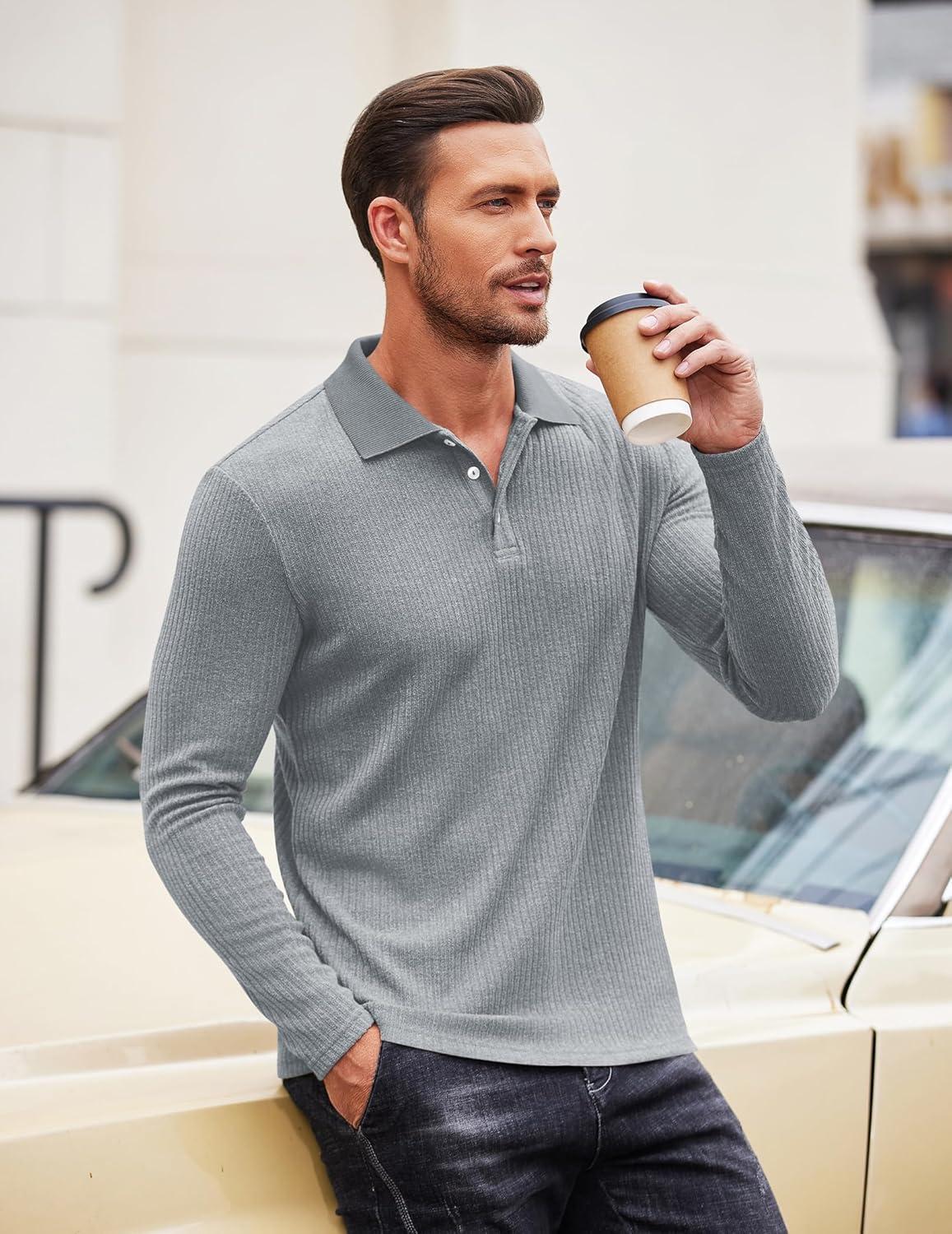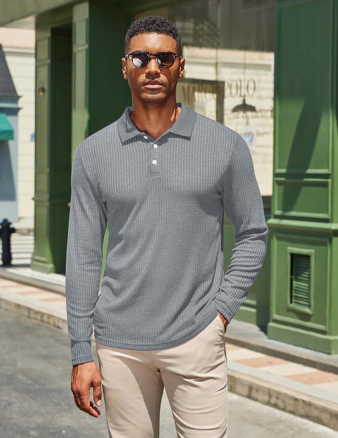 COOFANDY Men's Casual Polo Shirts Long Sleeve Textured Knit Tee Shirt Wrok Tshirts(Grey)