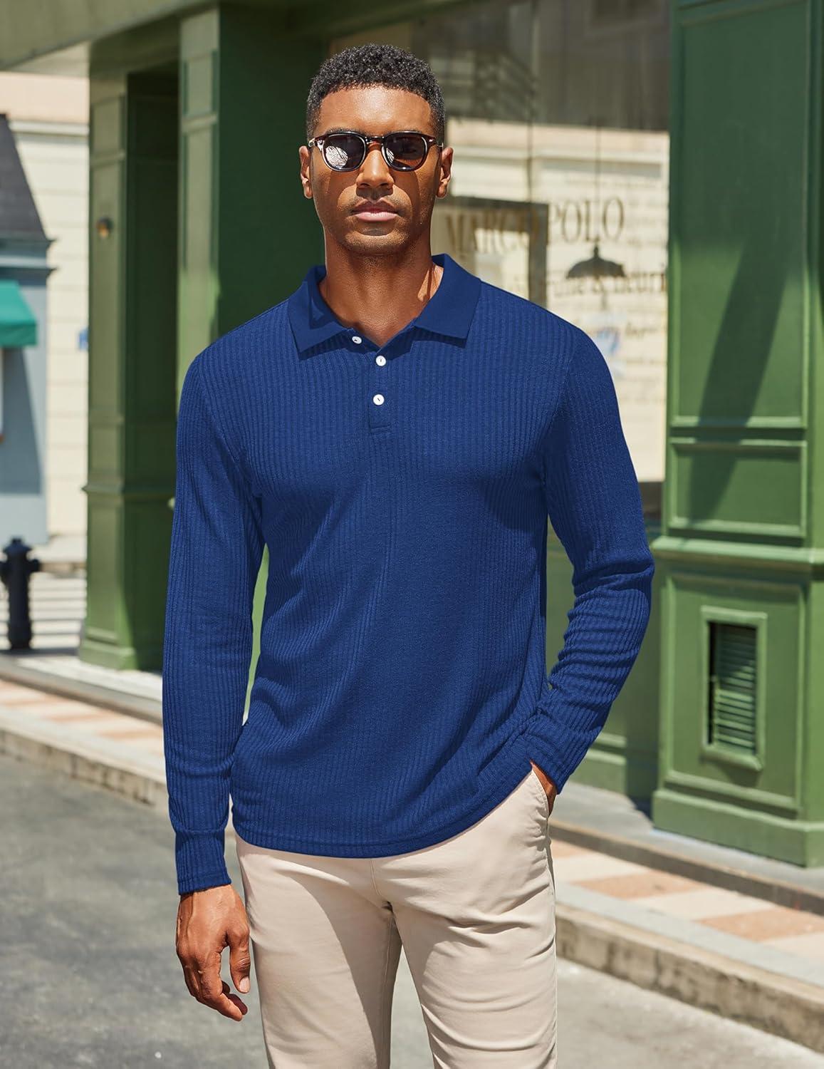 COOFANDY Men's Casual Polo Shirts Long Sleeve Textured Knit Tee Shirt Wrok Tshirts(Royal Blue)