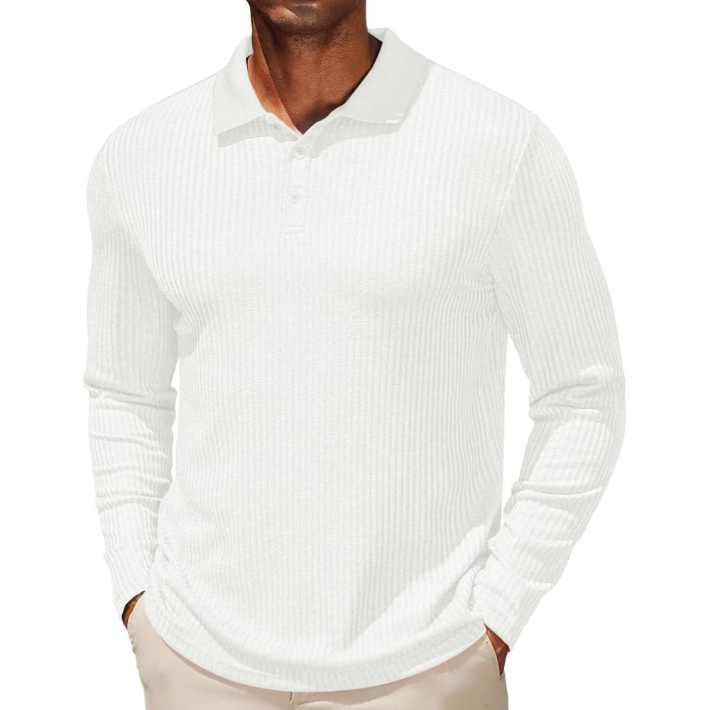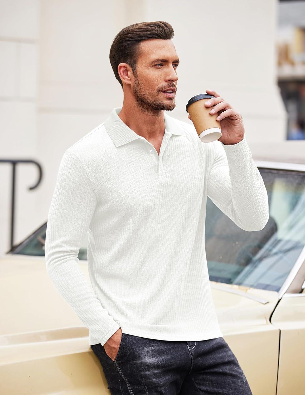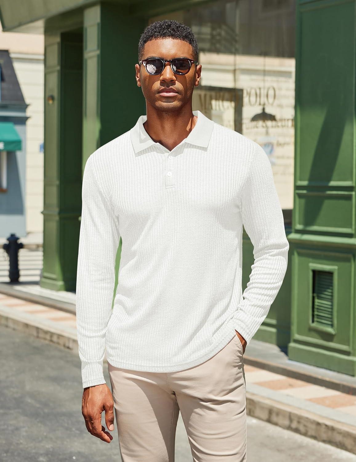 COOFANDY Men's Casual Polo Shirts Long Sleeve Textured Knit Tee Shirt Wrok Tshirts(White)