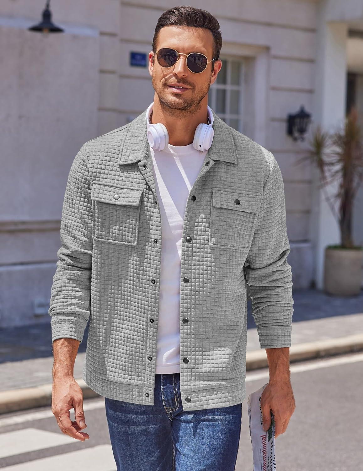 COOFANDY Mens Casual Shirt Jacket Button Down Waffle Jacket Long Sleeve Sweater Jackets Quilted Shacket Overshirt(Light Grey)