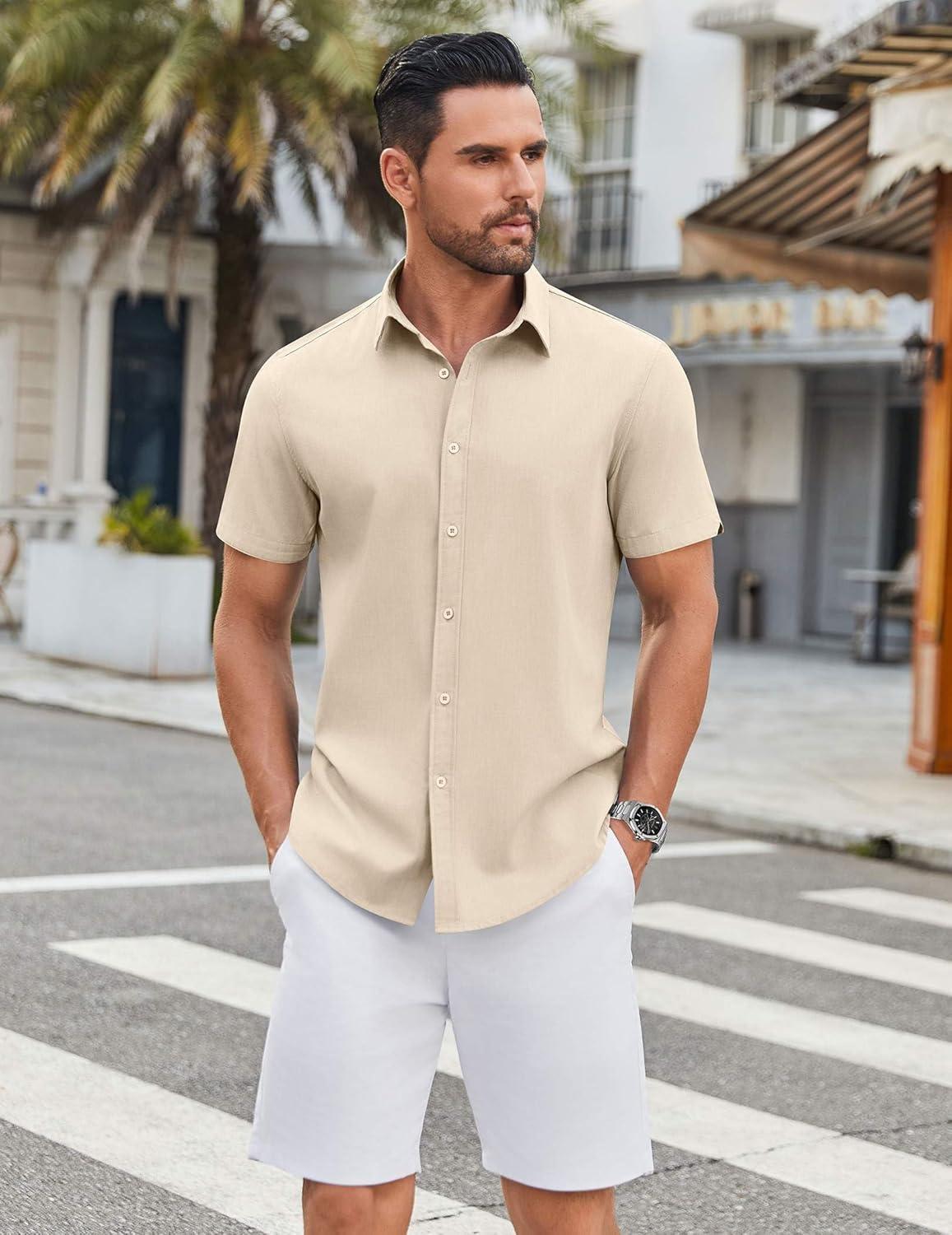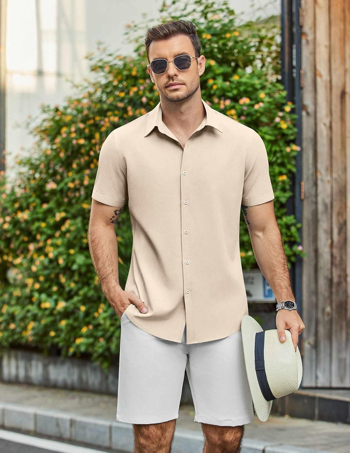 COOFANDY Mens Casual Shirts Short Sleeve Button Down Shirt Wrinkle Free Summer Shirt(Beige)
