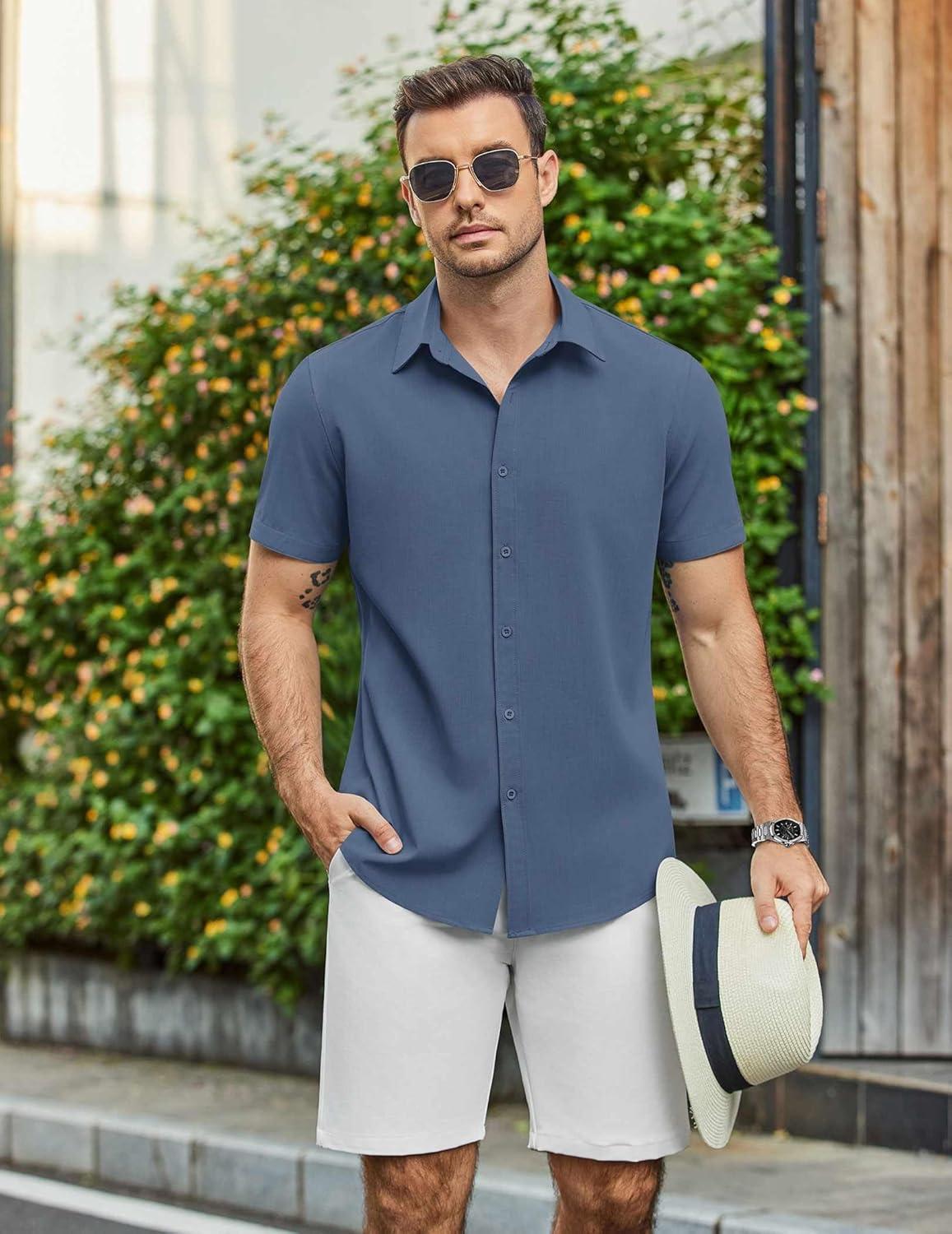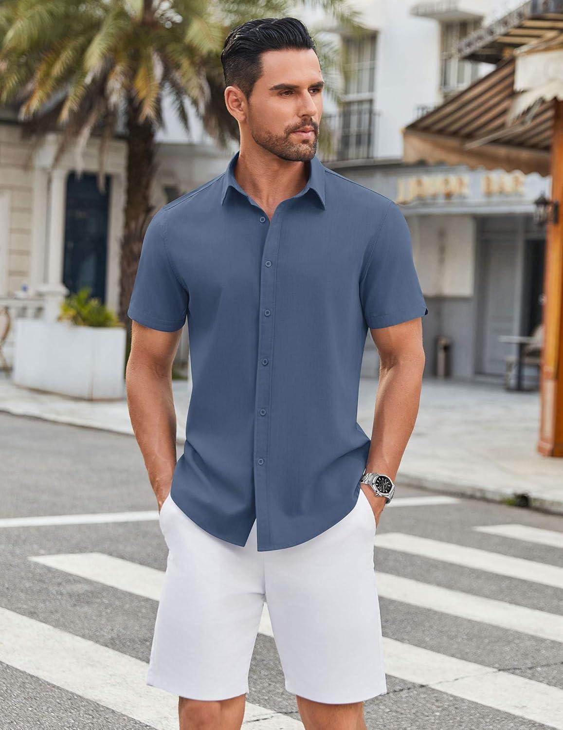 COOFANDY Mens Casual Shirts Short Sleeve Button Down Shirt Wrinkle Free Summer Shirt(Dark Blue)