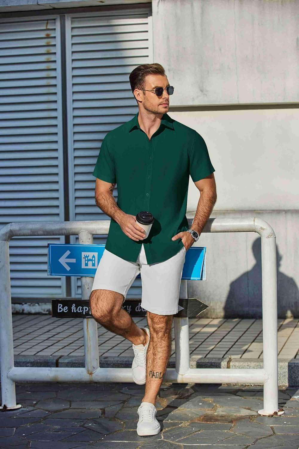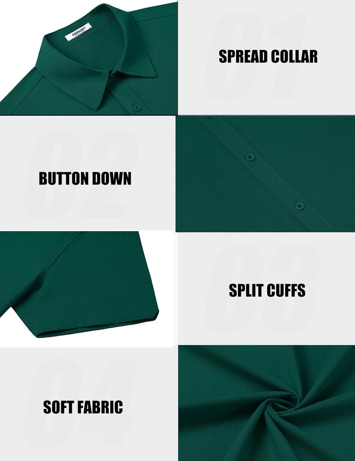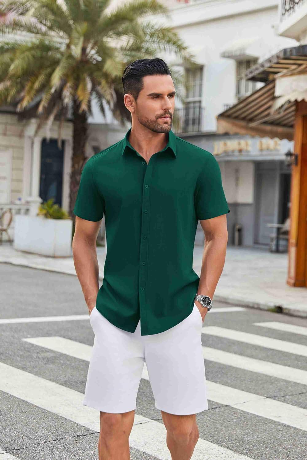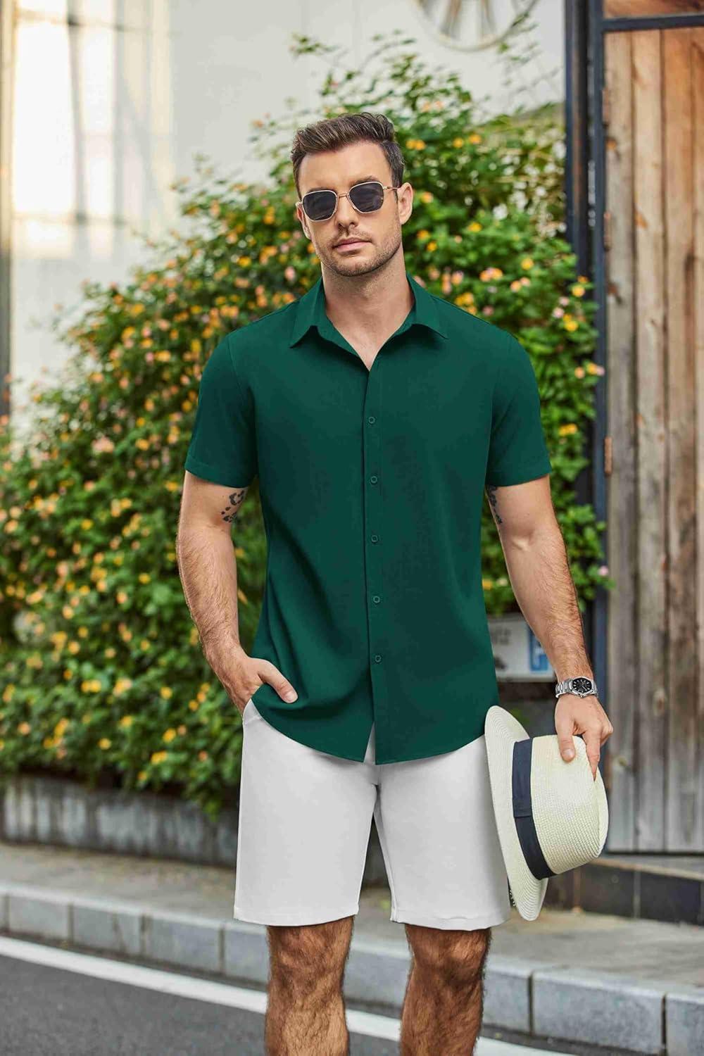imageCOOFANDY Mens Casual Shirts Short Sleeve Button Down Shirt Wrinkle Free Summer ShirtLake Green