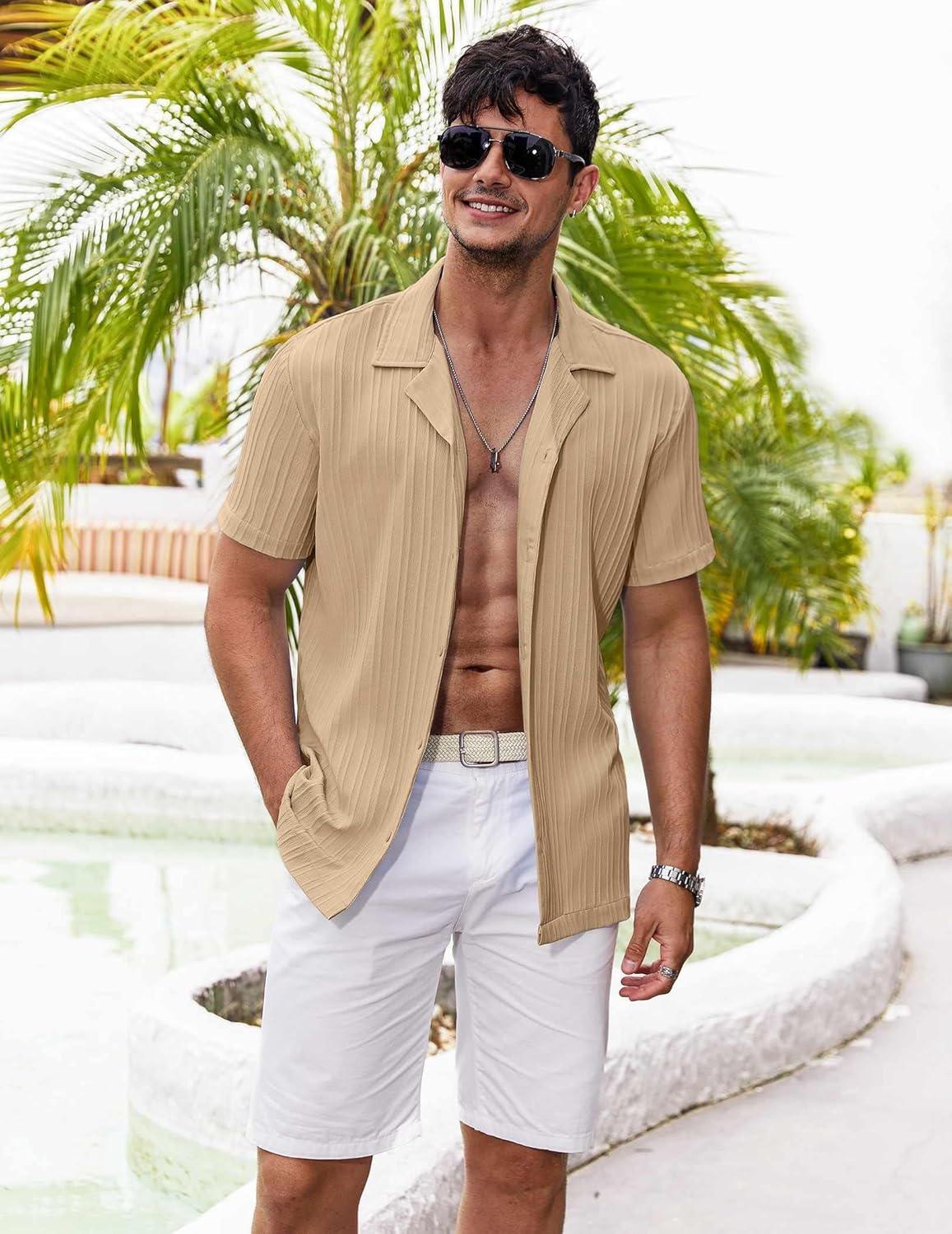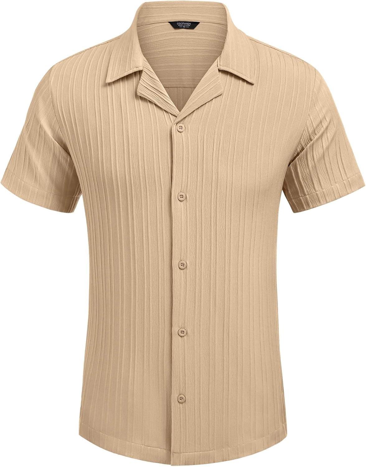 COOFANDY Men’s Casual Shirts Short Sleeve Button Down Shirts Fashion Textured Summer Beach Shirt(Beige)