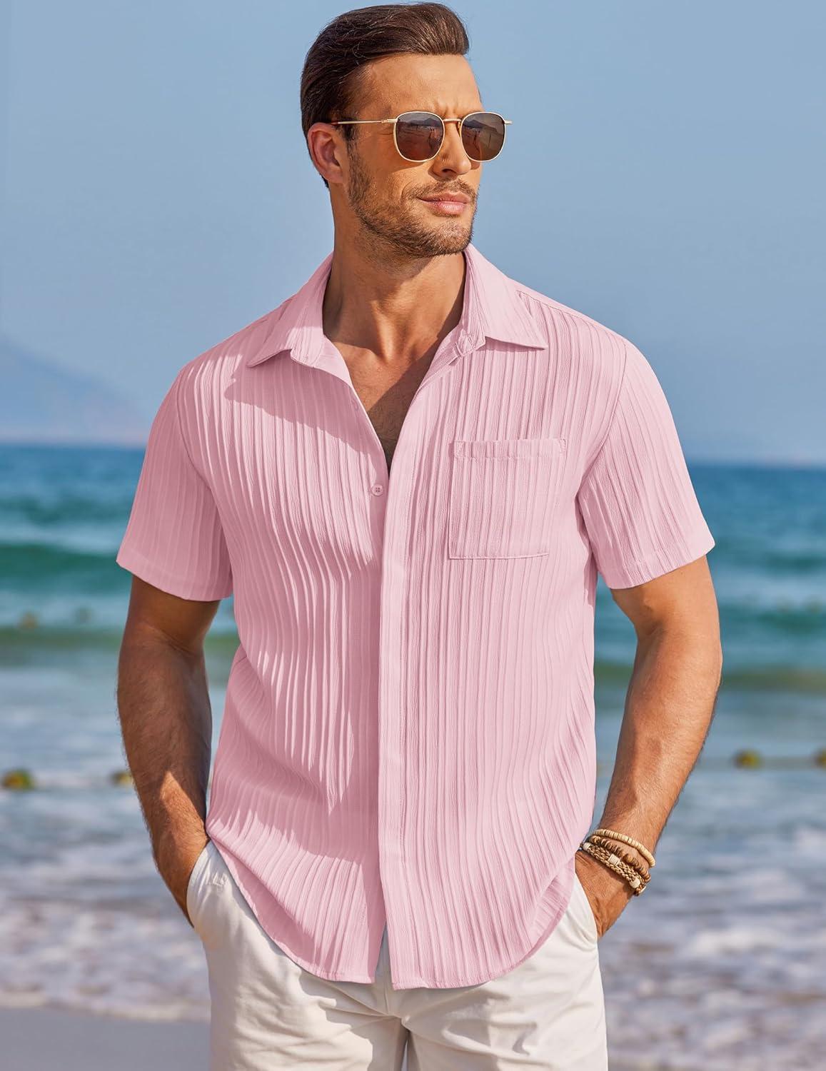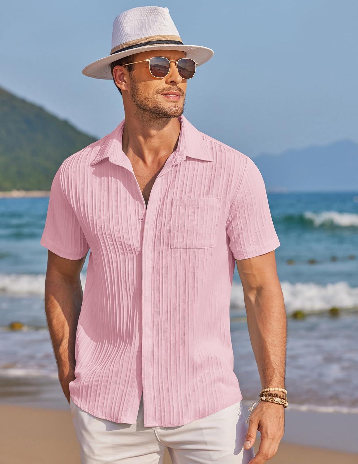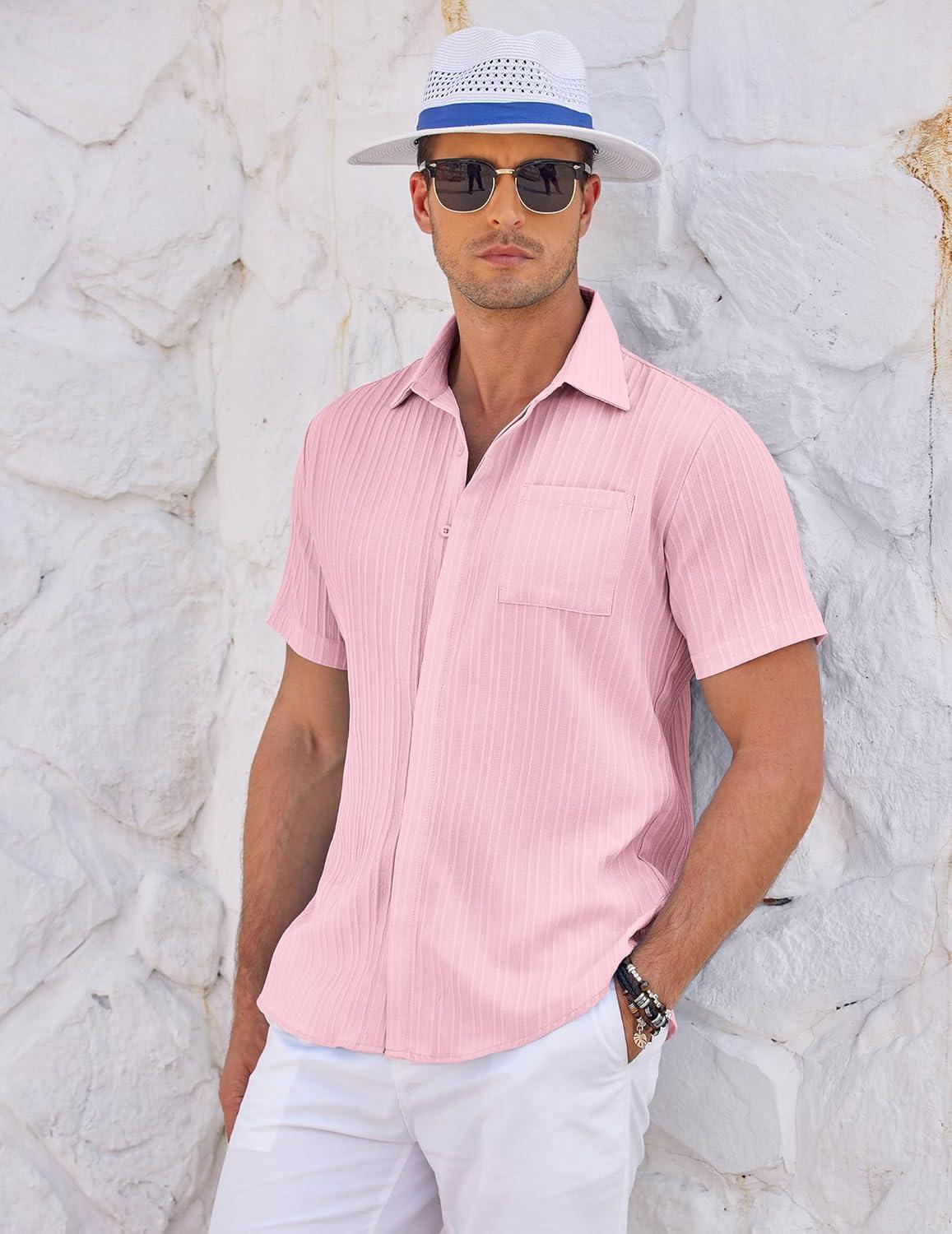 COOFANDY Mens Casual Shirts Short Sleeve Button Down Shirts Fashion Textured Summer Beach Shirt(Orange Pink)