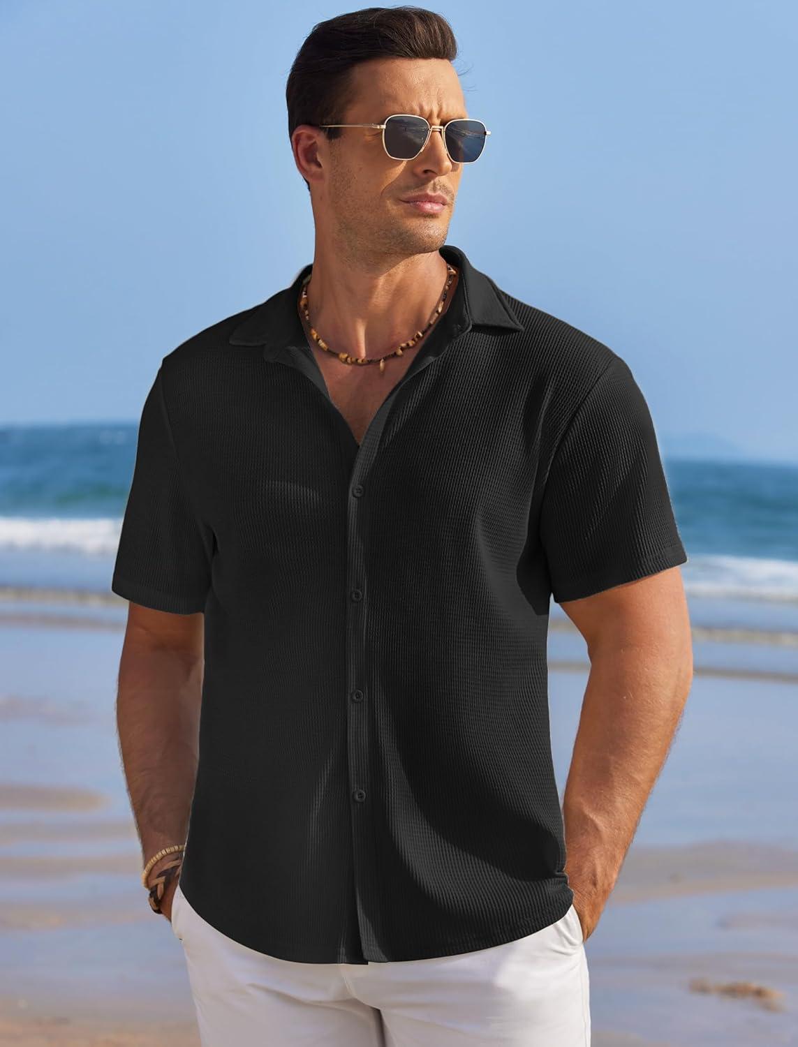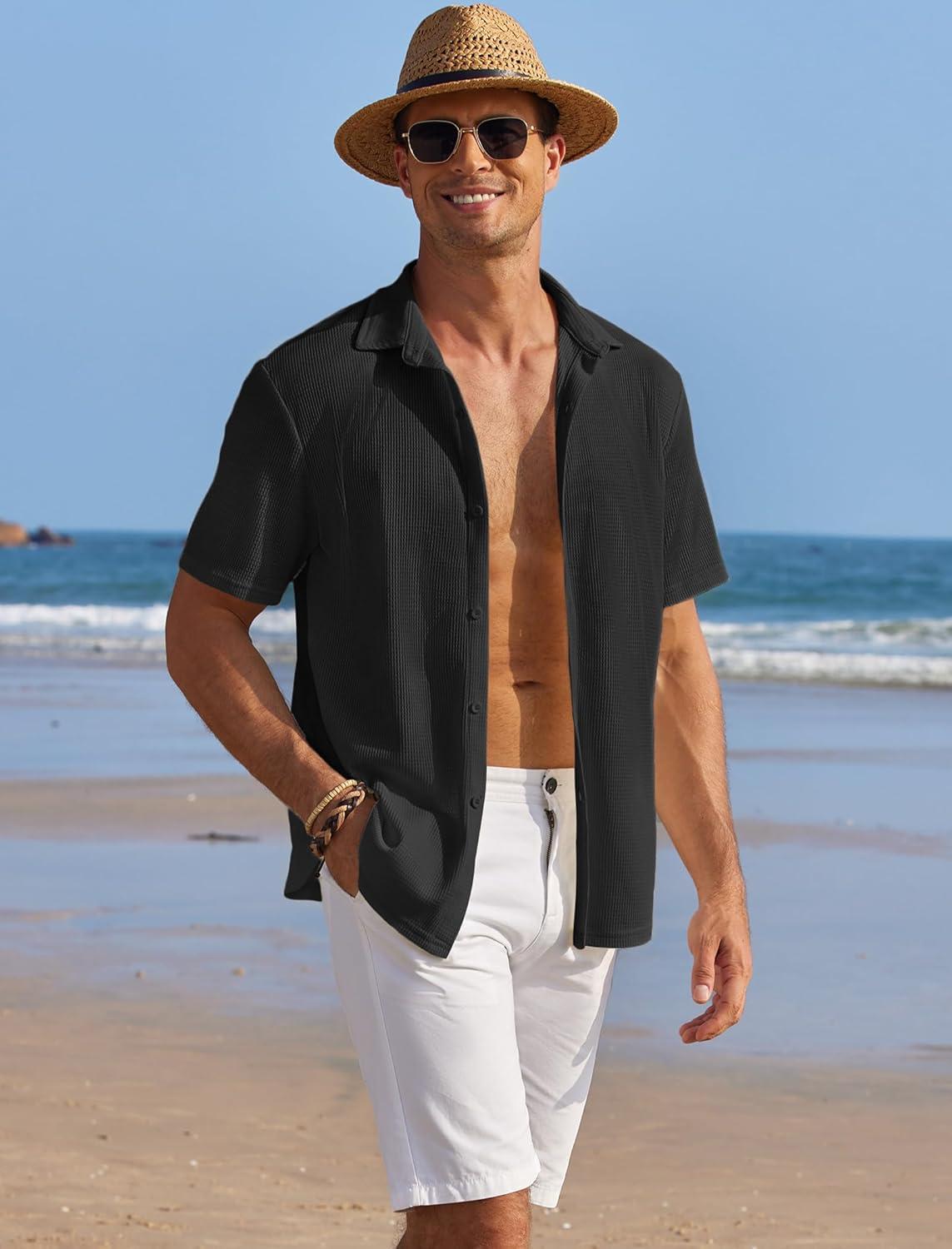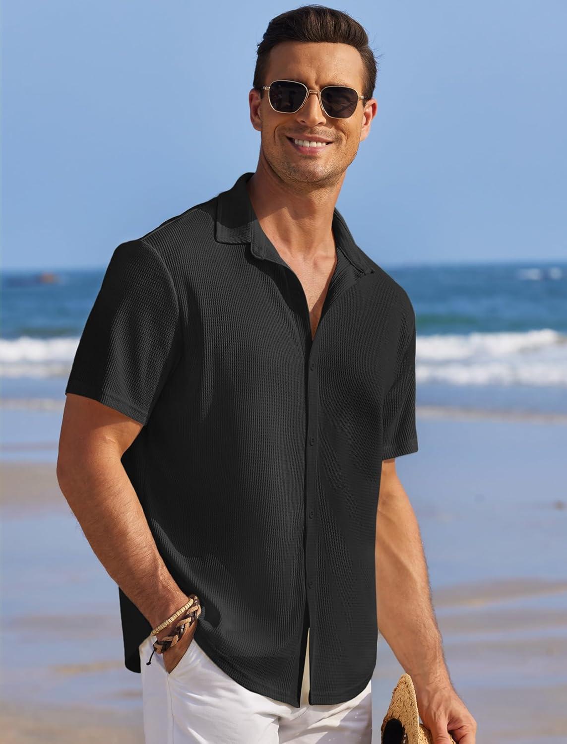 COOFANDY Men's Casual Shirts Short Sleeve Waffle Knit Button Down Shirt Wrinkle Free Summer Beach Tops(Black)