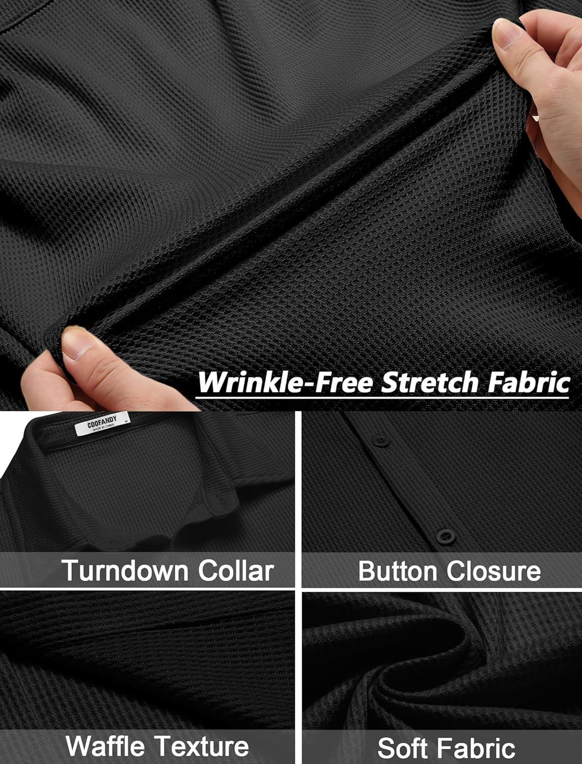 COOFANDY Men’s Casual Shirts Short Sleeve Waffle Knit Button Down Shirt Wrinkle Free Summer Beach Tops(Black)