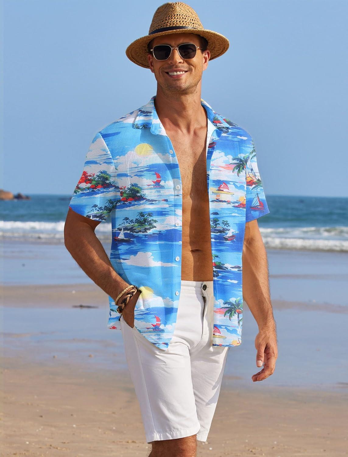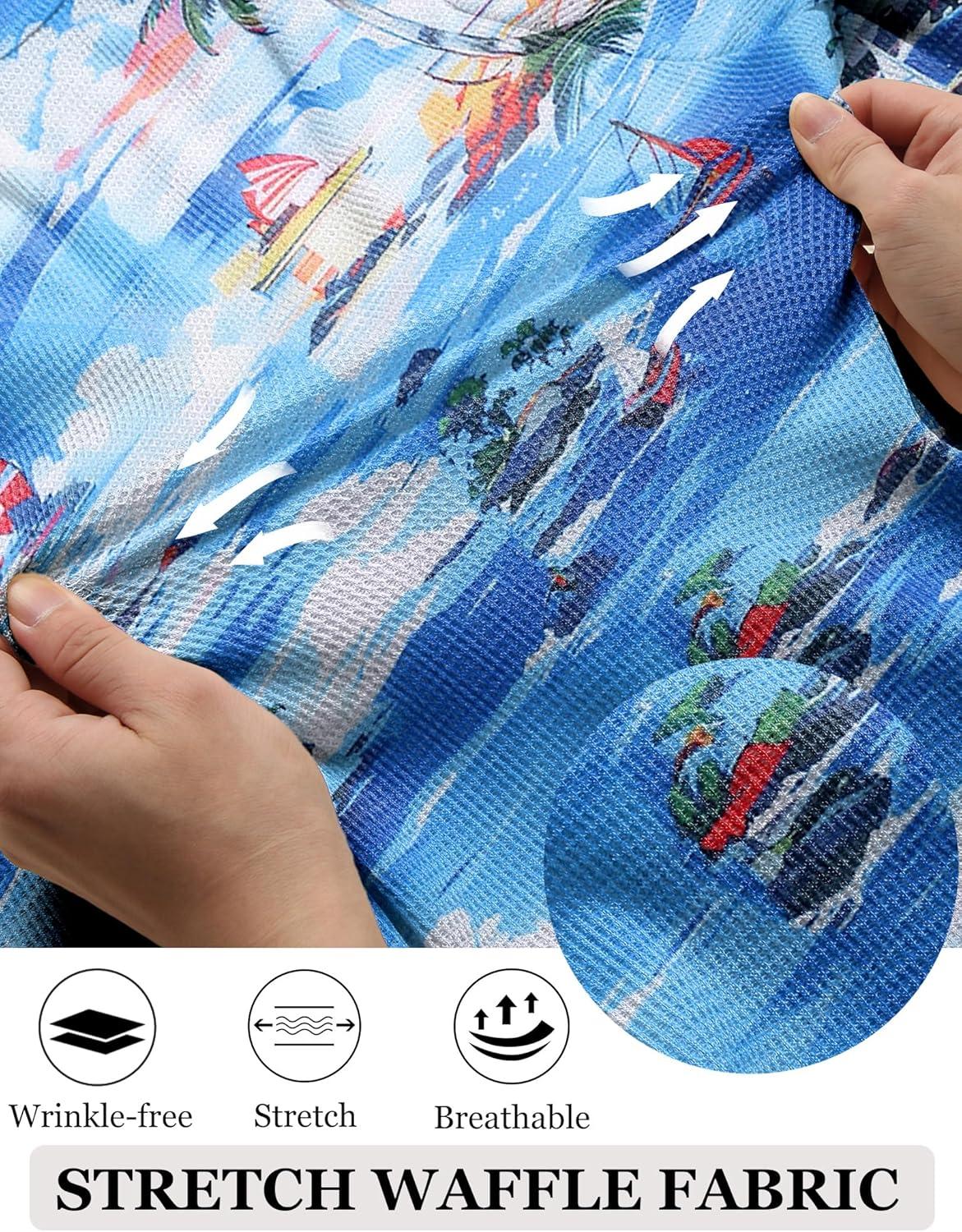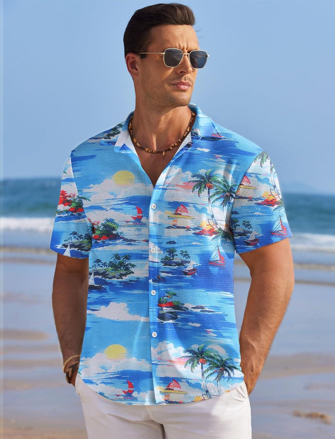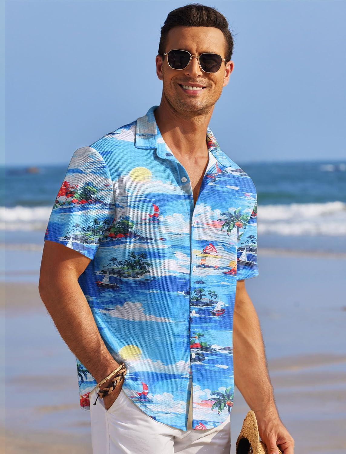 COOFANDY Men’s Casual Shirts Short Sleeve Waffle Knit Button Down Shirt Wrinkle Free Summer Beach Tops(Coconut Palm Blue)