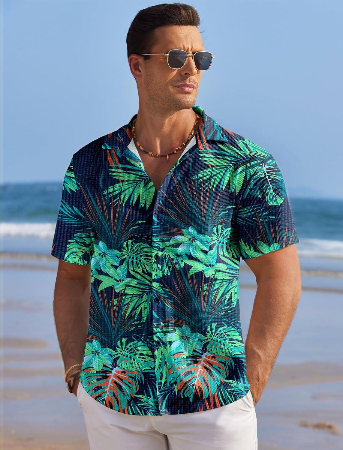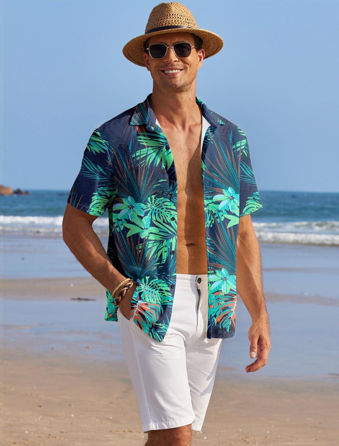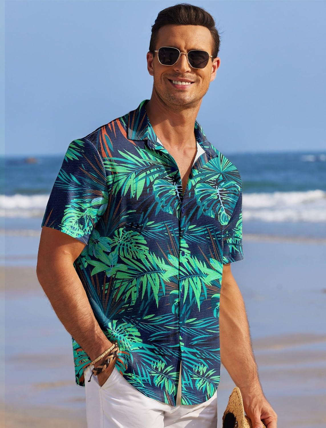 COOFANDY Men’s Casual Shirts Short Sleeve Waffle Knit Button Down Shirt Wrinkle Free Summer Beach Tops(Green Leaves)