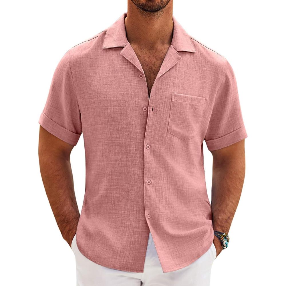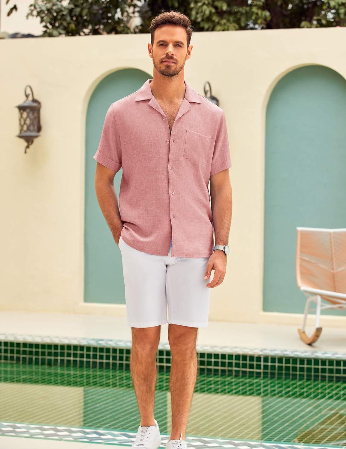 Get up to 60% off on COOFANDY Mens Casual Short Sleeve Button Down Shirts Cuban Linen Textured Shirt Summer Beach Wear(Pink) styles during our winter sale event.
