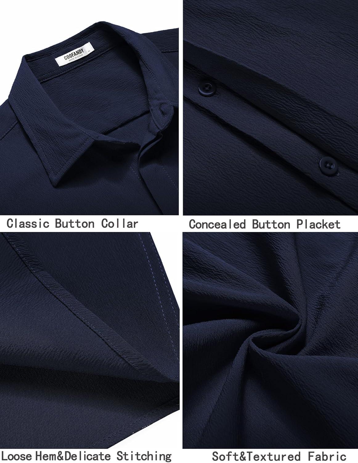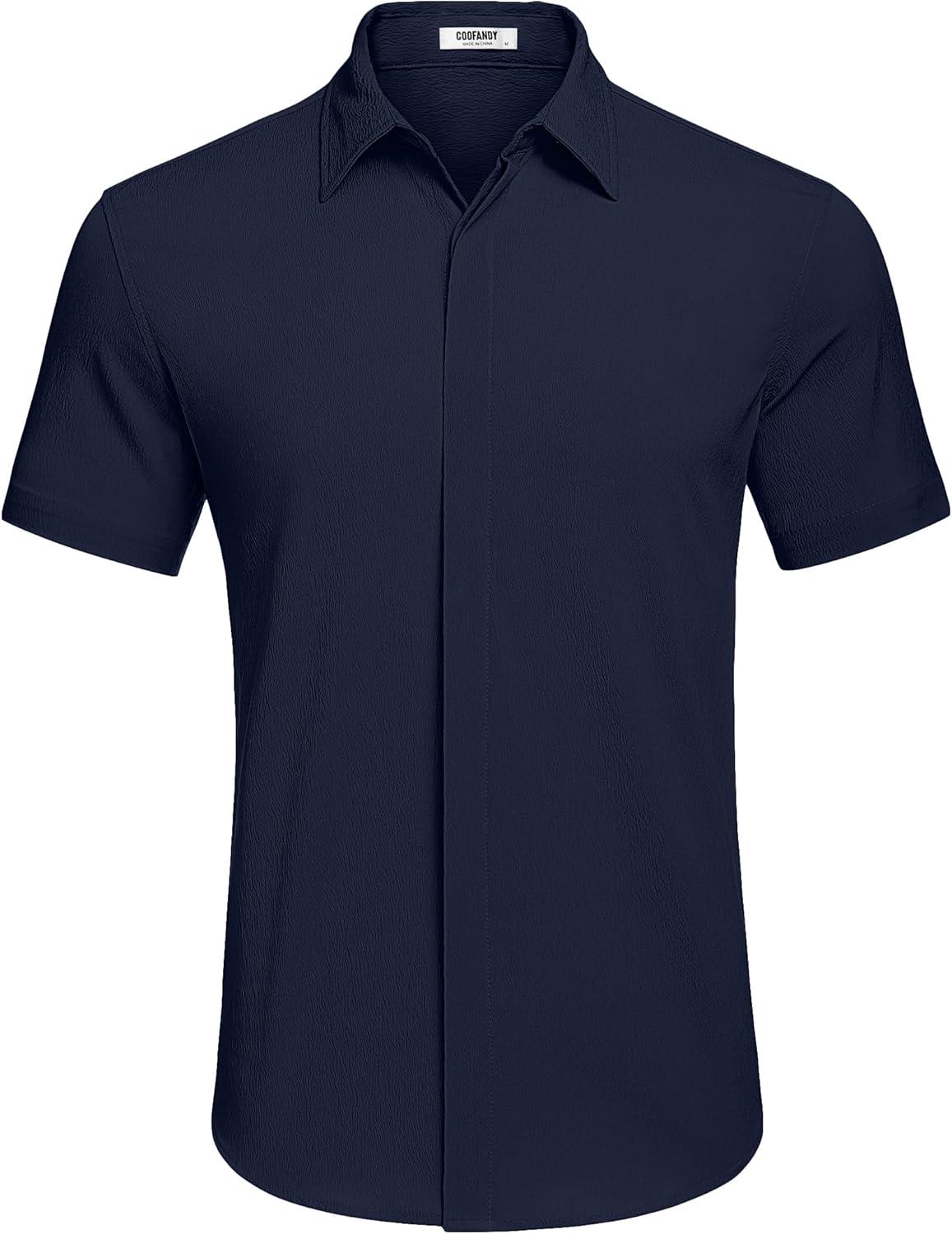 COOFANDY Men’s Casual Short Sleeve Button Down Summer Beach Shirt Lightweight Textured Wrinkle Free Stretch Shirts(Medieval Blue)
