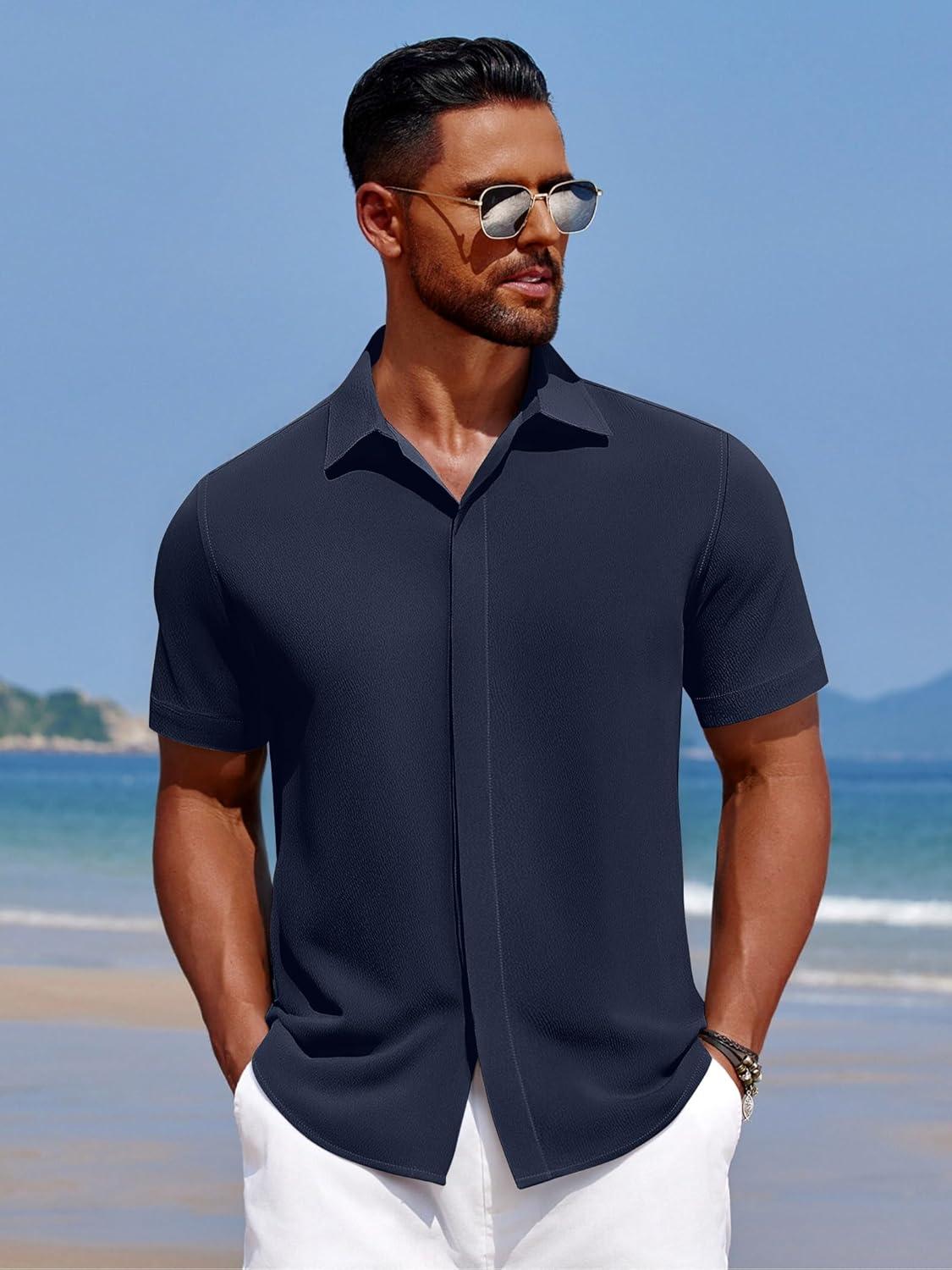 COOFANDY Men's Casual Short Sleeve Button Down Summer Beach Shirt Lightweight Textured Wrinkle Free Stretch Shirts(Medieval Blue)
